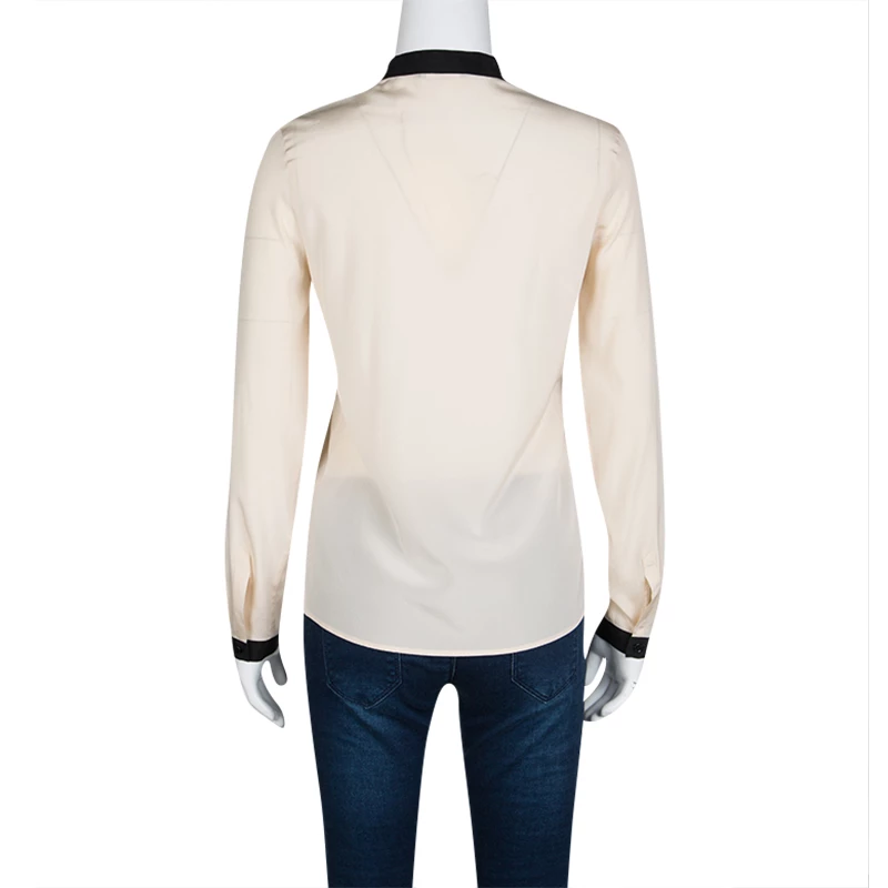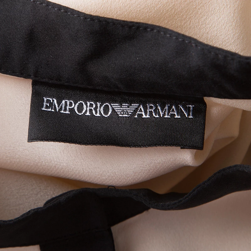 Give your formal attires a refreshing update with this Emporio Armani blouse. Tailored in a luxe beige silk fabric, this blouse comes with contrast trim detailing along the button front, neckline and cuffs. Pair with tailored separates and complete the look with nude pumps.