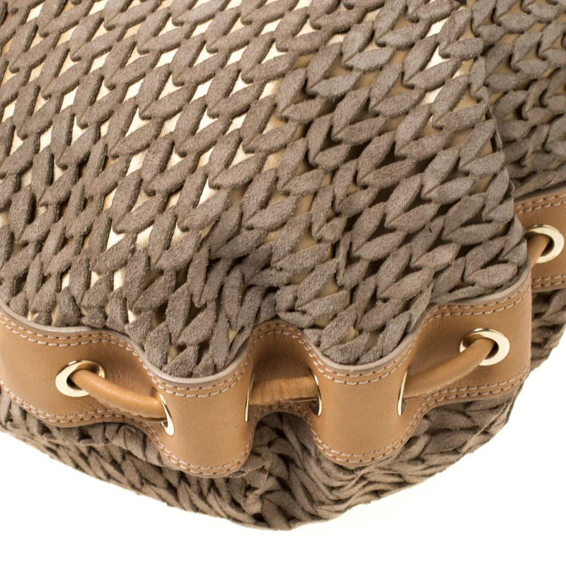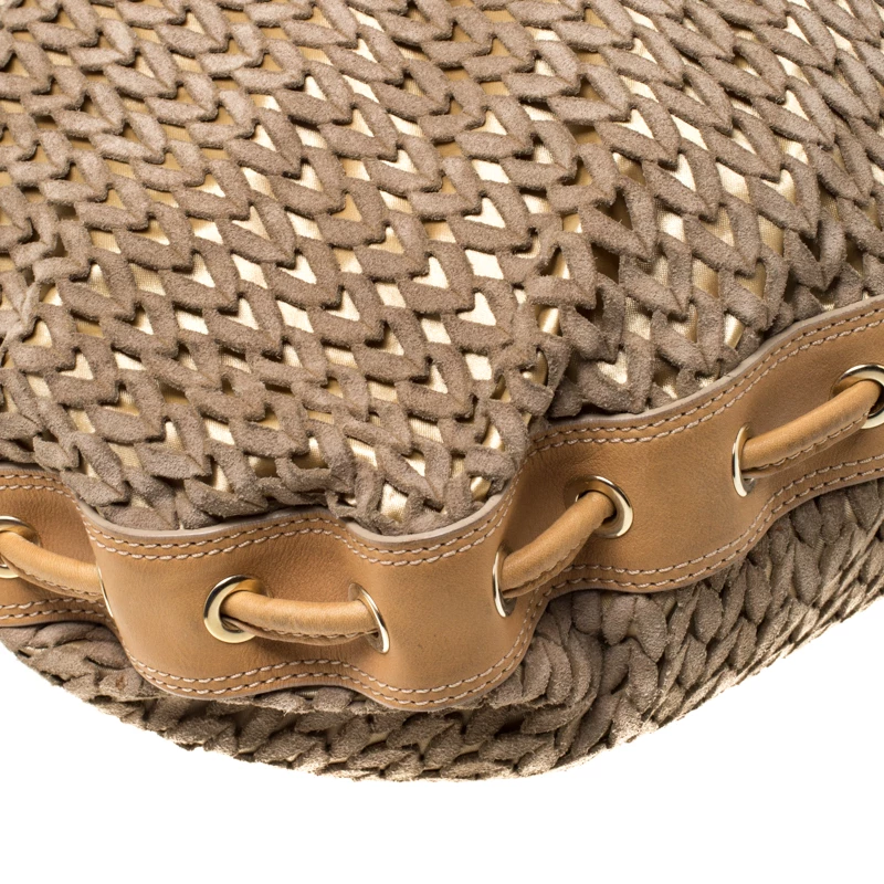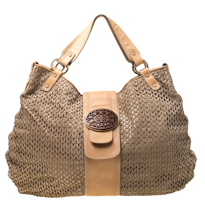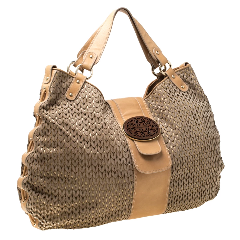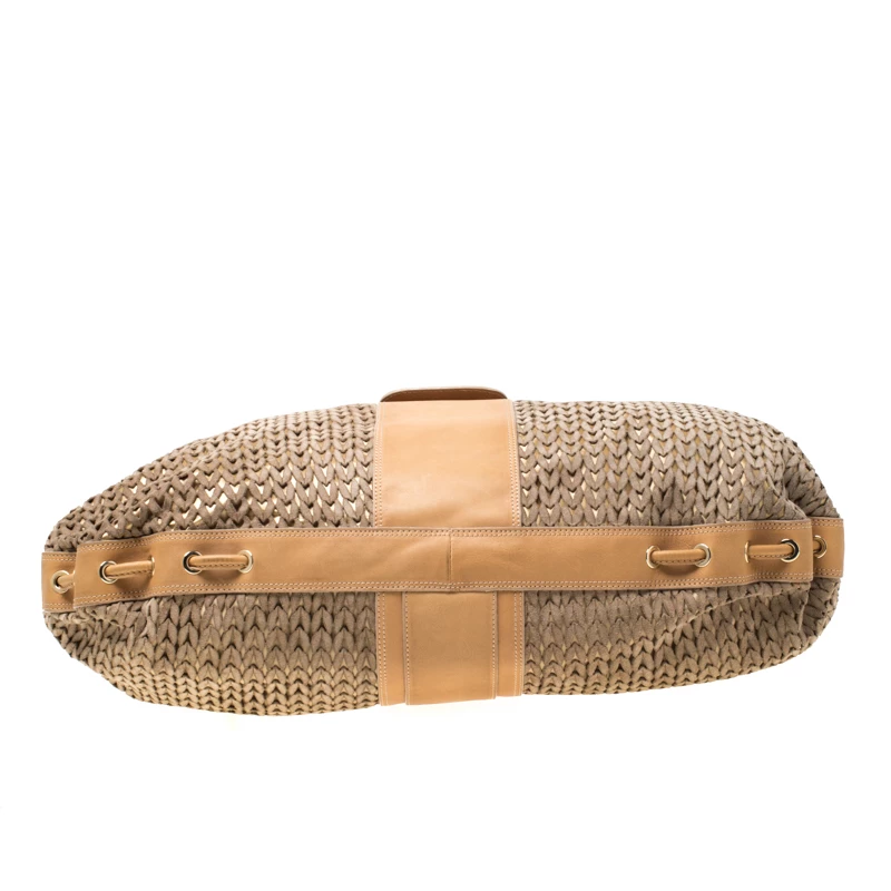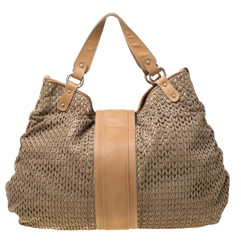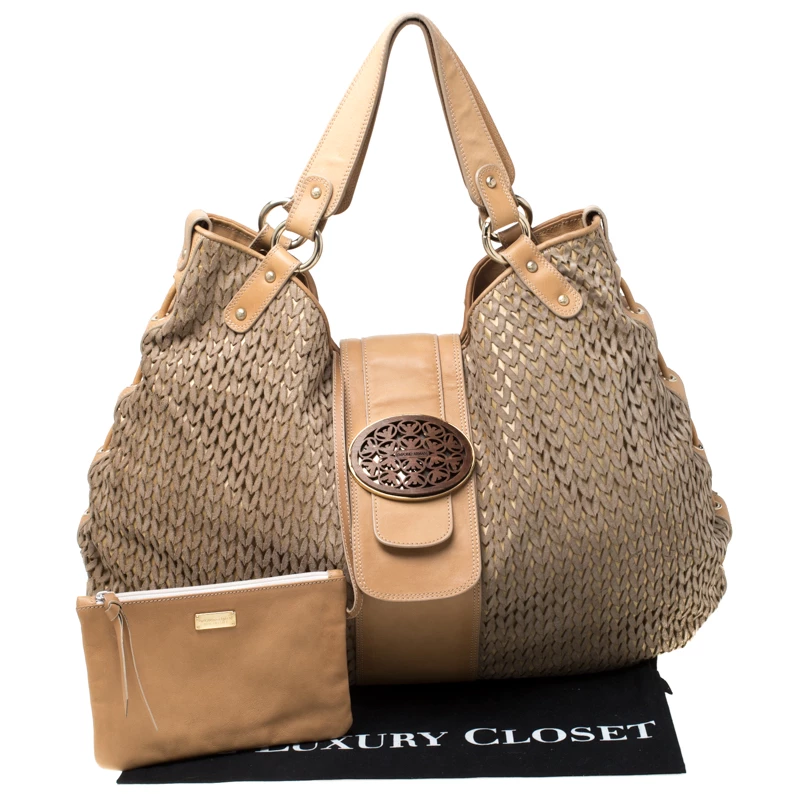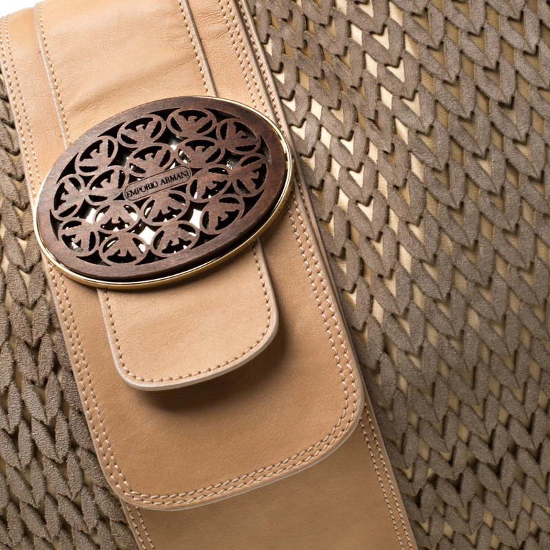 This Emporio Armani creation is chic with a great and unique design. The suede body with laser-cut design creates the one-of-a-kind exterior, coupled with brown leather trims and flat handles. It comes with a spacious interior, lined with nylon and gold-tone hardware. This bag is perfect for an elegant look.