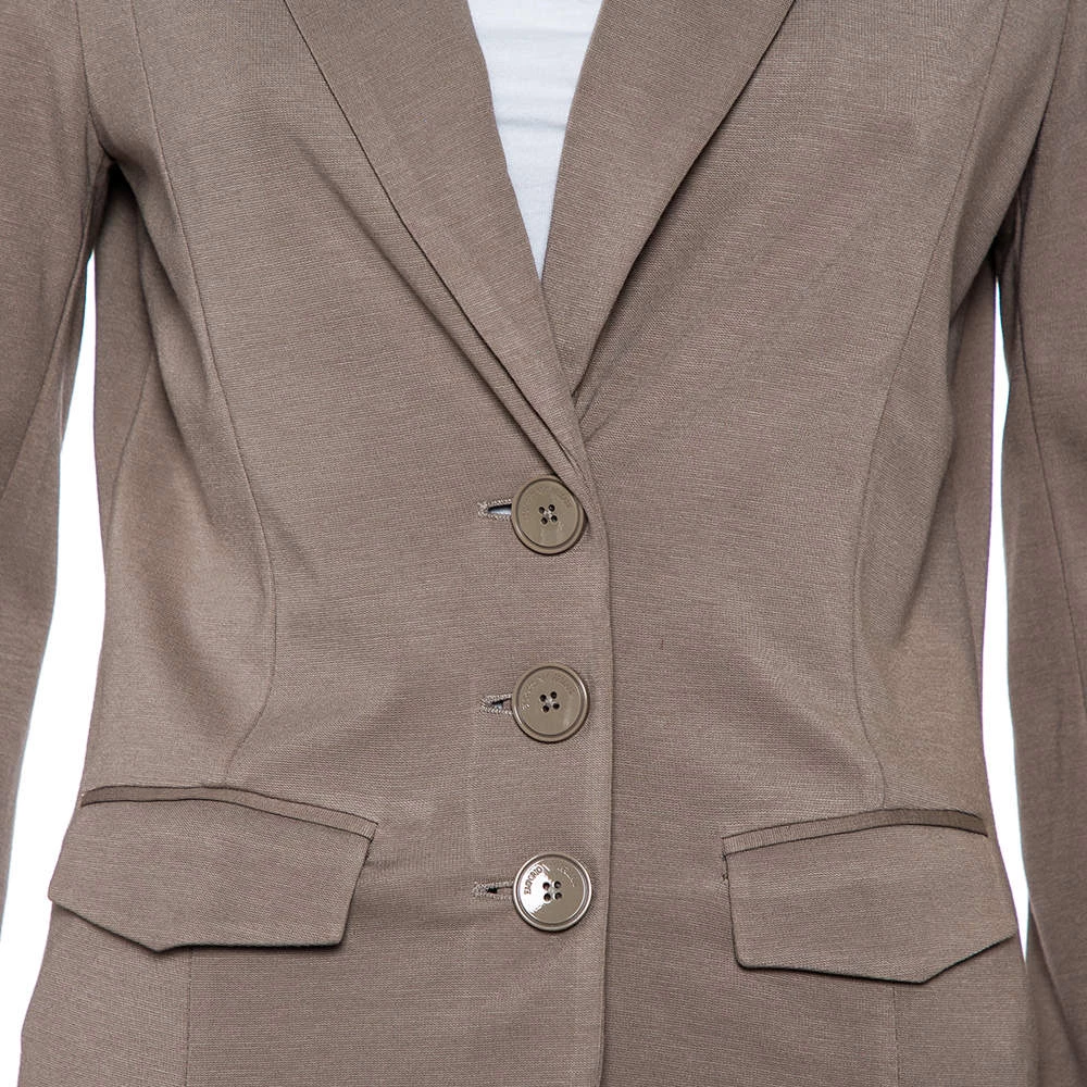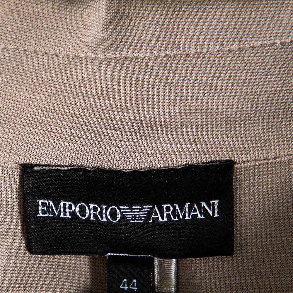 A blazer that can effortlessly enhance your formal outfits, this Emporio Armani blazer is cut to a slim-fitting structure featuring a smart design. Equipped with long sleeves and notched lapels, it is adorned with a beige hue, making the piece both understated and impressive.