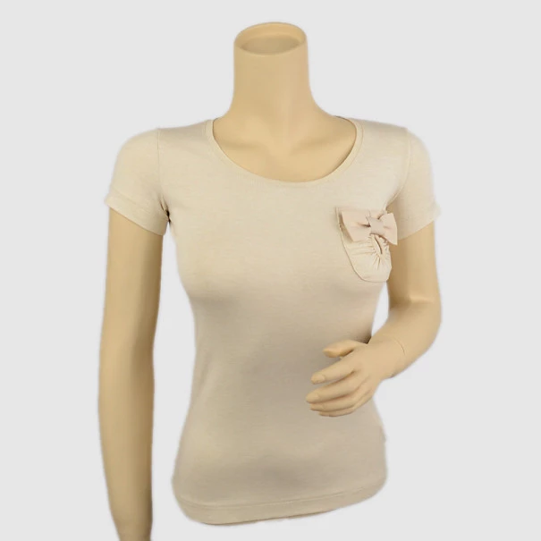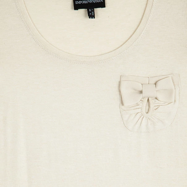 This gorgeous Emporio Armani Beige Pocket T-Shirt with Bow is the ultimate casual top. It comes with a round neck and short sleeves. This top is accented with a front pocket with a beige bow.