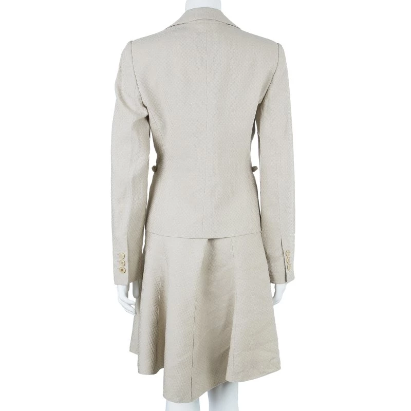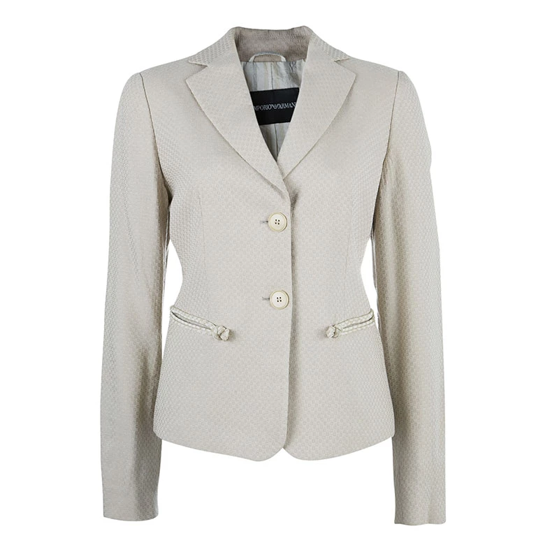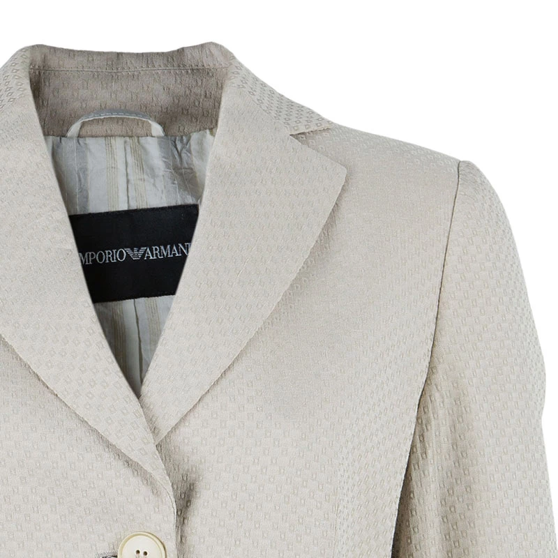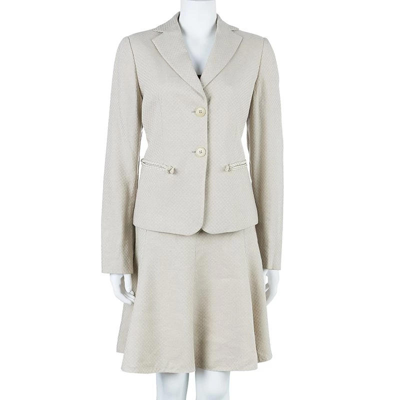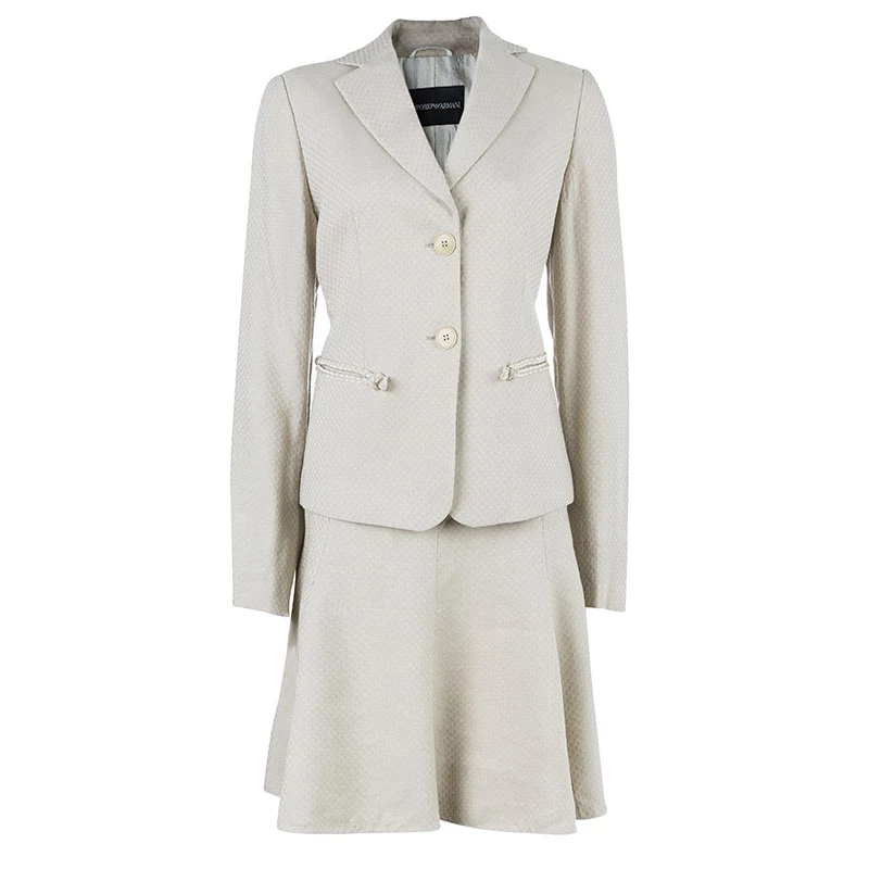 Simple and elegant is this Emporio Armani Skirt Suit. Crafted from polyester-viscose blend, it features a jacket and a knee-length skirt. The jacket has button down closure, a lapel collar, two front pockets and long sleeves. Its knee-length skirt features an A-line cut and has a concealed zip closure and subtle pleated detailing for a shapely fit.