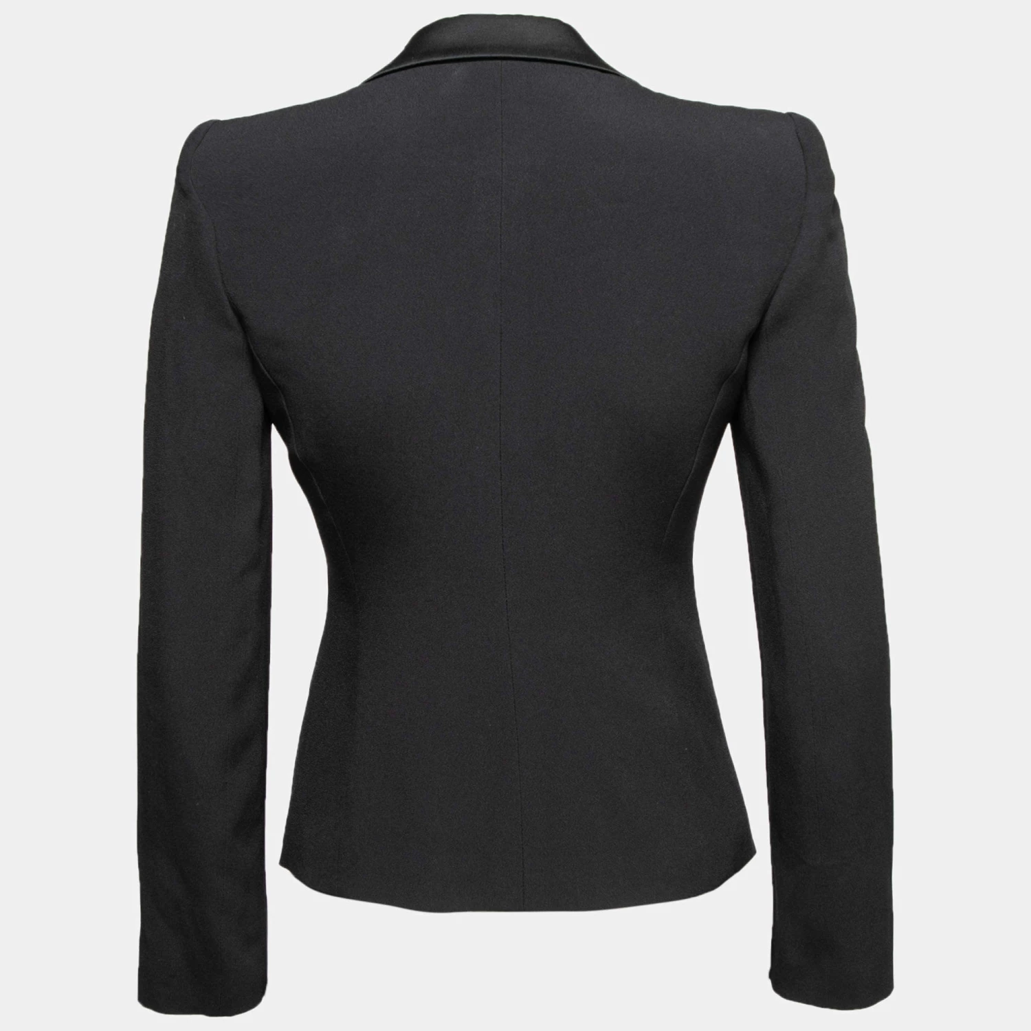 Sport a polished and suave look as you wear this smart blazer from Emporio Armani. It is cut from black acetate fabric, with a side bow elevating its beauty. It displays buttoned closures and long sleeves. Pair this blazer with your formal wear to enhance your appearance and elevate your style.