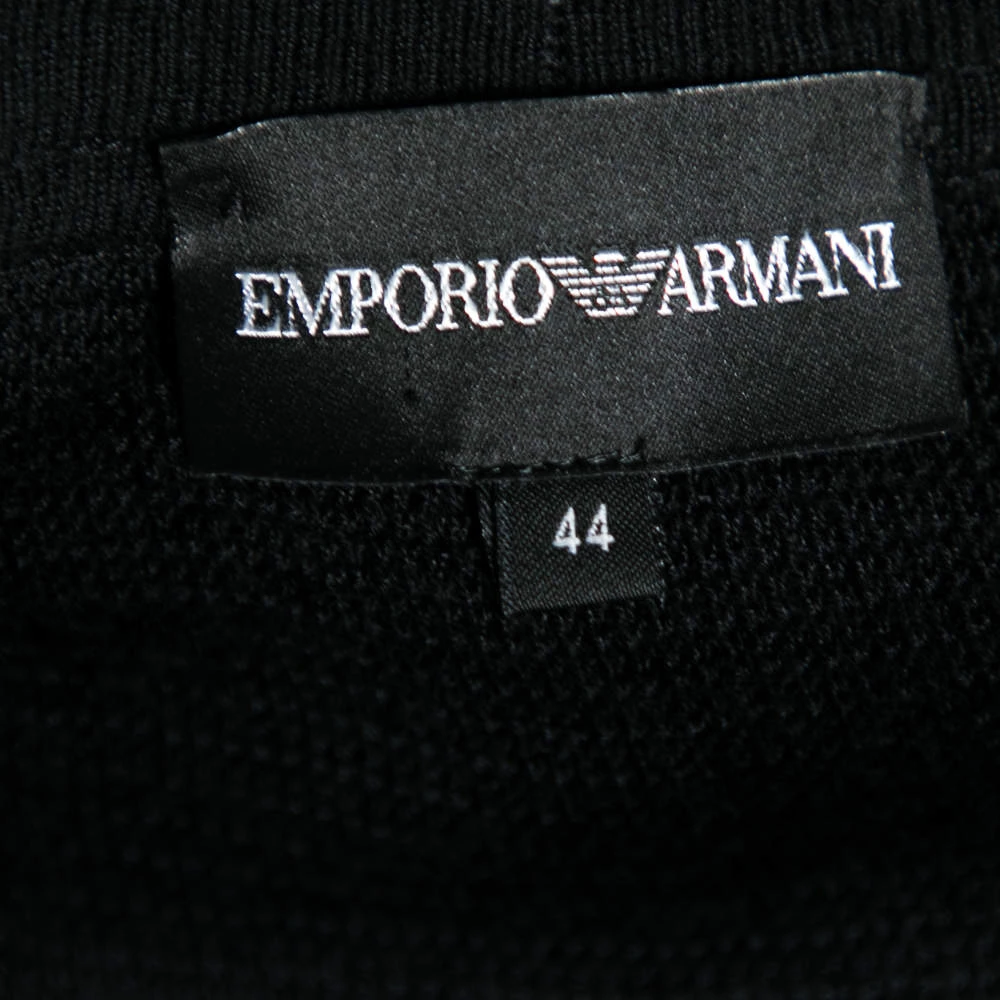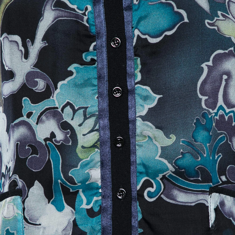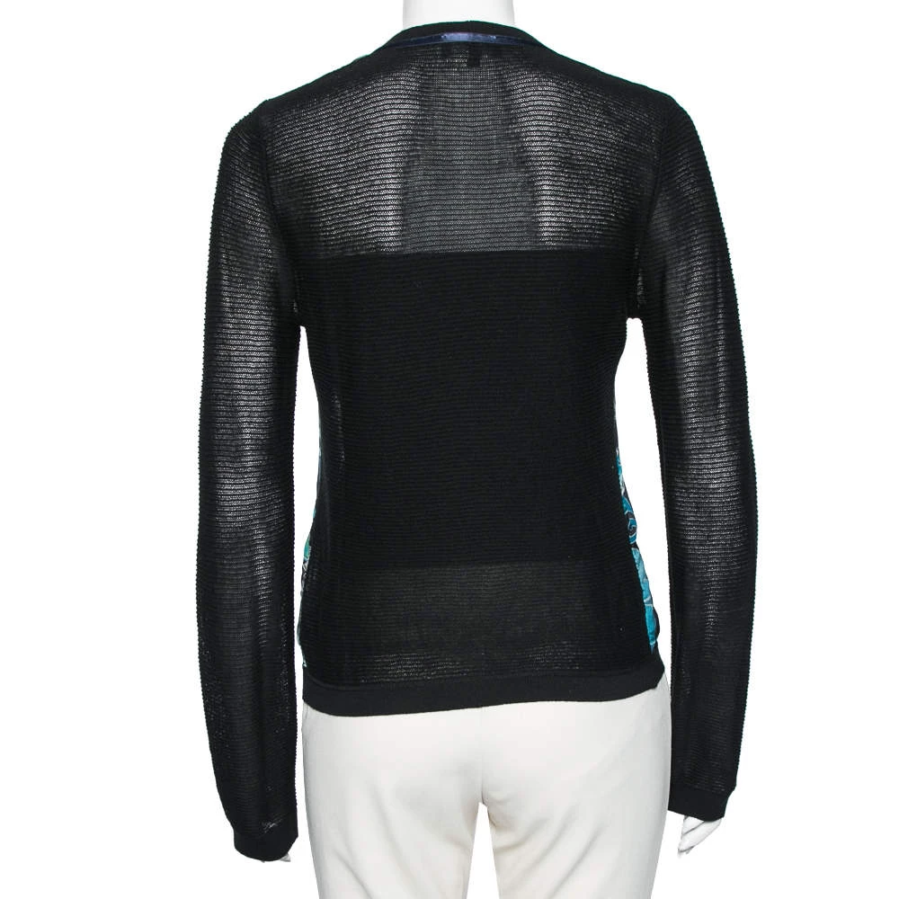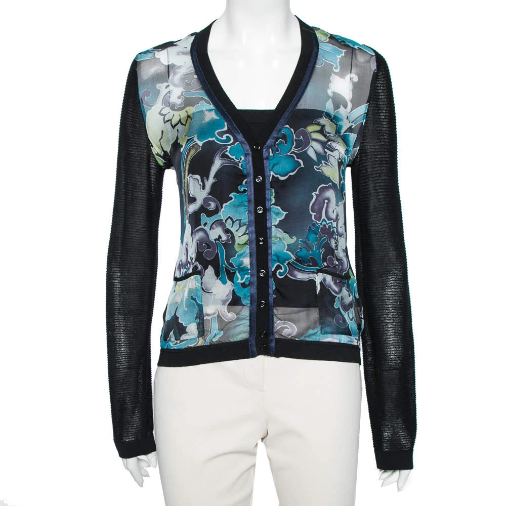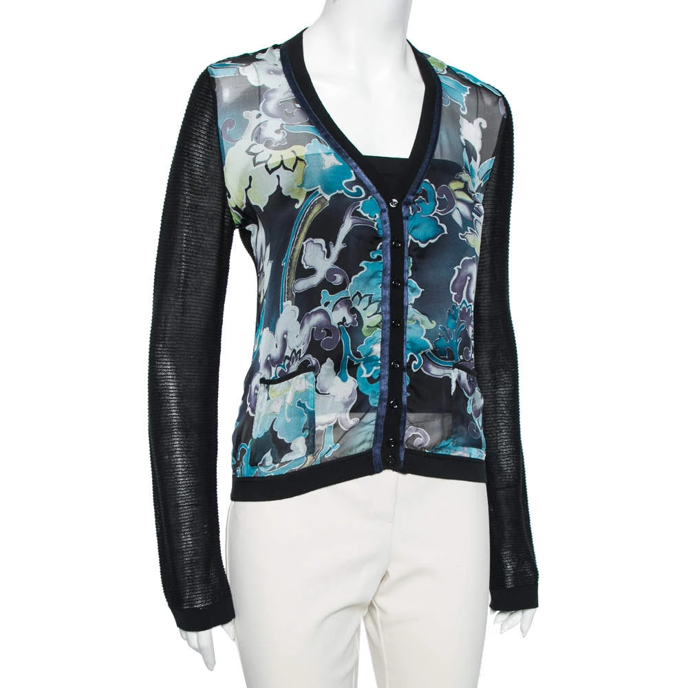 This cardigan from the House of Emporio Armani will be your best pick for the winter! It is stitched using black and blue printed silk fabric and showcases paneled detailing. This cardigan displays buttoned closure and long sleeves.