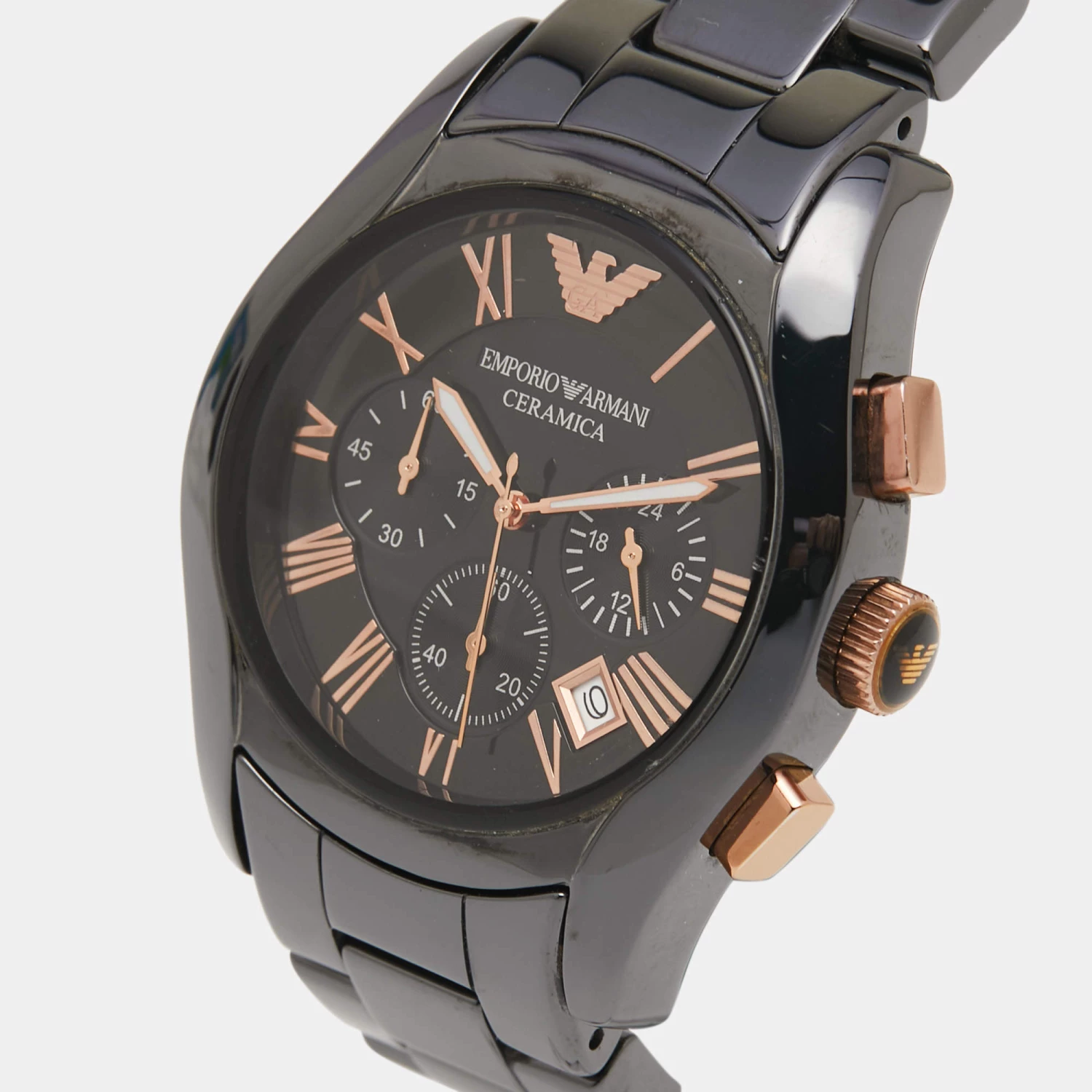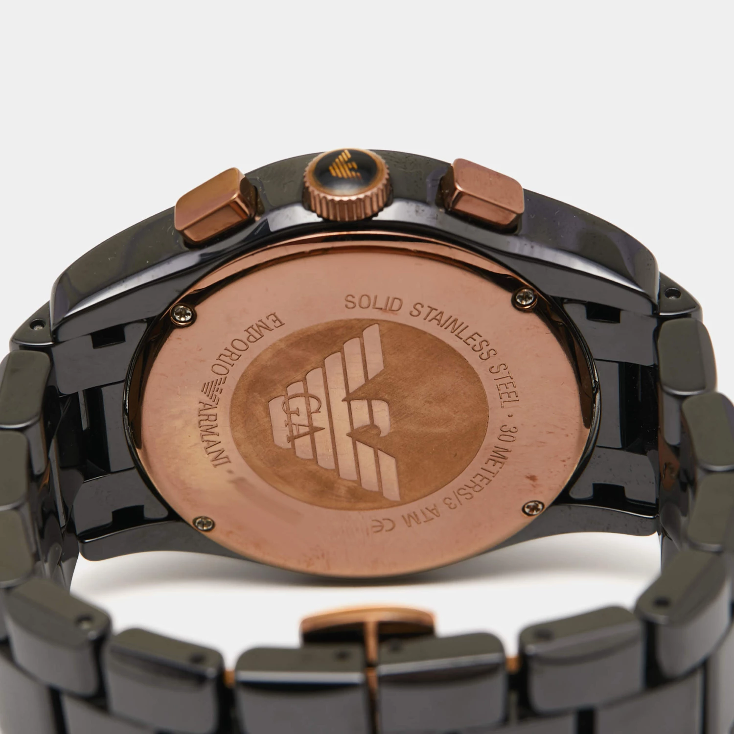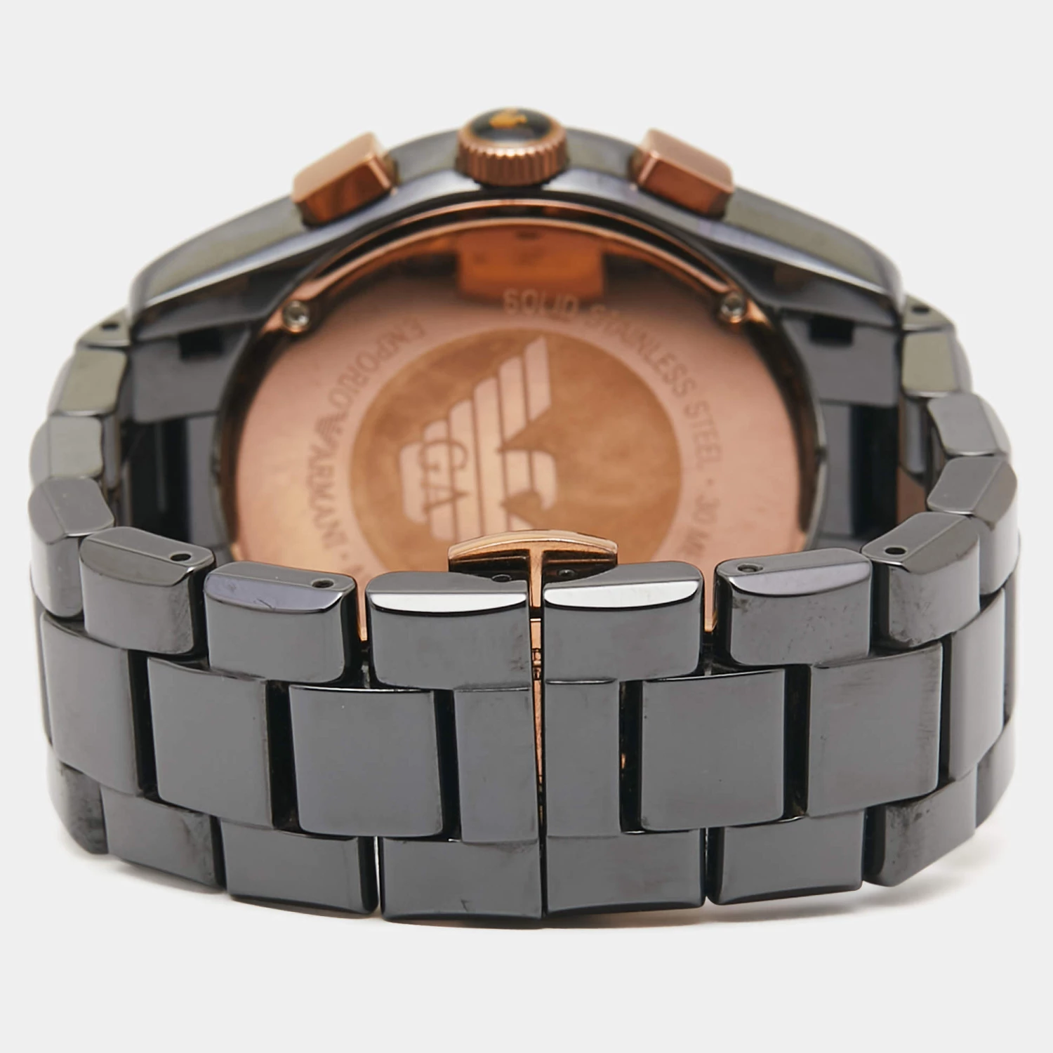 Add a luxurious accent to your wrist with this exquisite Cermica timepiece from Emporio Armani. Made using ceramic and rose gold-plated stainless steel, the quartz/Chronograph watch has a black dial set with gold-tone markers, three subdials, and a date window.