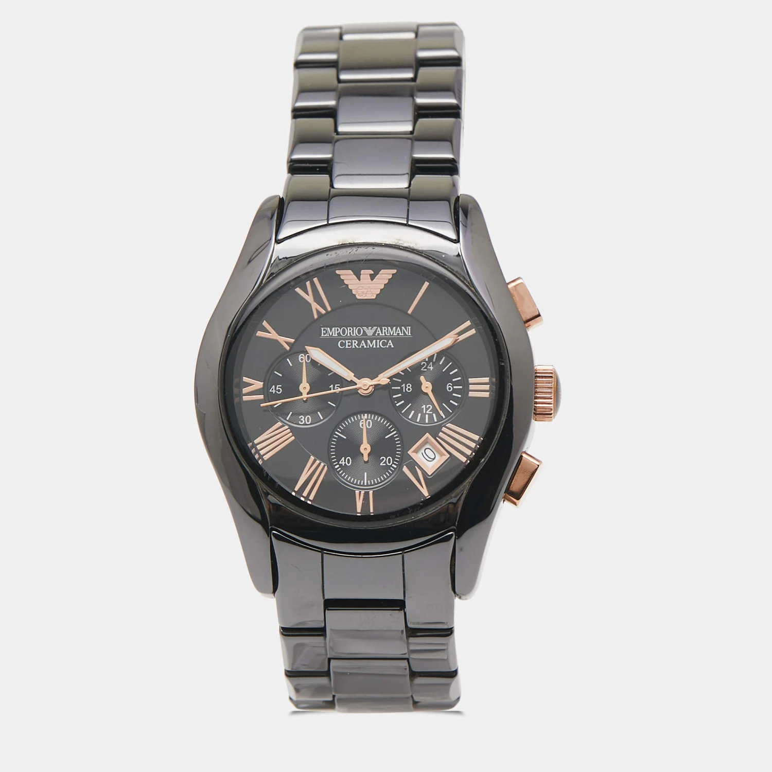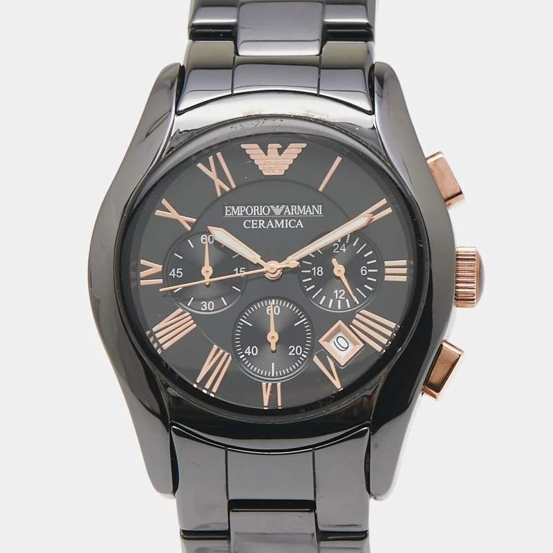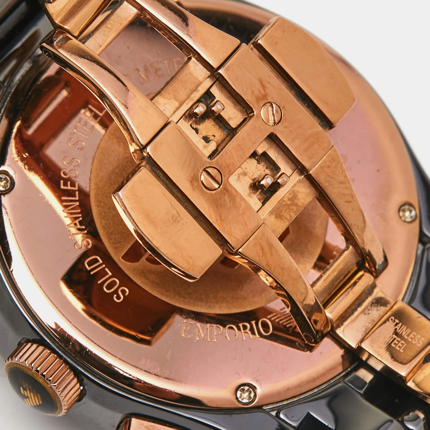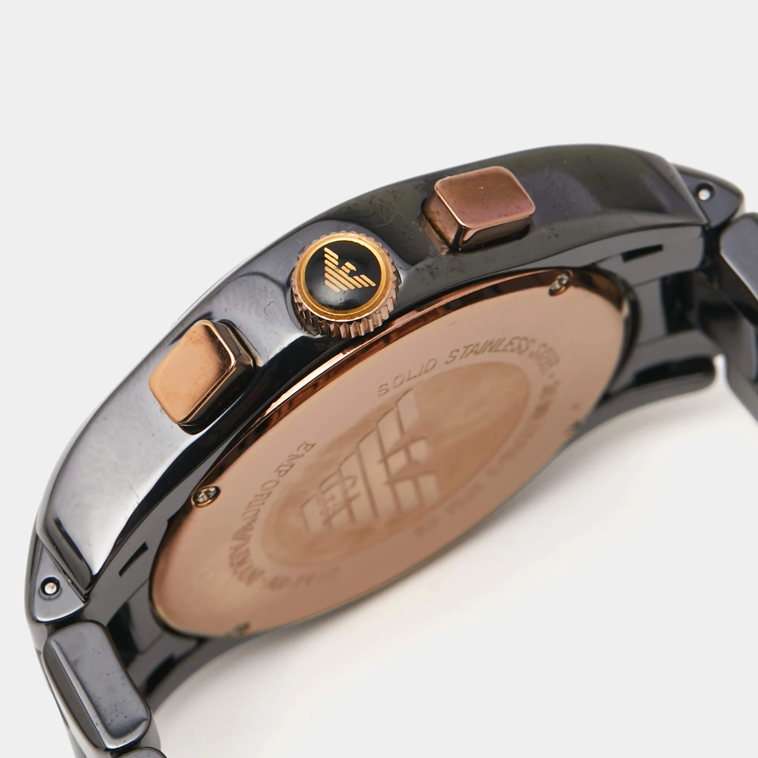 Add a luxurious accent to your wrist with this exquisite Cermica timepiece from Emporio Armani. Made using ceramic and rose gold-plated stainless steel, the quartz/Chronograph watch has a black dial set with gold-tone markers, three subdials, and a date window.