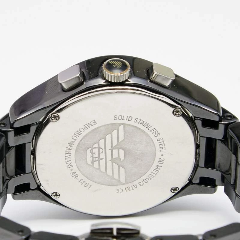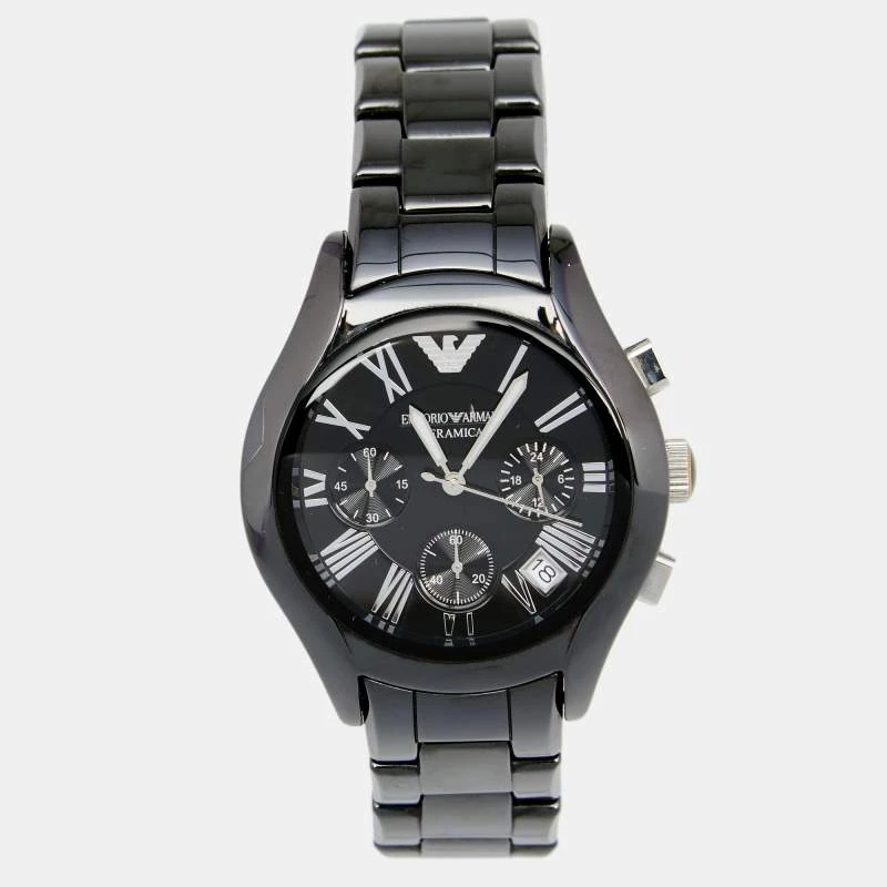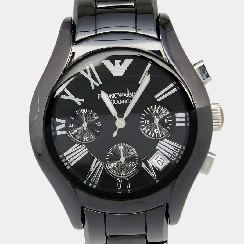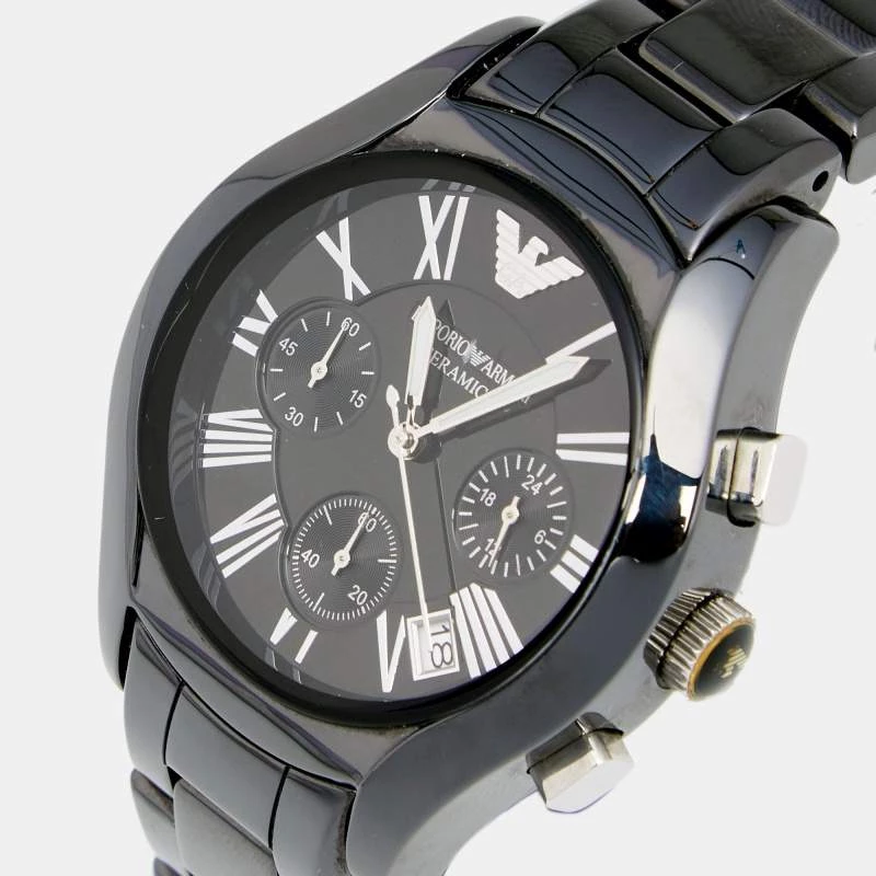 This Emporio Armani timepiece is in ceramic and stainless steel. The case has a smooth bezel and the black dial has Roman numeral hour markers and three hands. This designer quartz/chronograph watch for women is a beautiful accessory you will love wearing.