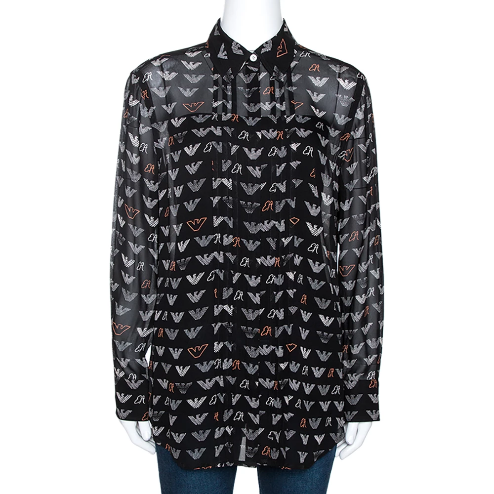 You must add this simple yet sophisticated blouse by Emporio Armani to your closet now! It features a lovely logo cloud print all over, a black shade and long sleeves. Team it up with a skirt and mules for a chic casual look.