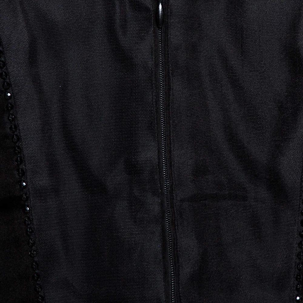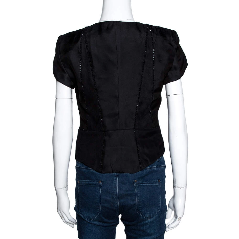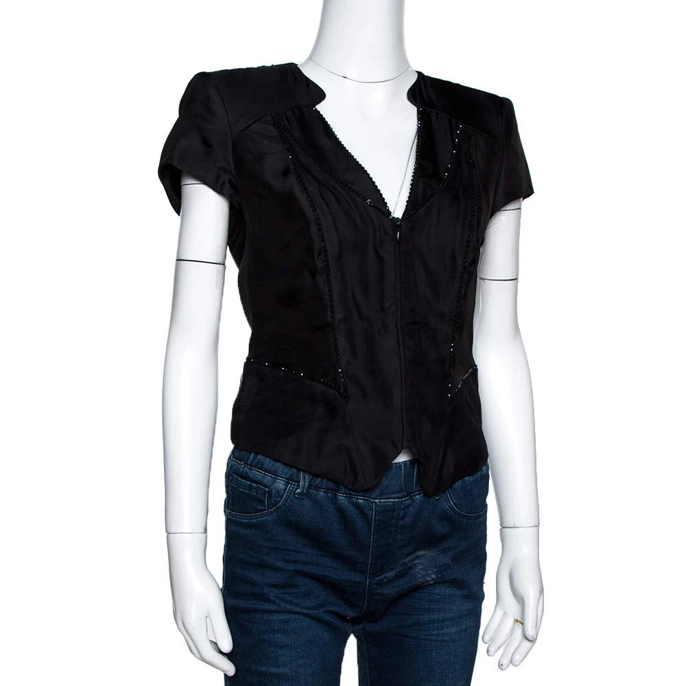 Deliver chic looks with this fine Emporio Armani top. This luxurious top flaunts a classy black shade to project a sense of elegance and regality. It has been crafted from a silk blend and comes with a silk lining. It has short sleeves, a flattering neckline, bead embellishments and a zip front.