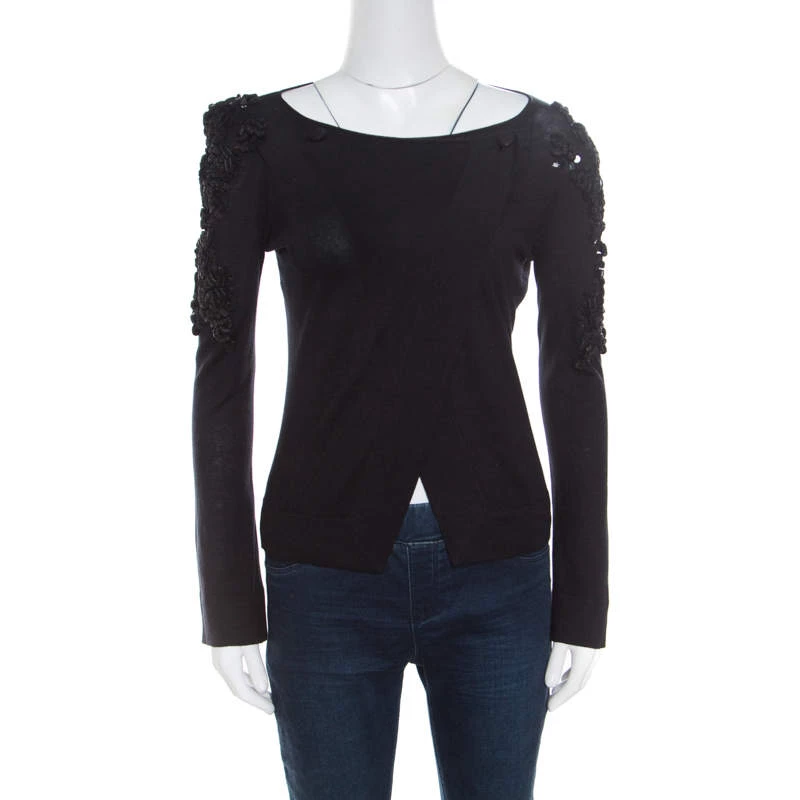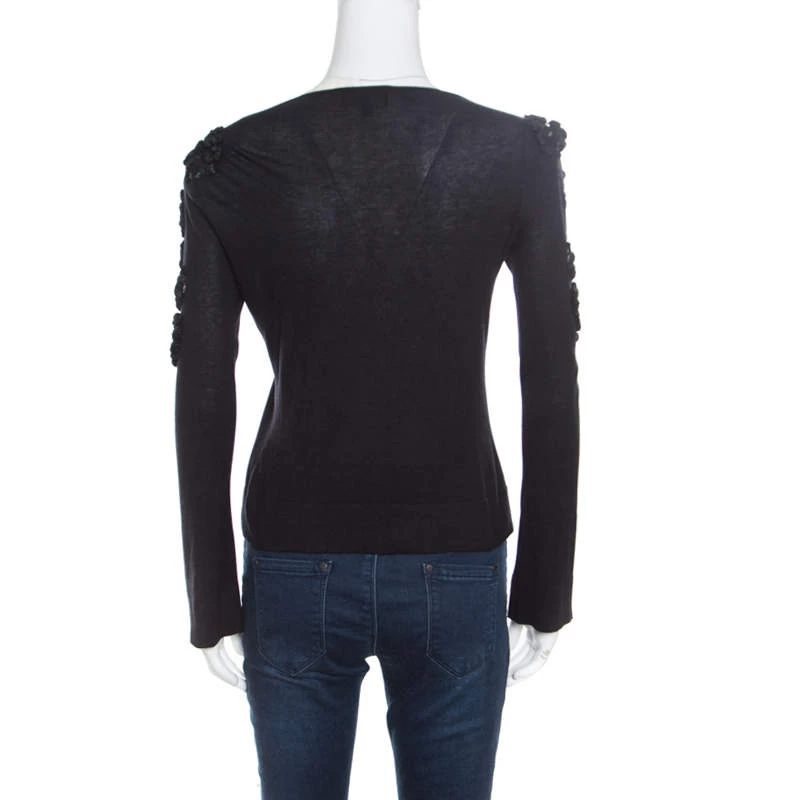 How stylish does this Emporio Armani cardigan look! The black creation is made of a silk blend and features a wrap silhouette. It flaunts a bateau neckline with two button fastenings and long sleeves that are beautifully embellished with sequins. Sure to lend you a great fit, it can be paired well with slim fit jeans and ballet flats for a special outing with friends.