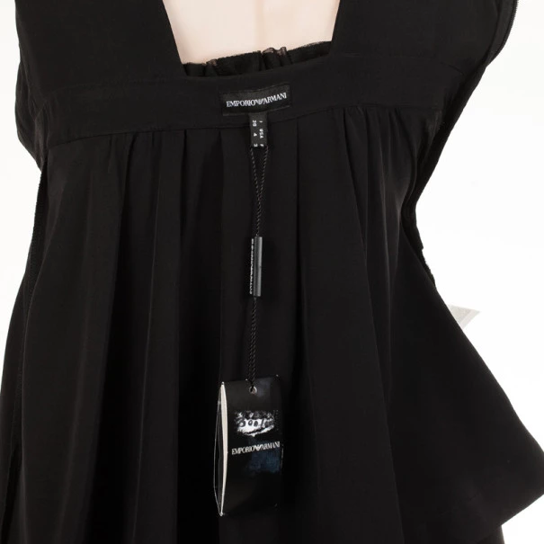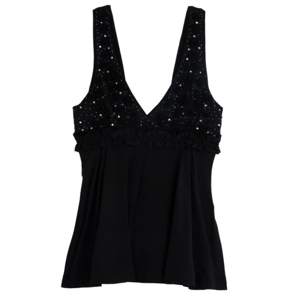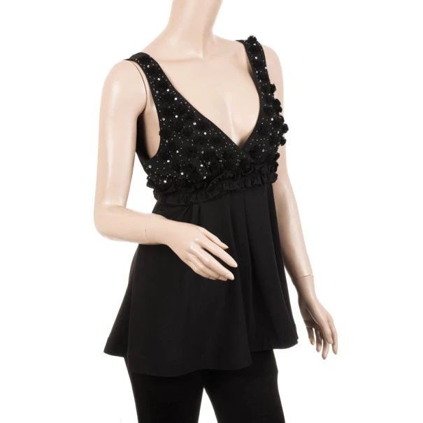 Put on this adorable top by the one and only Emporio Armani. This sleeveless and backless top is embellished with small crystals and small woven flowers. It is equipped with a zipper fastening on the side. The area just below the chest is highlighted with a ruffled trim detailing.