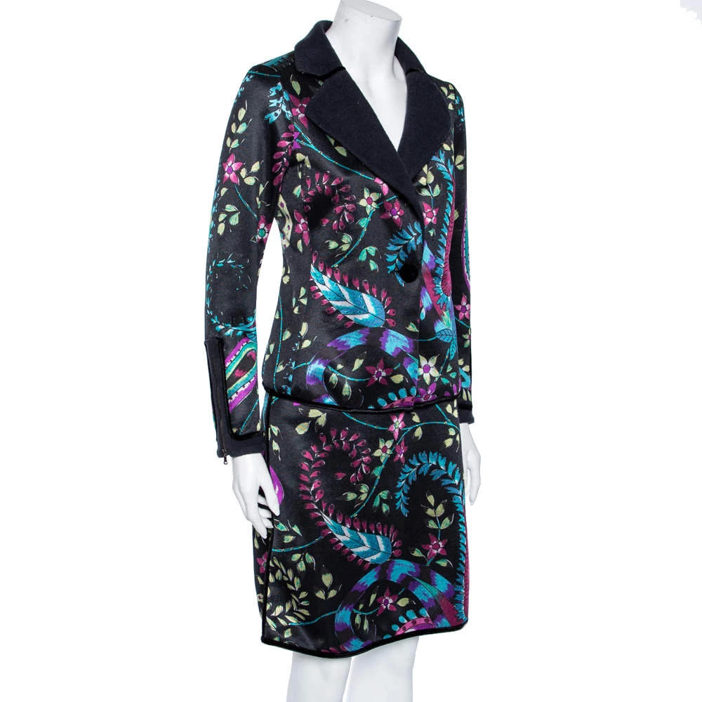 This set from Emporio Armani is here to add a playful and colorful edge to your ensemble. It has been stitched using black floral printed synthetic fabric. The blazer is adorned with a single buttoned feature on the front. Revamp your formal attire by wearing this gorgeous Emporio Armani set.