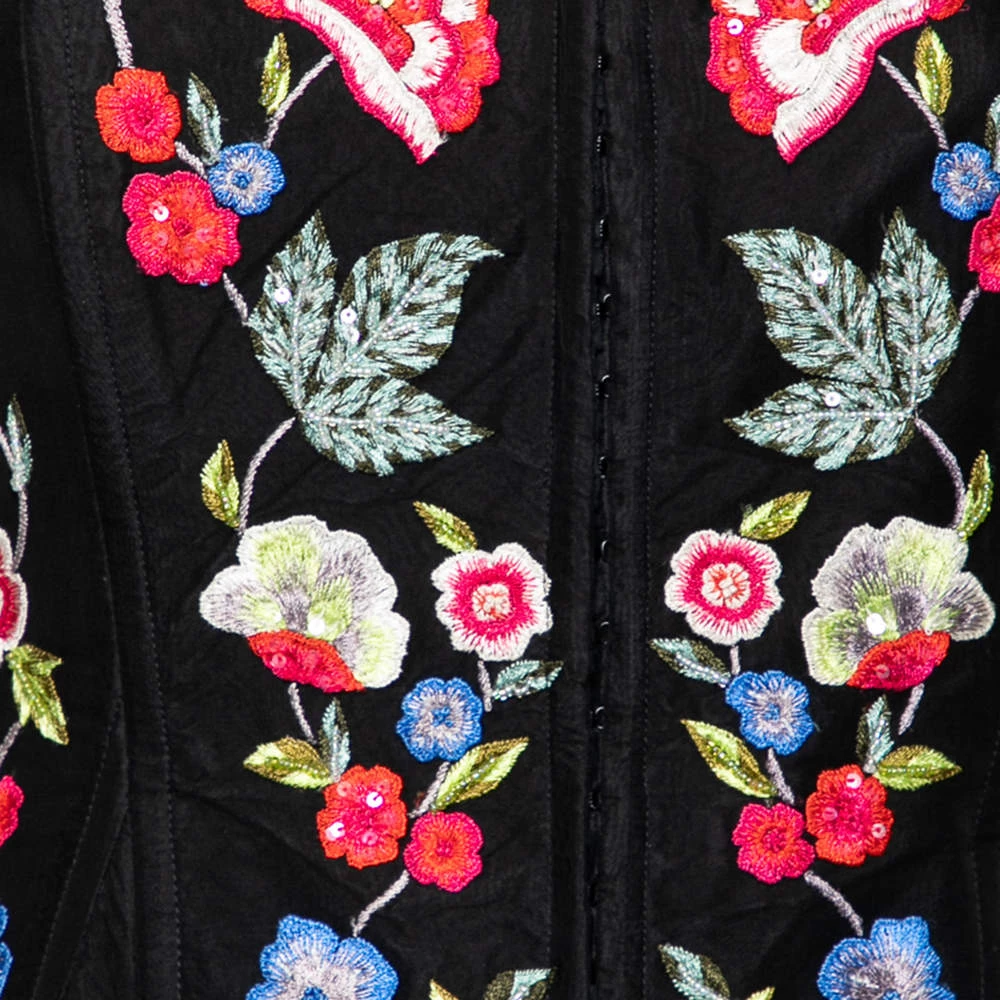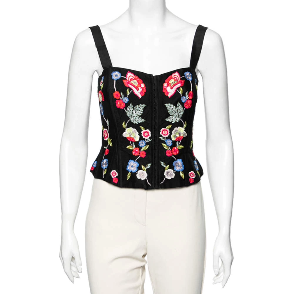 Try the corset trend with this top by Dolce & Gabbana. Sewn with skillful techniques using quality fabric, the black corset top has a shapely neckline, the right cuts, and a spread of floral embroidery. The front hook closure ensures the desired fit is offered.
