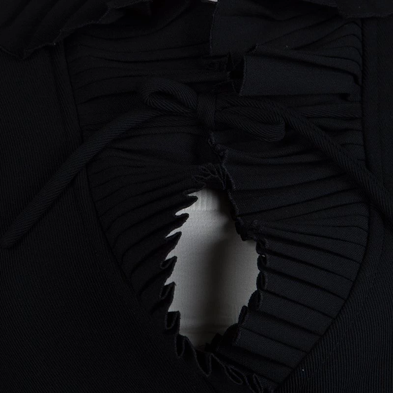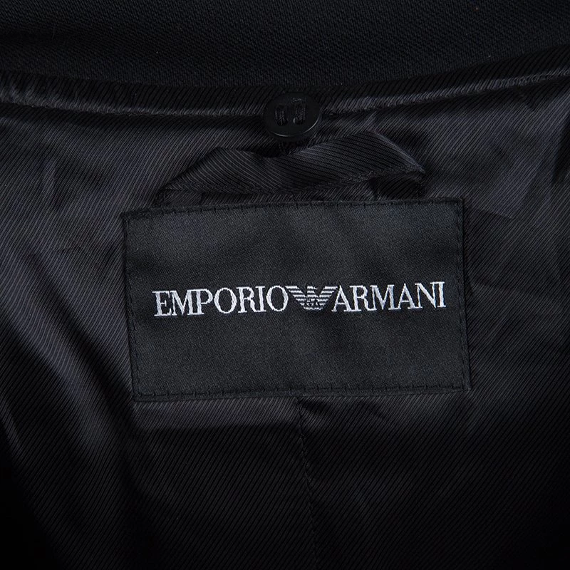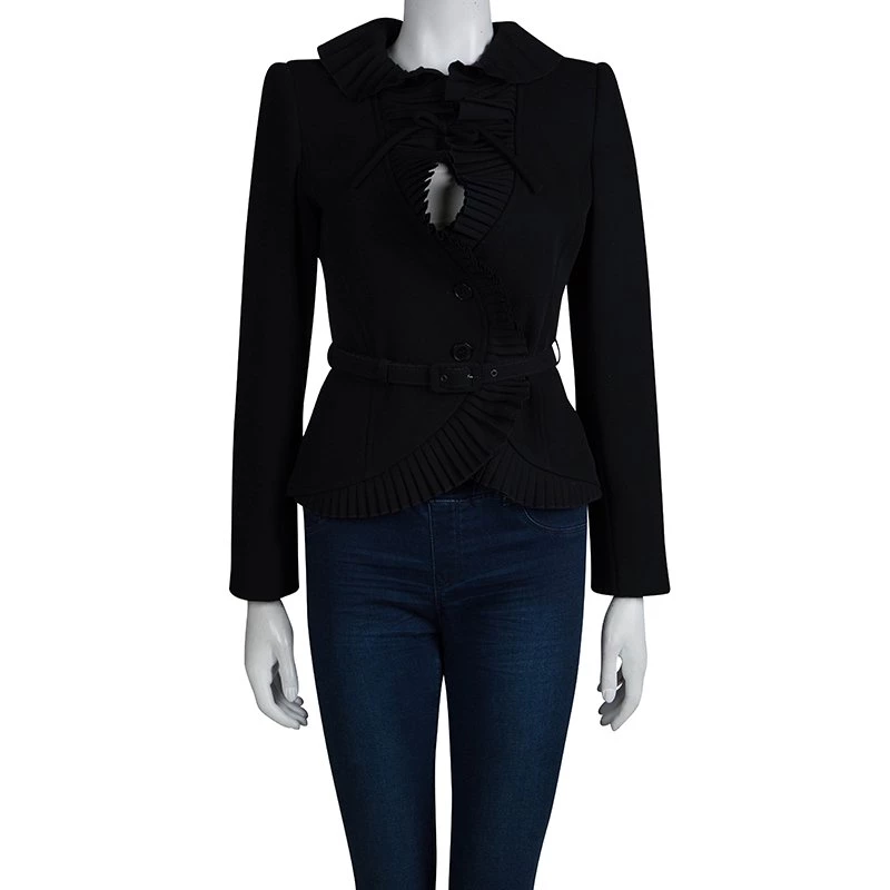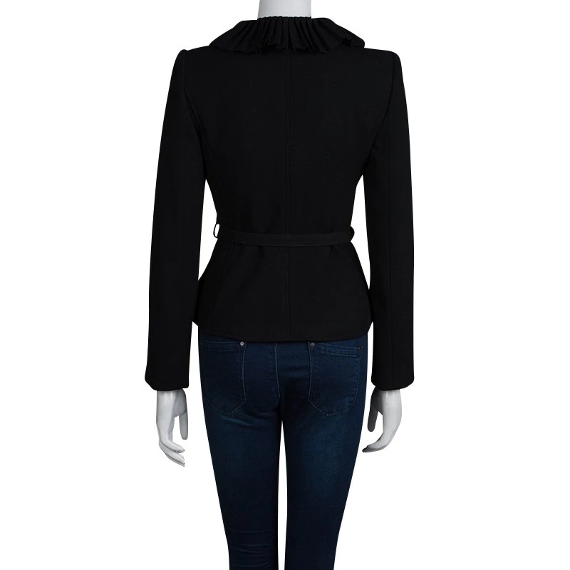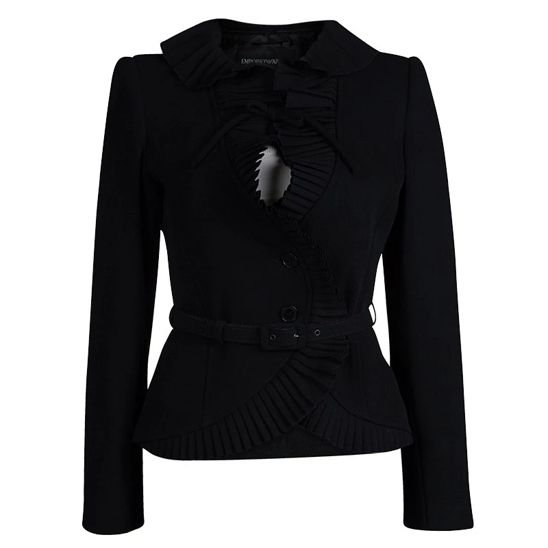 A blazer with a glamorous edge, this piece from Emporio Armani features an elaborate collar and pleated trim. Well-fitting, it has a slim belt at the waist and a bow tied just under the neck. Largely made from wool, it combines style and comfort.