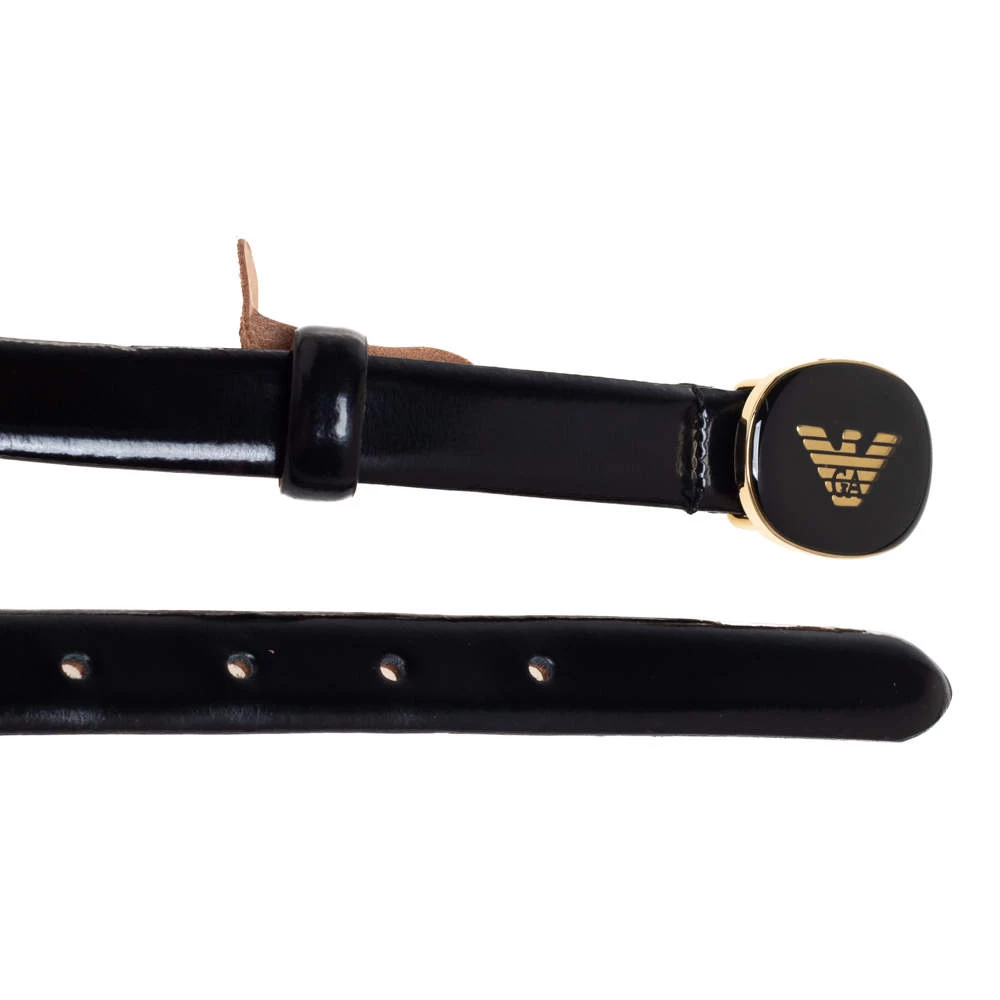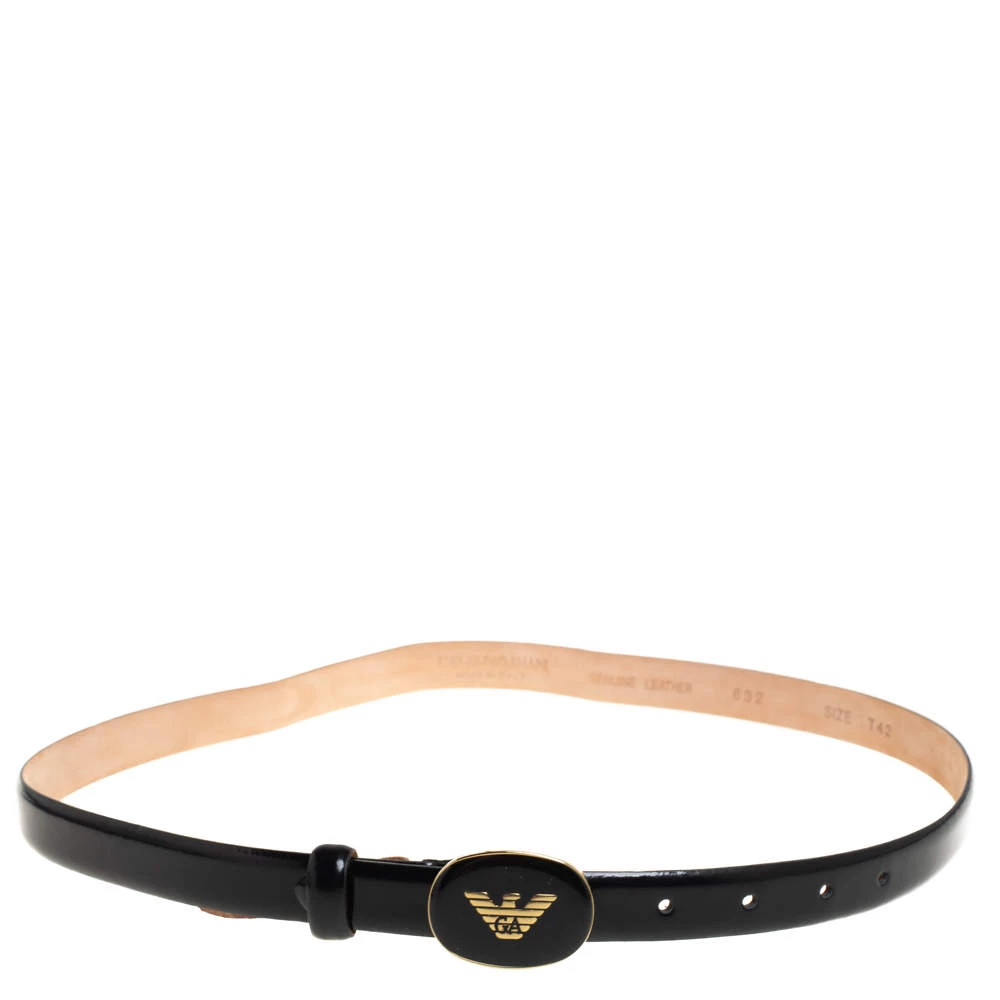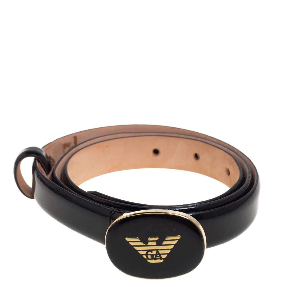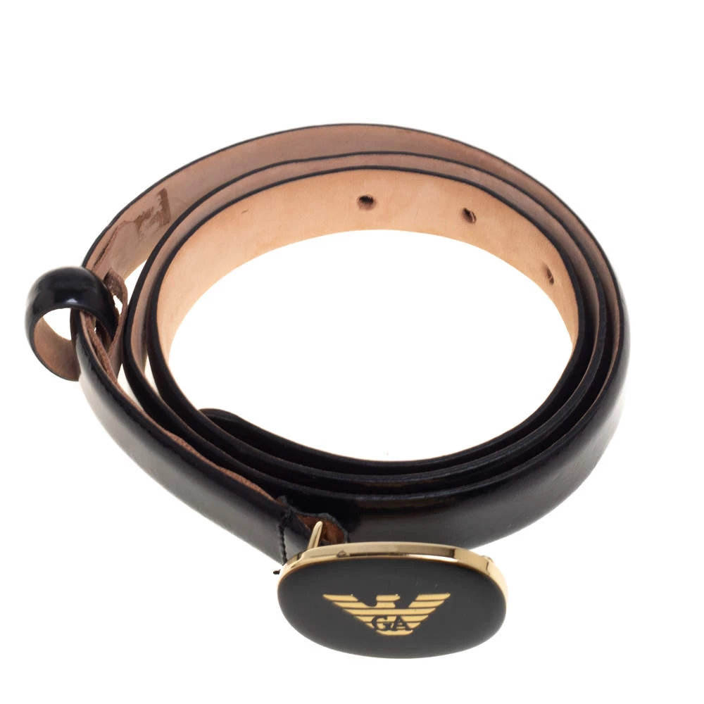 Add the Emporio Armani style to your everyday looks with this fine belt for women. Crafted from glossy leather and complete with an oval logo buckle, this smart belt can be paired with jeans to dresses.