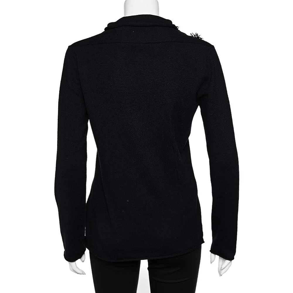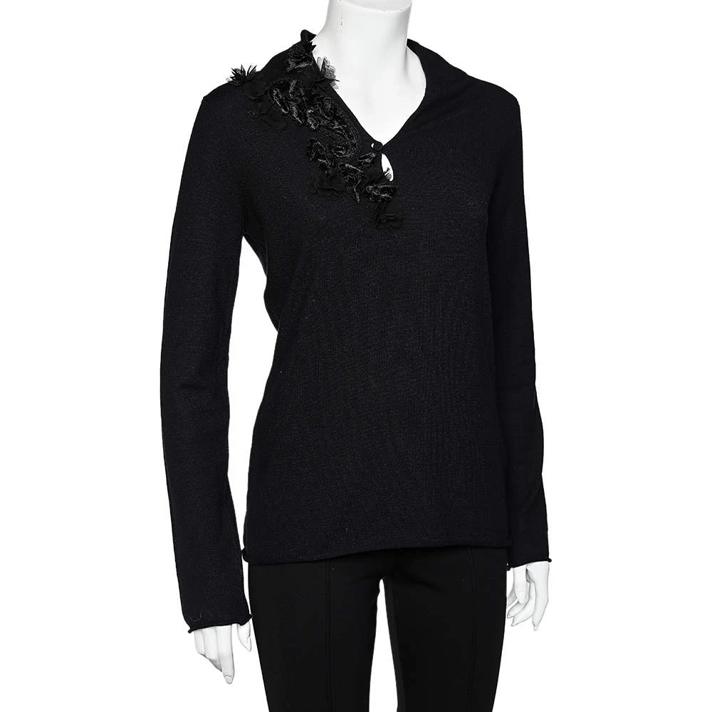 Crafted from knit fabric, this simple black sweater from Emporio Armani is beautifully accented with a floral appliqué. The long sleeves and keyhole opening at the front make for an understated yet elegant appeal. Pair it with comfy leggings and sneakers.