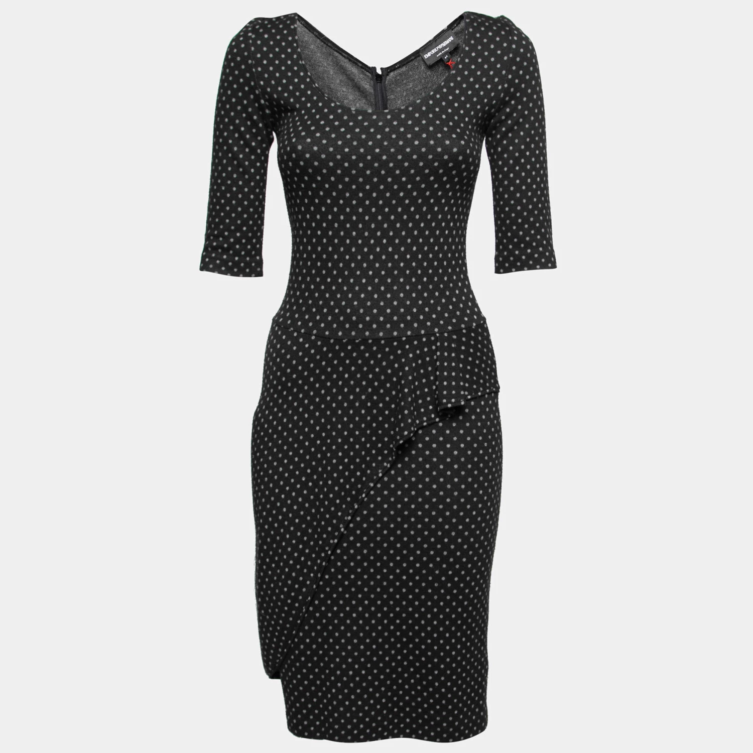 Exude a manner of charm and sophistication by wearing this dress from Emporio Armani. Flaunting a midi-length silhouette, this dress is cut from black knit fabric, which shows polka-dot prints. Enhanced with ruffles, this cute dress comes with a zipper.