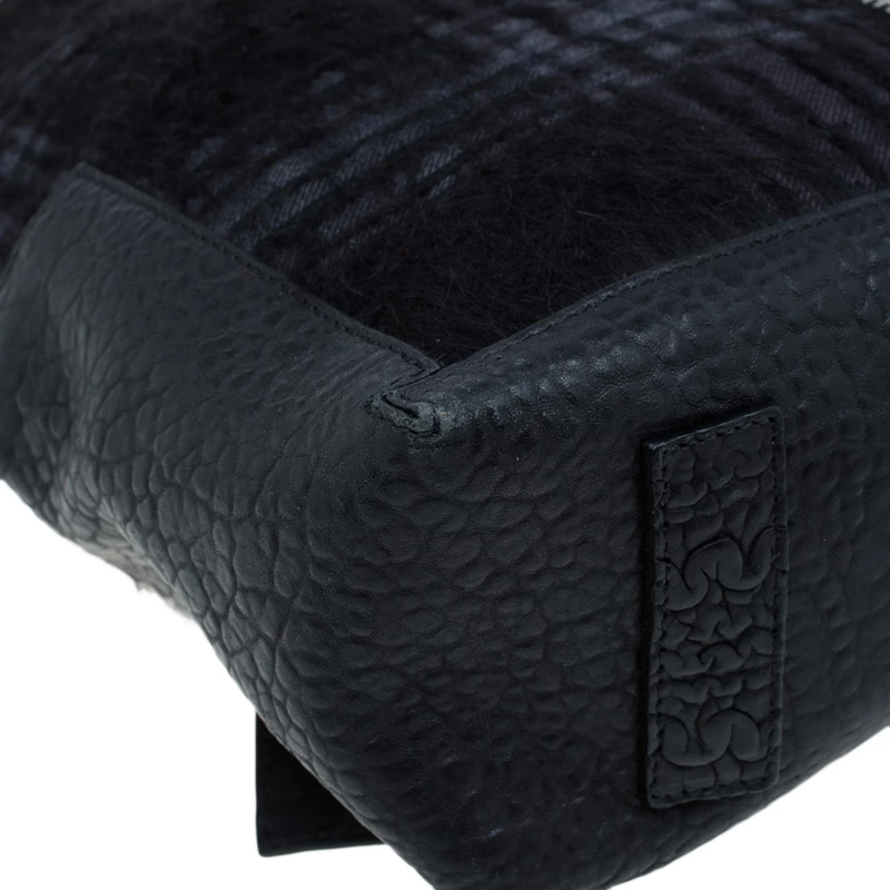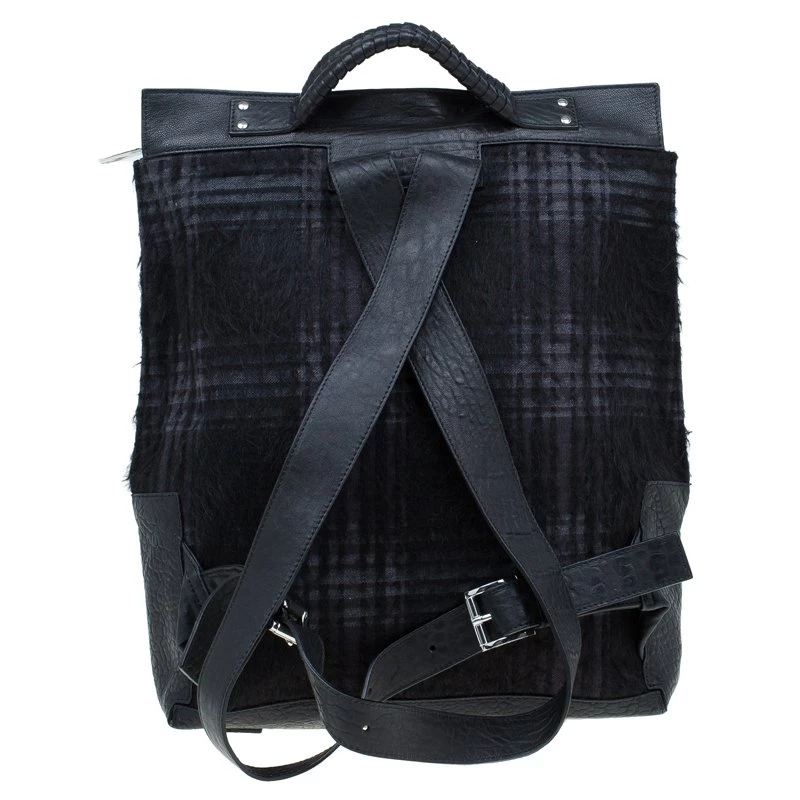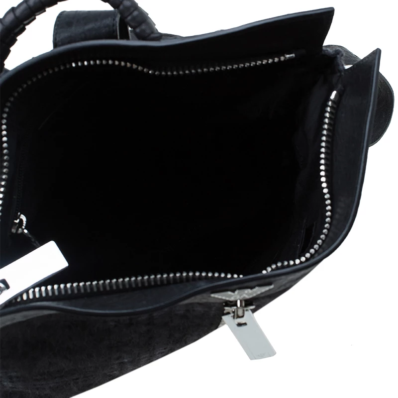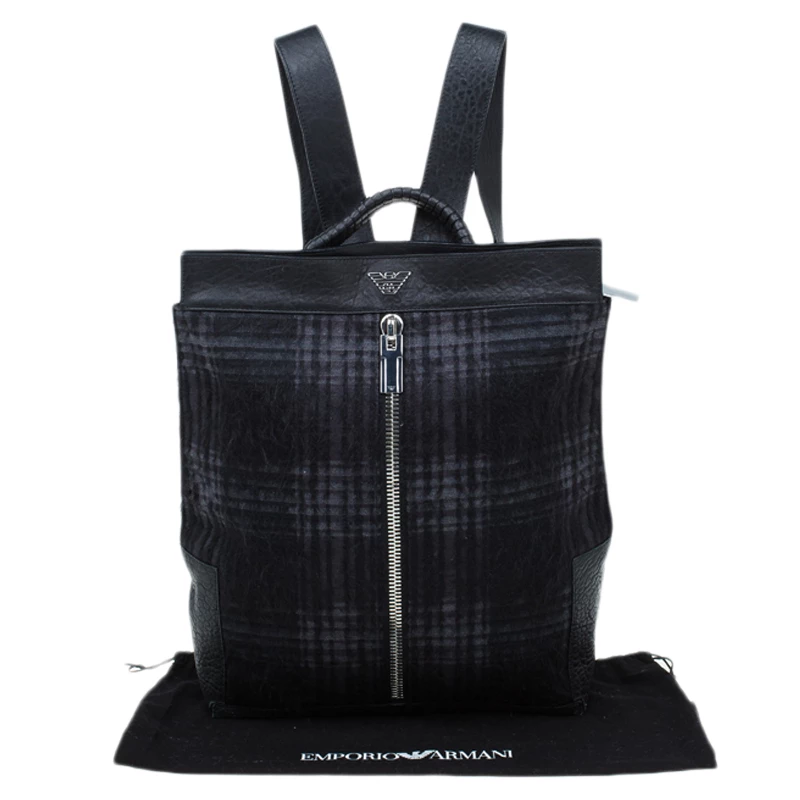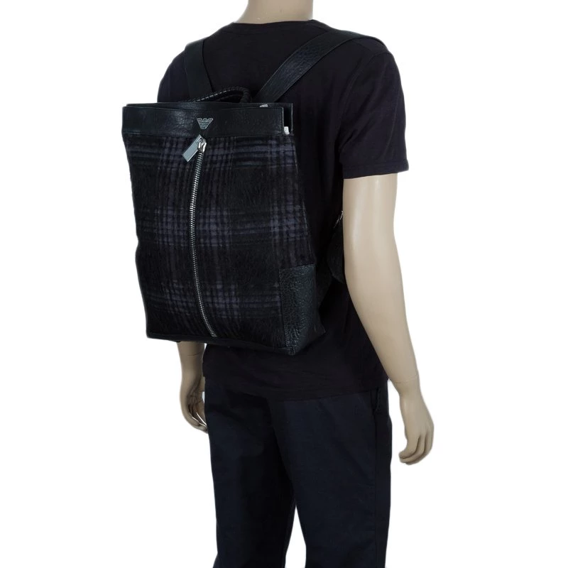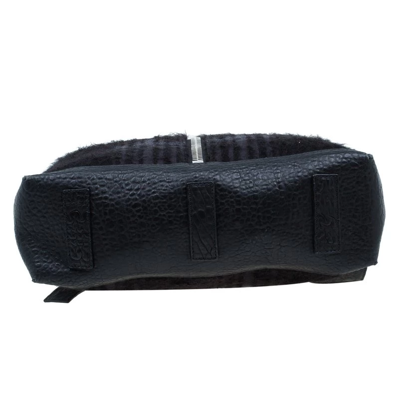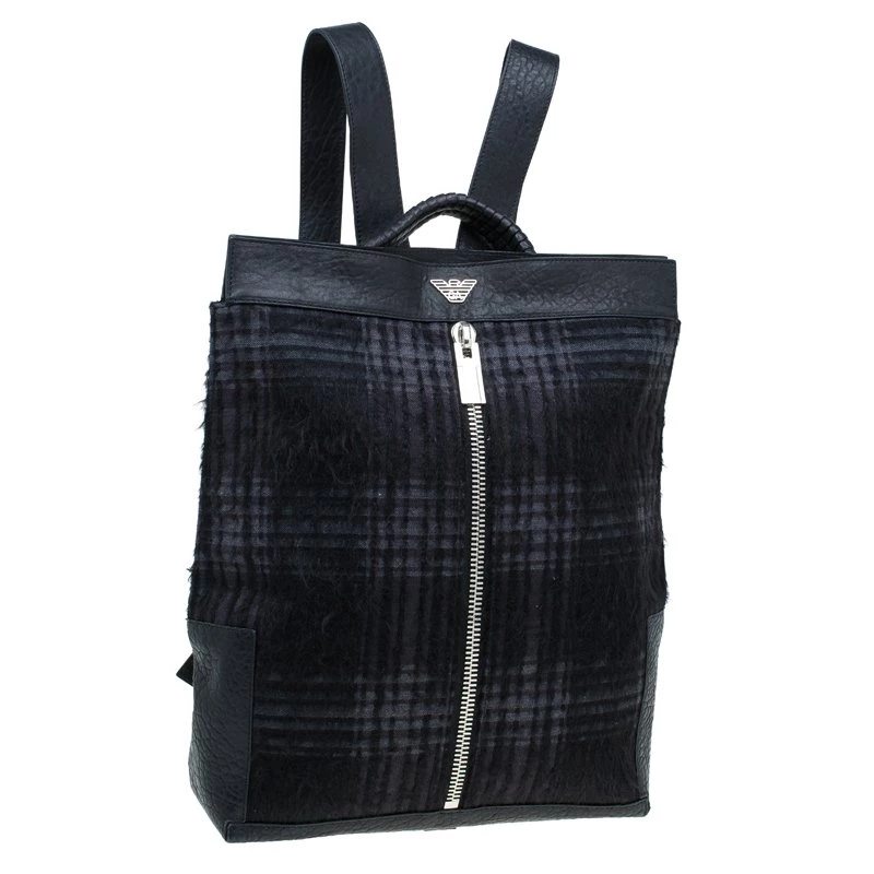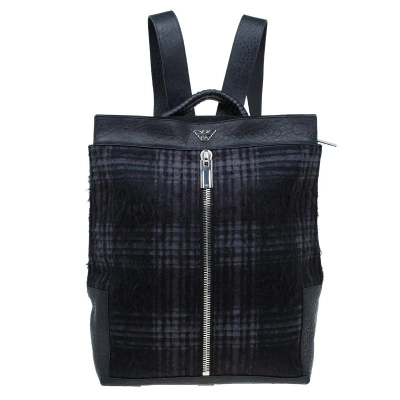Go chic and stylish with this luxurious backpack from Emporio Armani. It is crafted from leather and calf hair, featuring a front zip and adjustable back straps and a top handle. It is accentuated with a zip up closure that reveals nylon lined interior which houses an open compartment and brand labeling. This backpack is accentuated with silver-tone detailing.