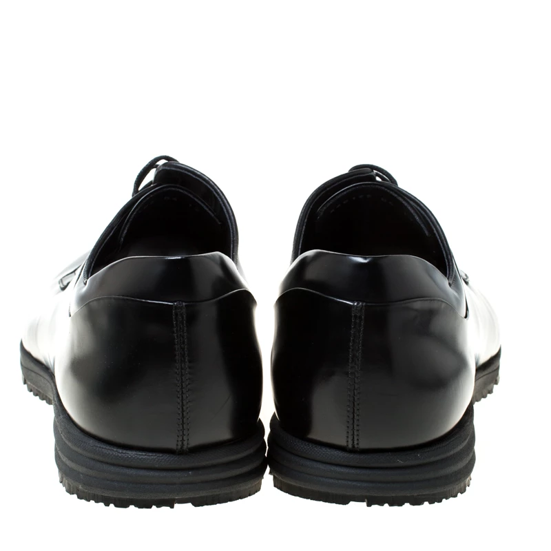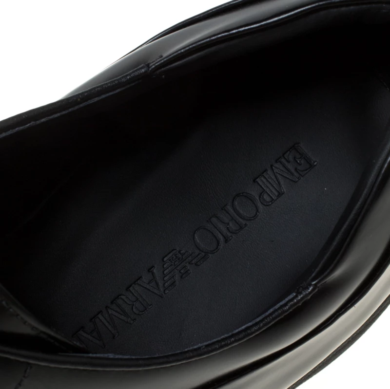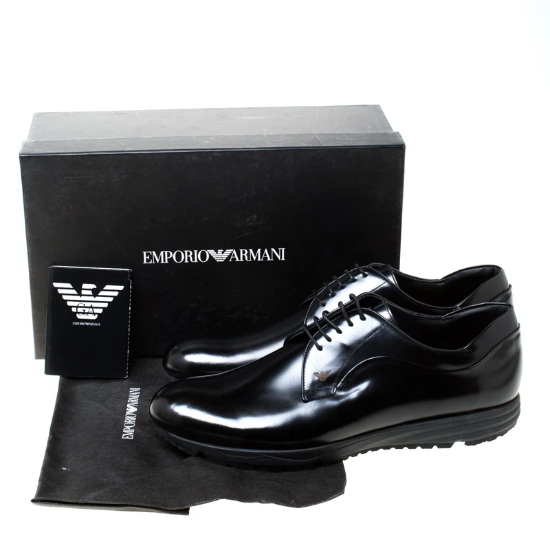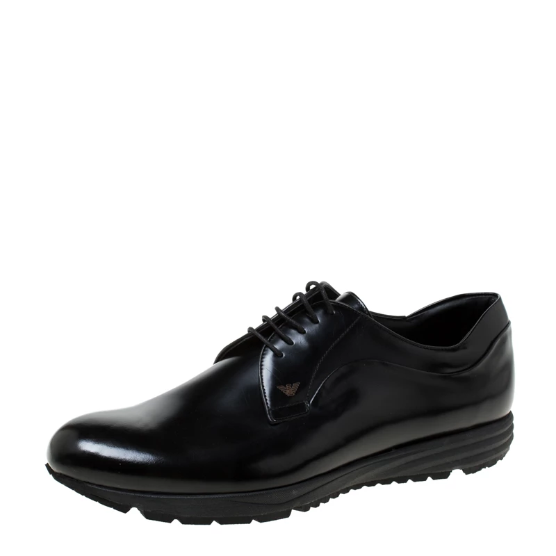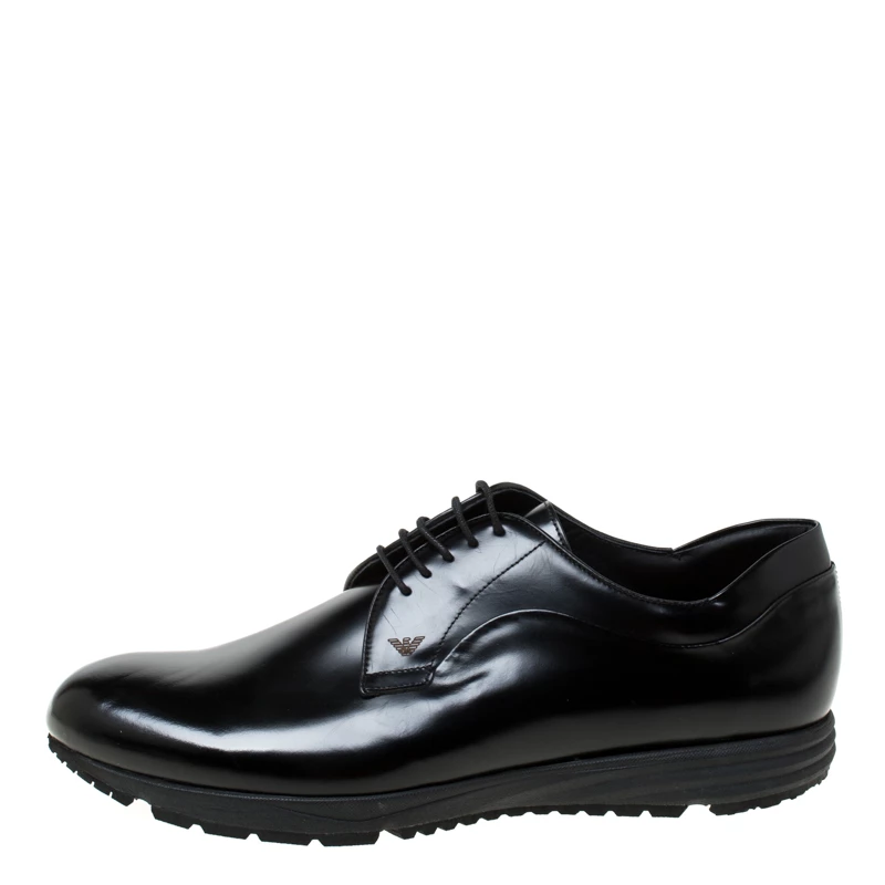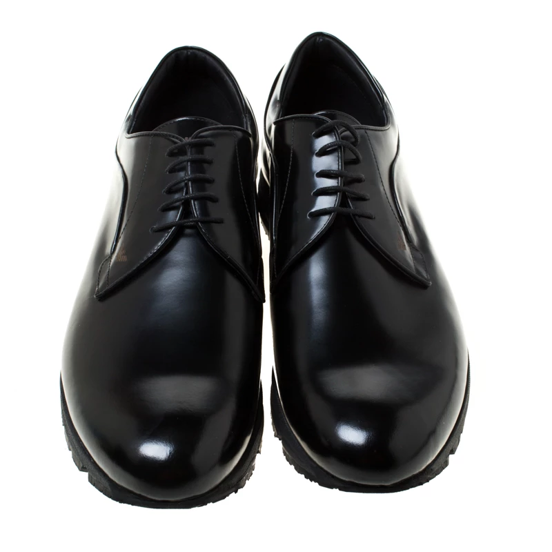 These Derby oxfords from Emporio Armani are sure to make you look smart and very fashionable. Crafted from leather, they flaunt a smooth, polished black exterior, leather-lined insoles, and simple lace-ups. With tough soles for maximum grip and comfort, these shoes are the perfect choice for the modern man.