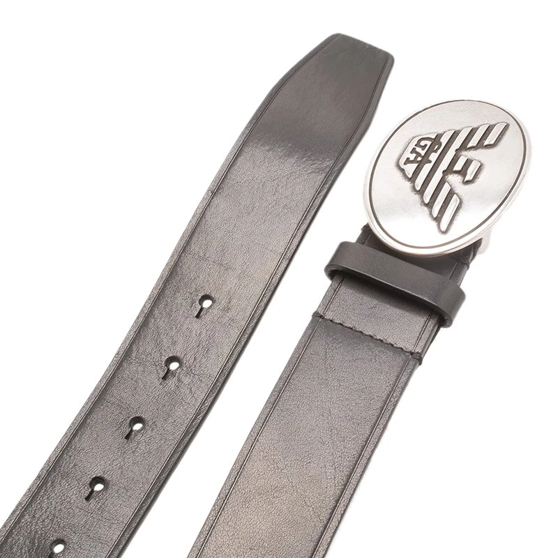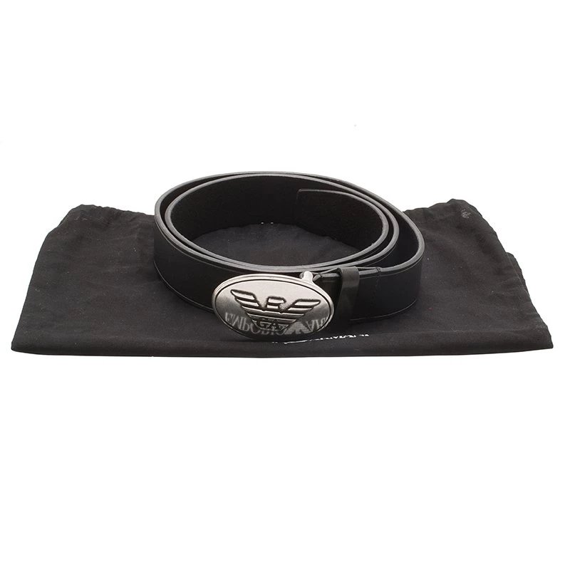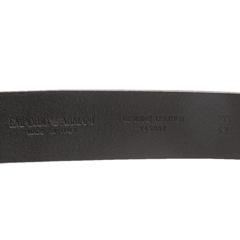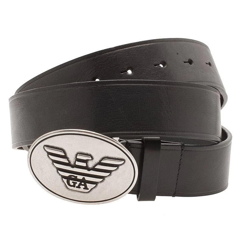 Get this Armani belt for your man to add oodles of charm to his wardrobe. Crafted from 100 percent genuine leather, the belt is a deep black in color and has a striking silver colored buckle with the brand logo embossed on it.
