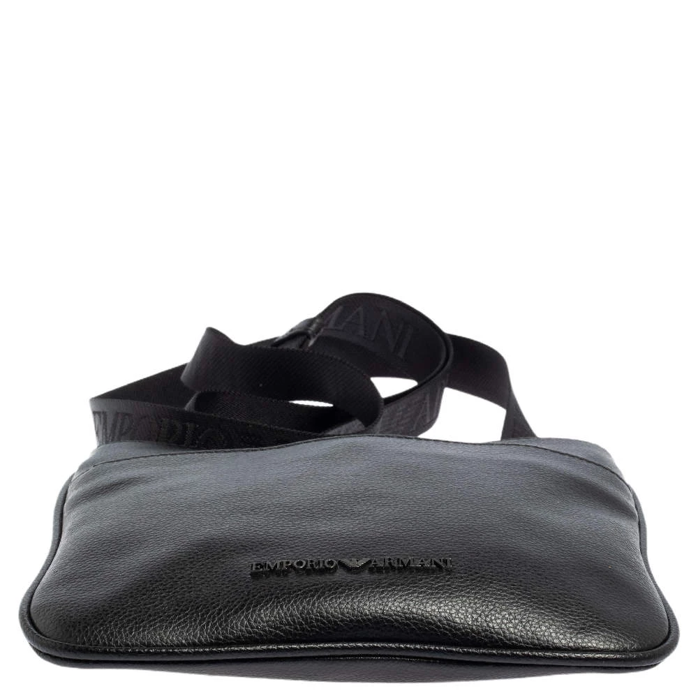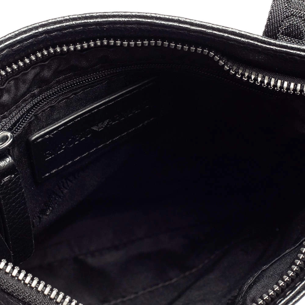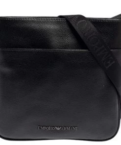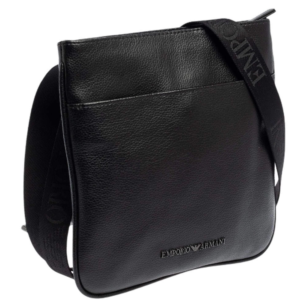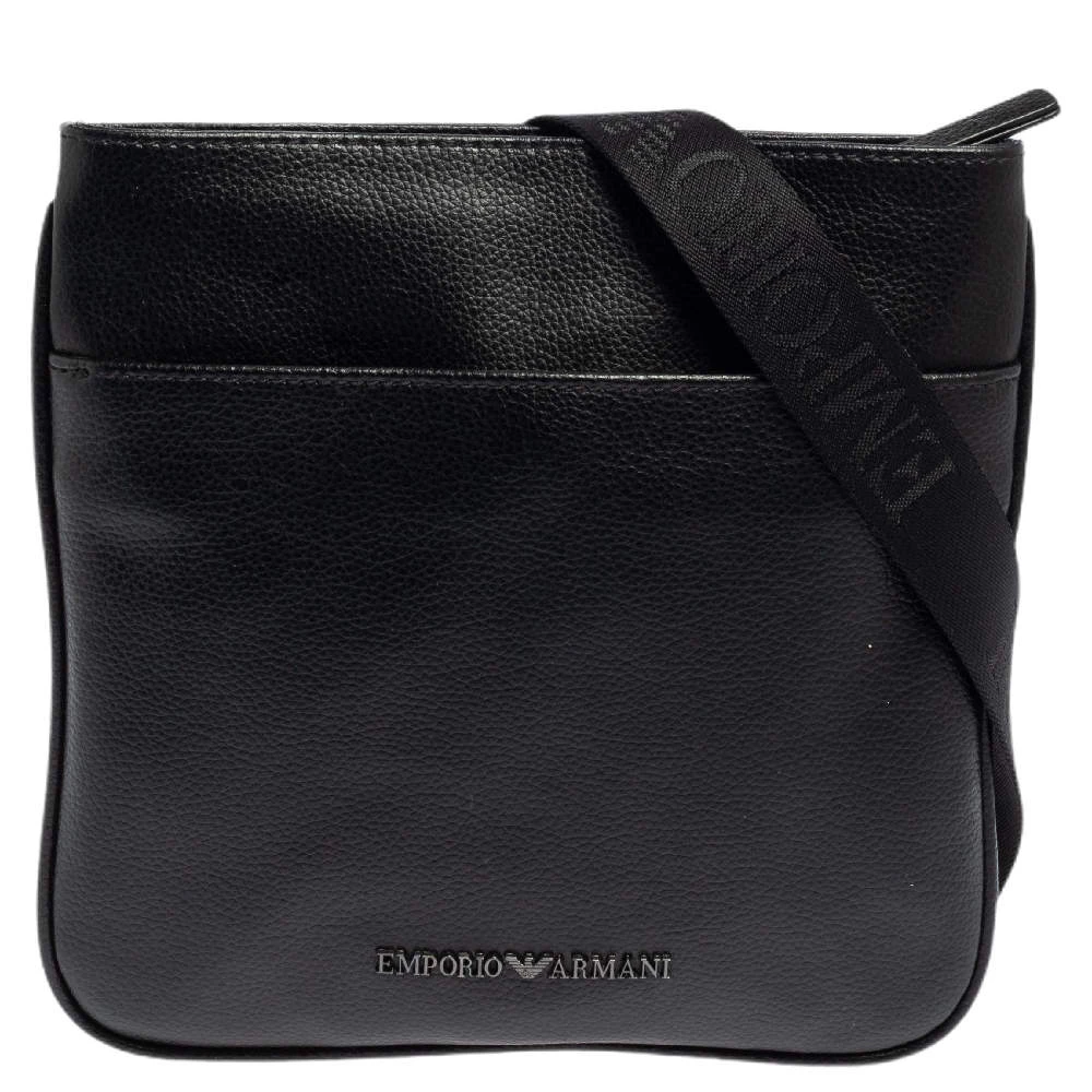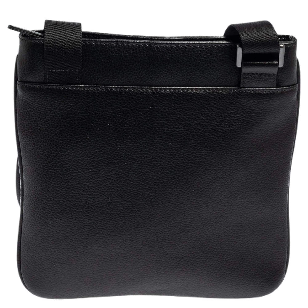 This slim messenger bag by Emporio Armani is designed to be practical and stylish. Crafted from black leather, it features a front slip pocket and a main interior lined with fabric. The bag can be carried on the shoulder or as a crossbody using the shoulder strap.