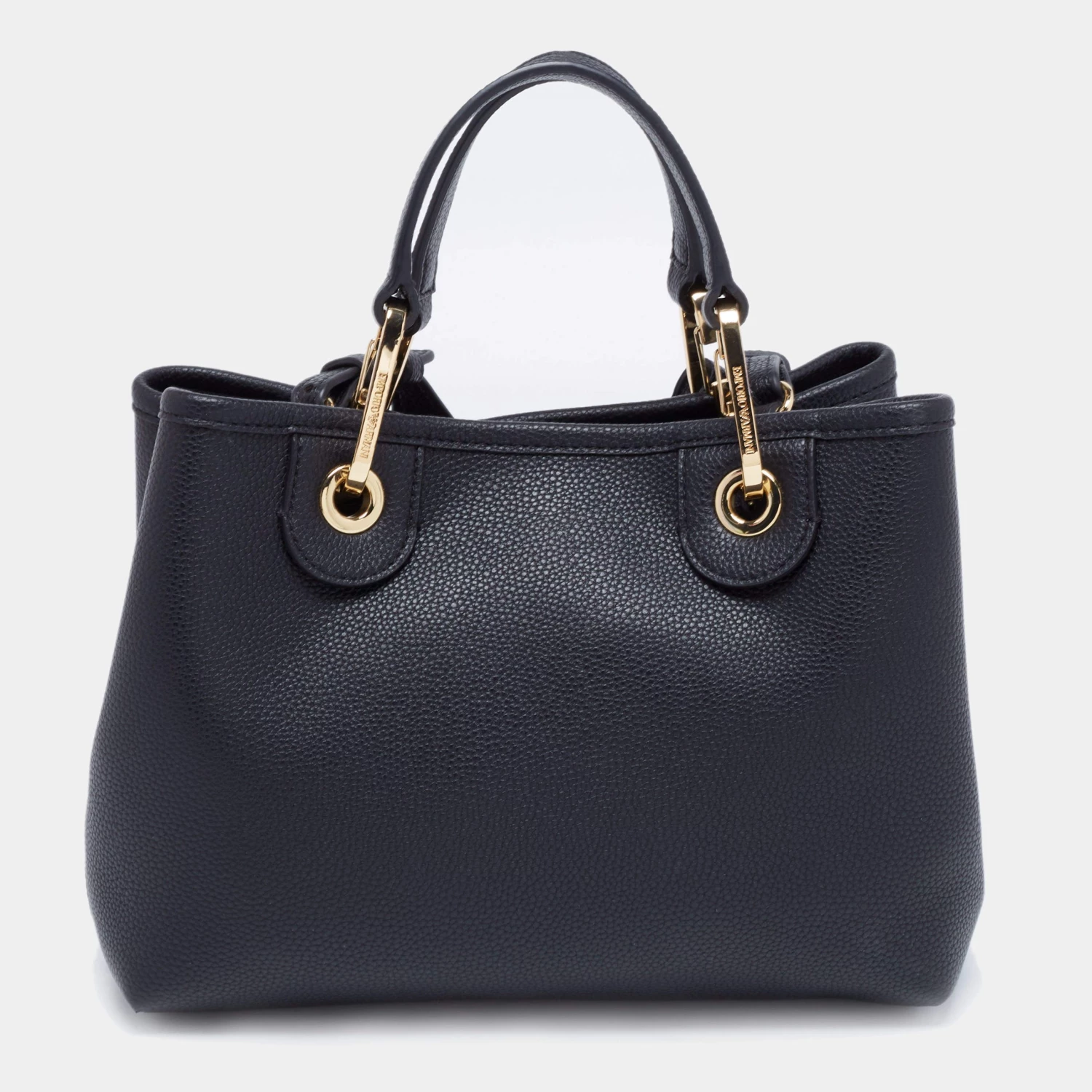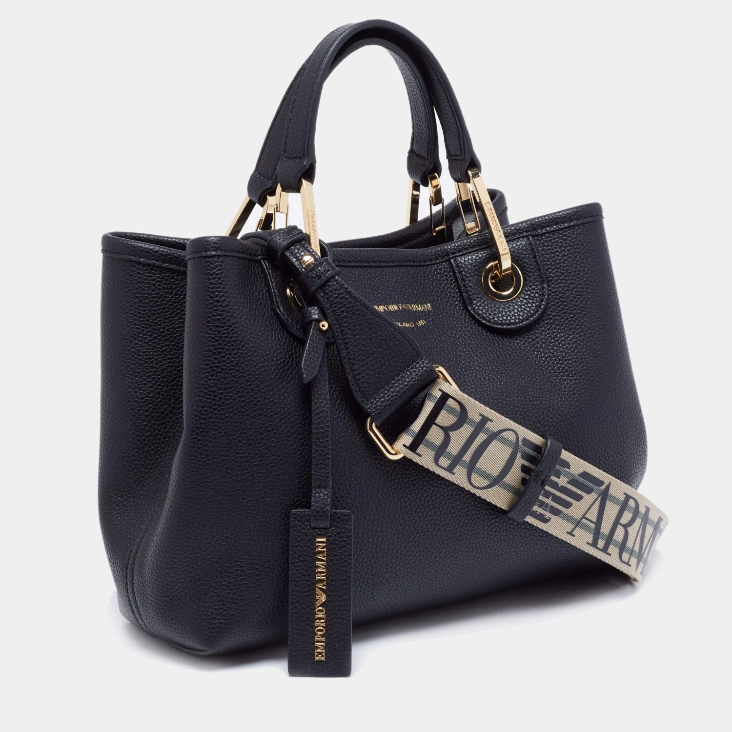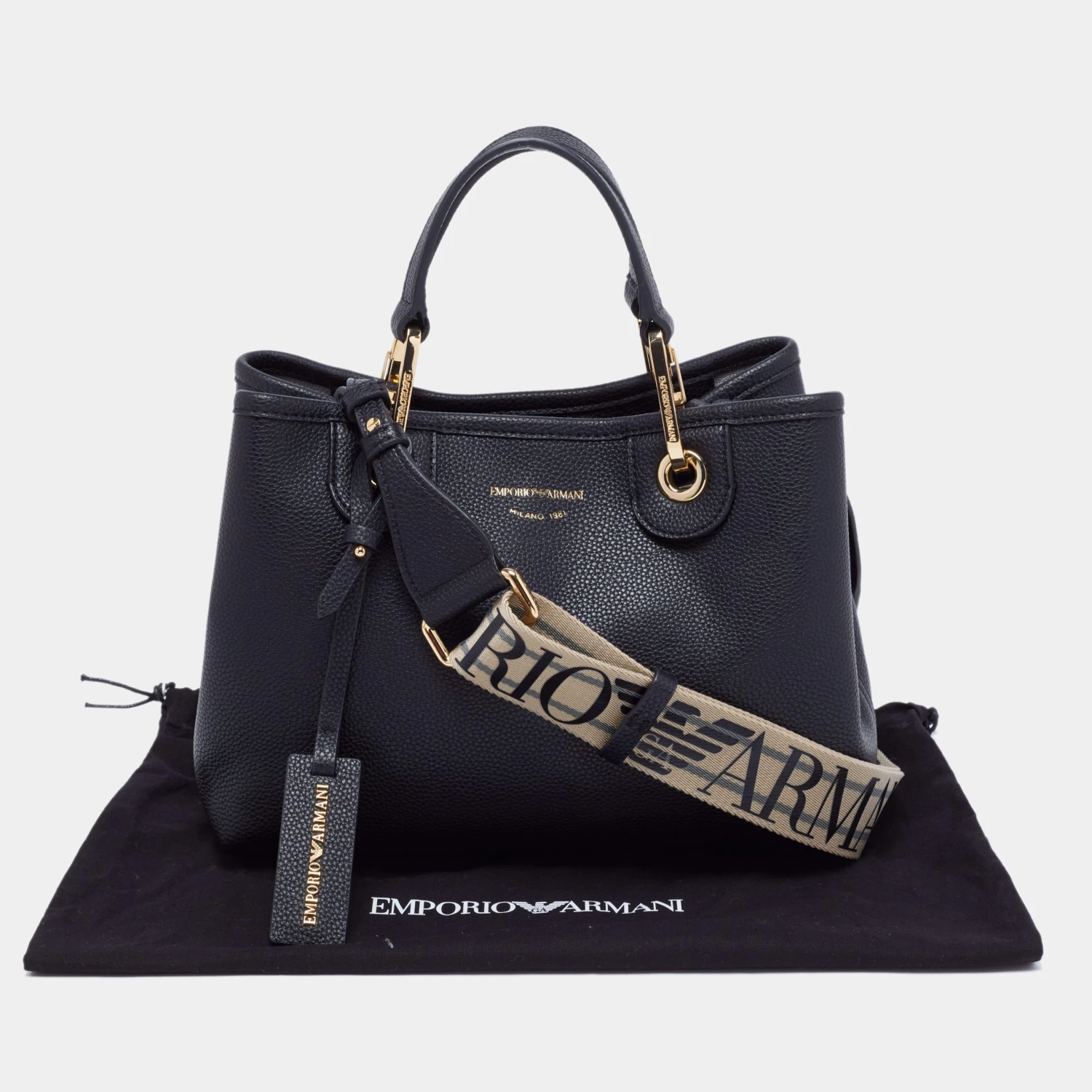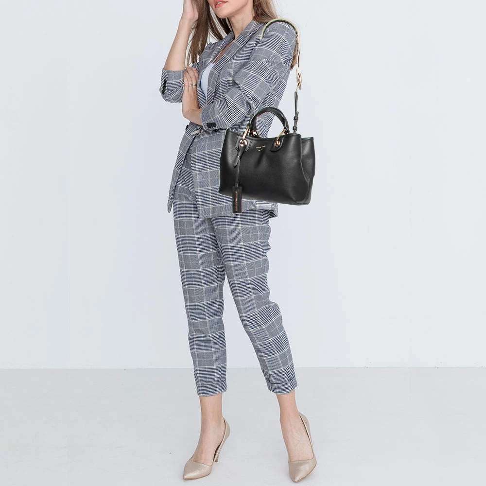 Perfect for work or travel, this Emporio Armani tote is made of leather to be classy and durable. It has short handles, a branded shoulder strap, a brand tag, and a spacious lined interior.