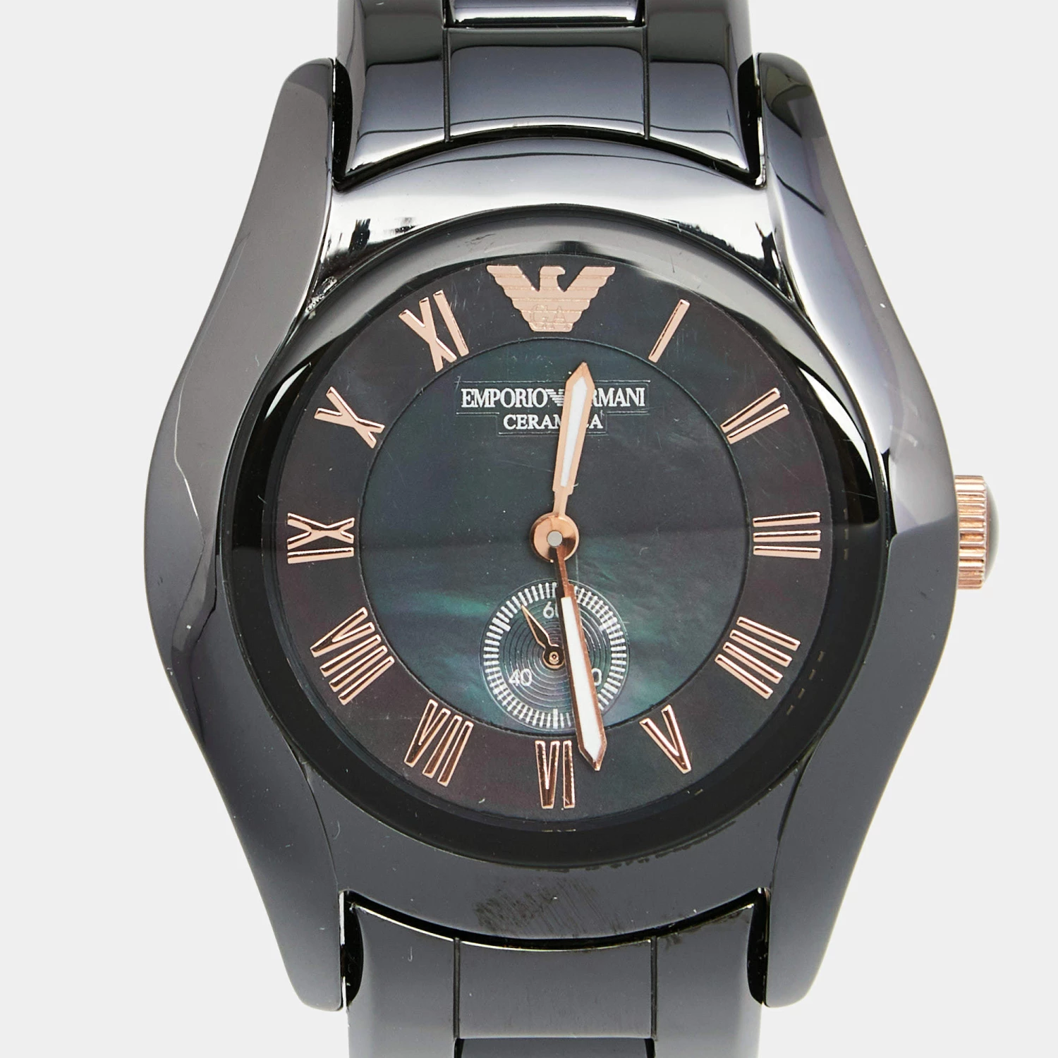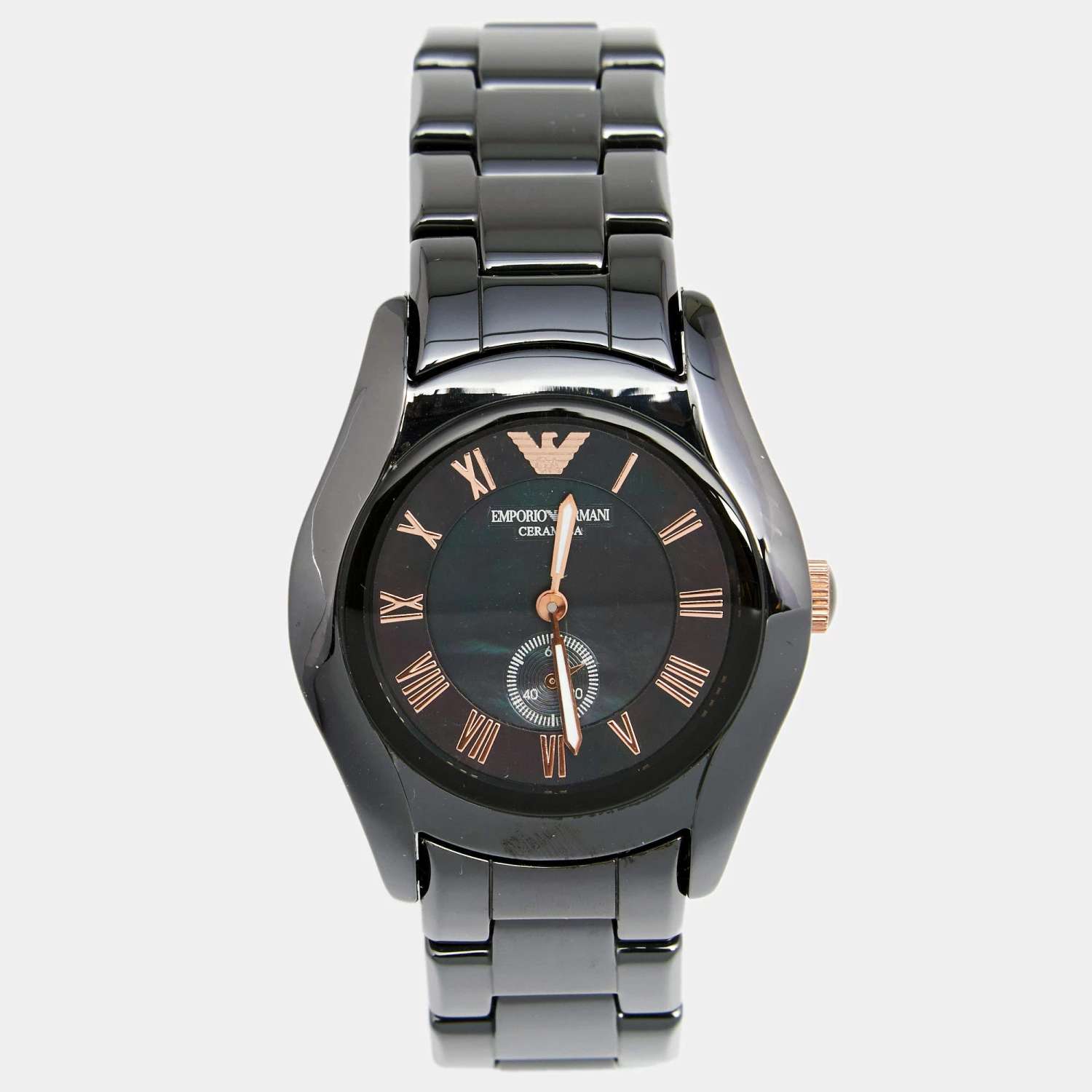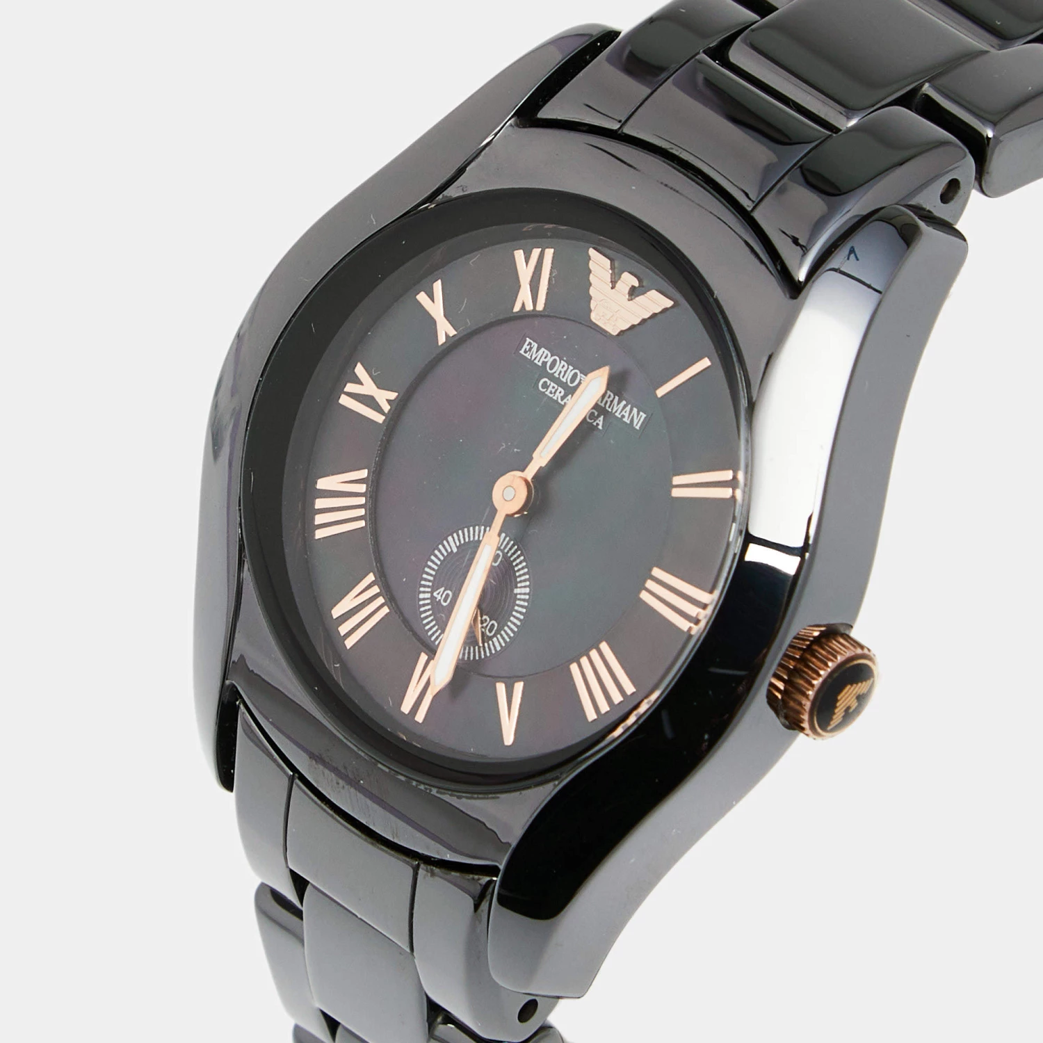 This Emporio Armani quartz watch is an ideal choice for everyday use. Made from ceramic and gold-plated stainless steel, it features a round case set with a Mother of Pearl dial and is held by a comfortable bracelet.