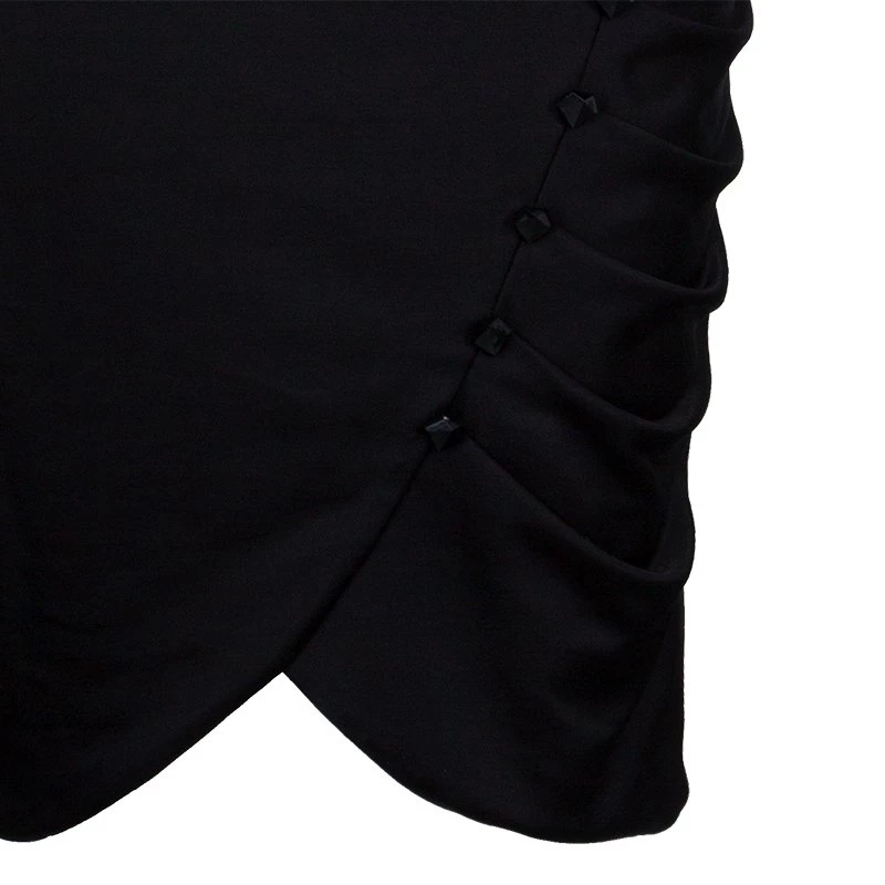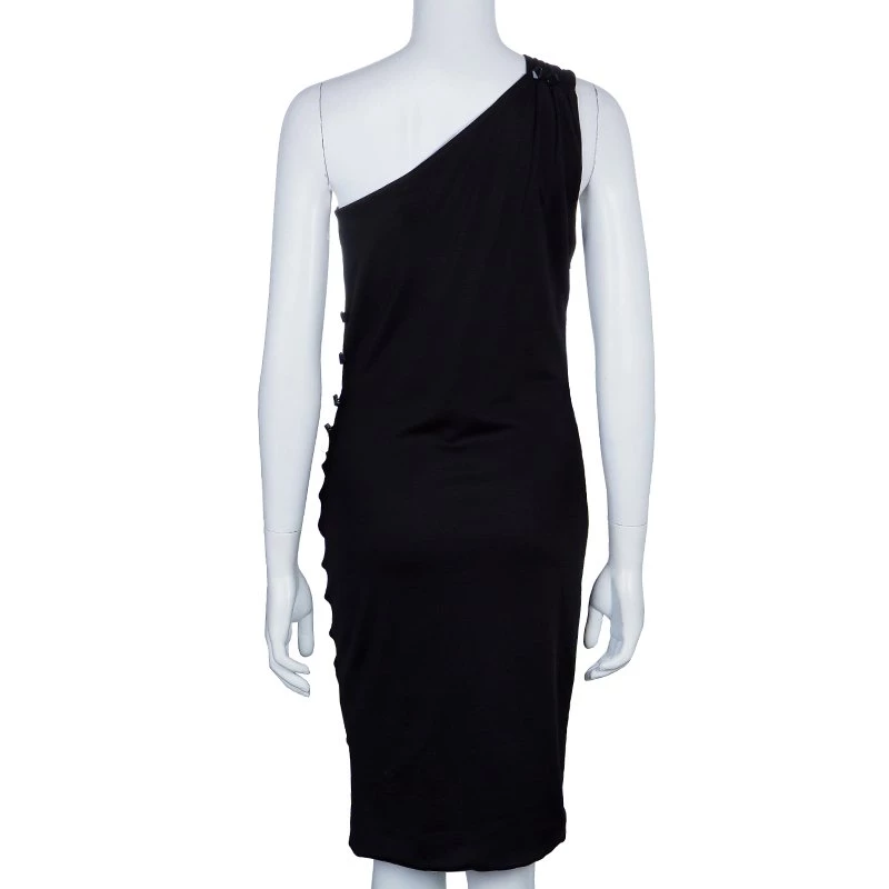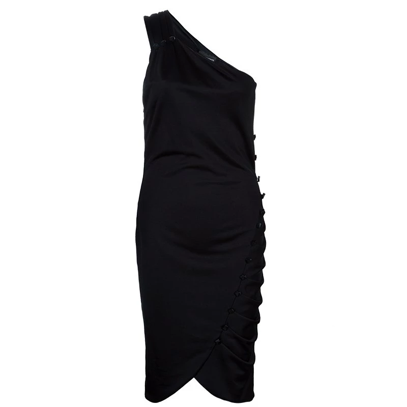 A little black dress to overshadow all others, this piece by Emporio Armani is a stunner. Made from a blend of viscose and elastane, this one shoulder sleeveless dress features button detail along one side of the design giving it an asymmetric hem.