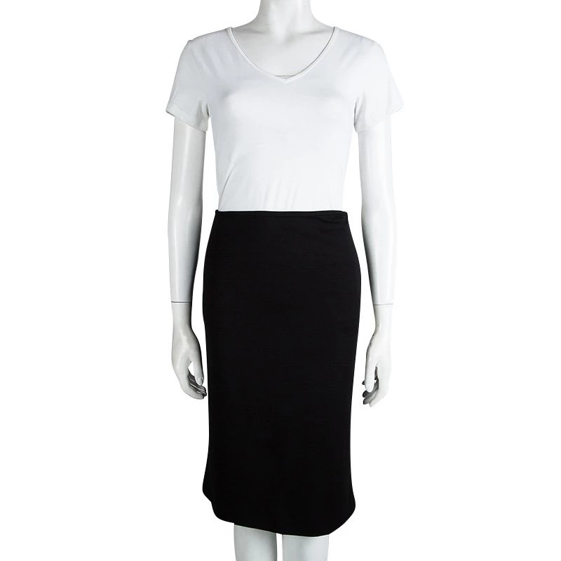 A pencil skirt perfectly accentuates the feminine figure. This Emporio Armani pencil skirt is a versatile addition to any well-edited wardrobe. Impeccably tailored from a black fabric, this skirt comes with a rear zip closure. Wear it to work with a formal shirt or style it off-duty with a ruffled blouse and pumps.