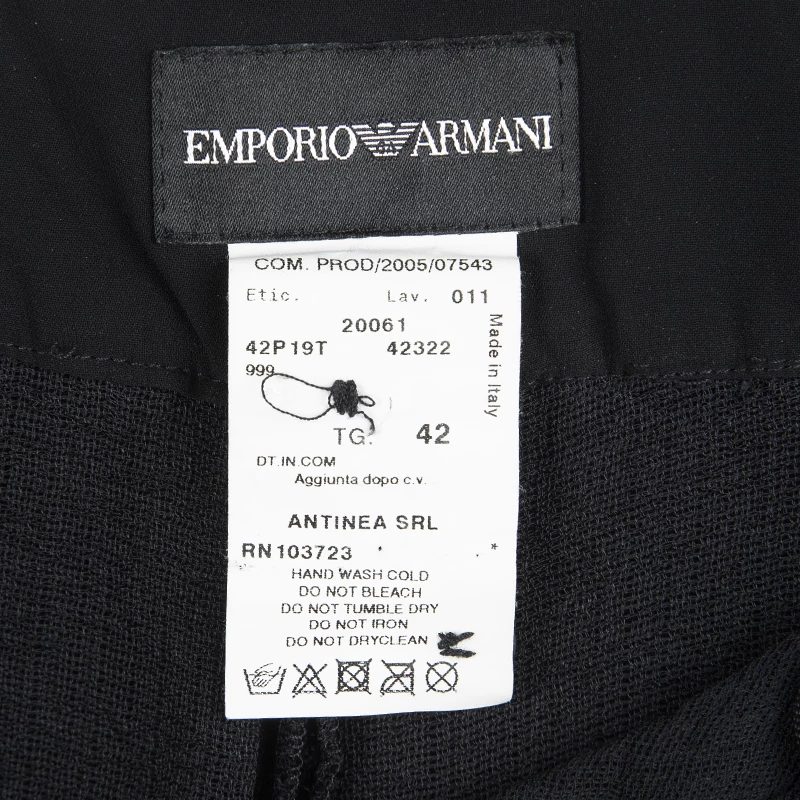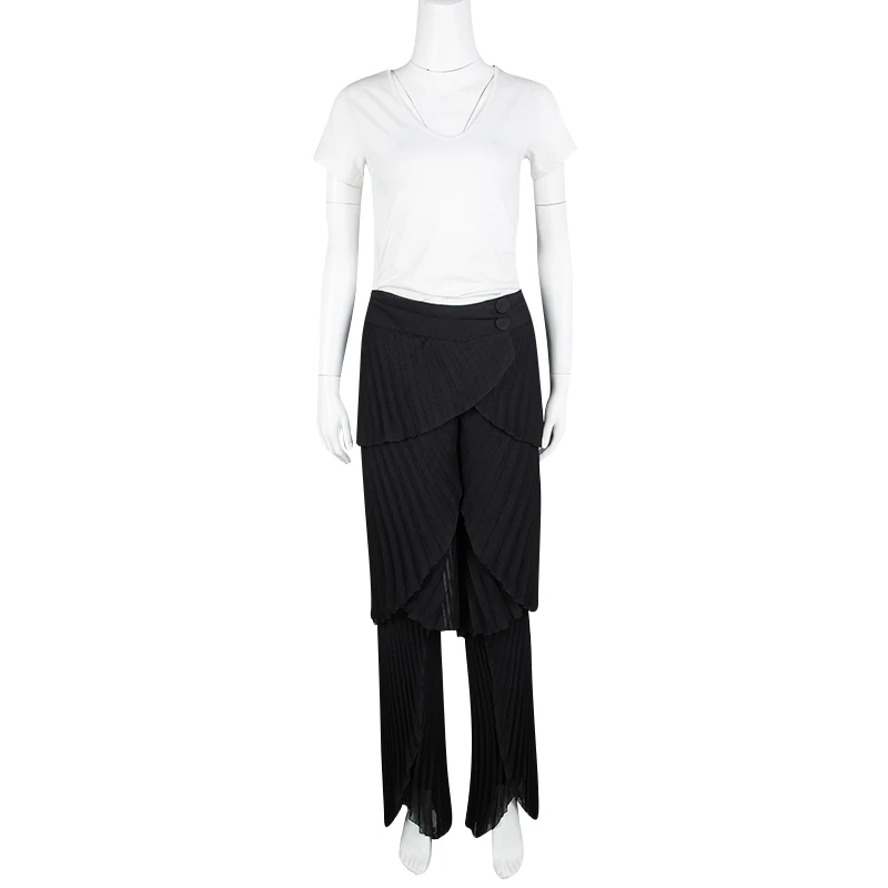 Attain a straight-off-the-runway look with this Emporio Armani pants. Featuring a layered silhouette, these pants are masterfully designed in black plisse that lends it a dramatic touch. It comes with a tonal button closure at the top and features a flap-over style lending it an illusion of a skirt from the top. Focus only on the pants by styling it with a blouse and nude pumps.
