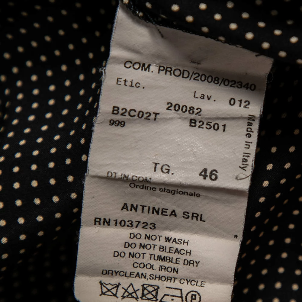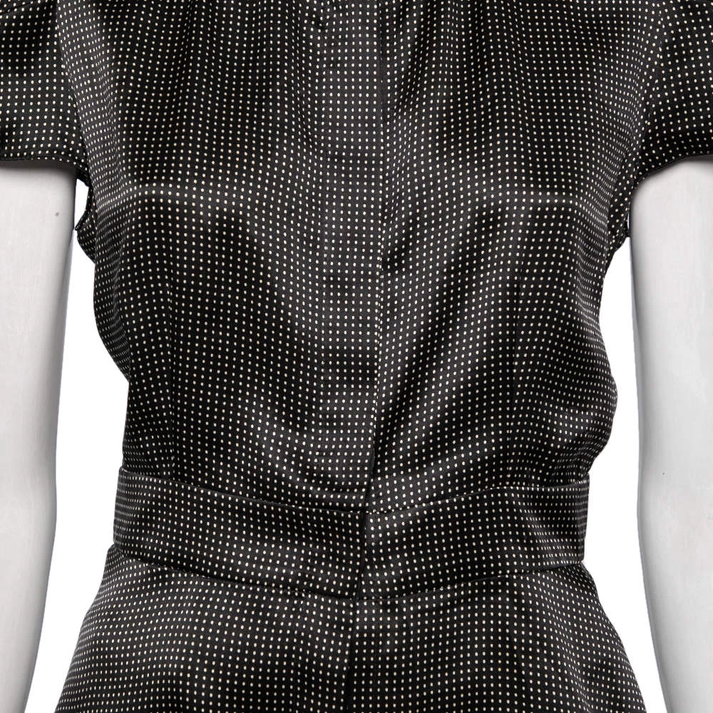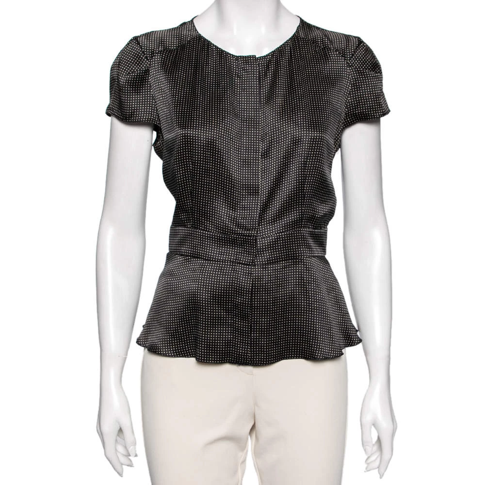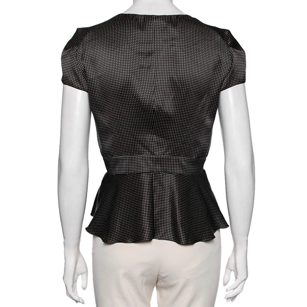 Look chic as you wear this blouse from the House of Emporio Armani. It is styled using black polka-dotted silk fabric and comes with a ruffled hem and cap sleeves. It has a button-type closure. This blouse can be paired with a pair of black trousers for a classy look.