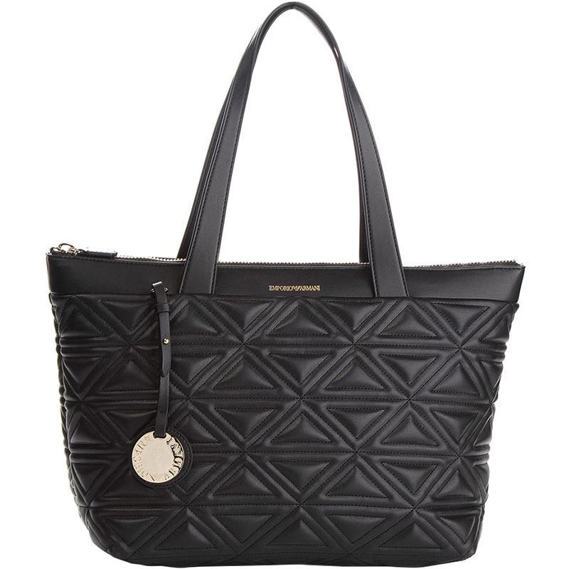 Crafted in black leather, this Emporio Armani bag is designed with a gorgeous quilting pattern on it. It is secured with a top zipper closure and comes fitted with two flat top handles. It comes detailed with gold-tone brand lettering on the outer body and a logo plaque that add to the beauty of this piece. It can easily hold your essentials and much more for the day.