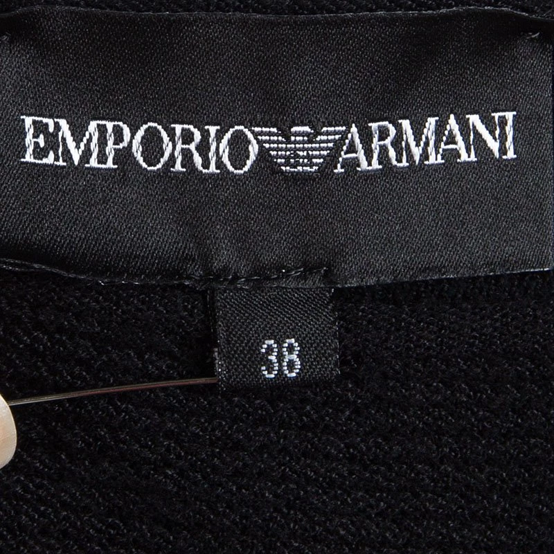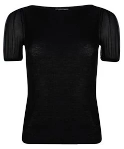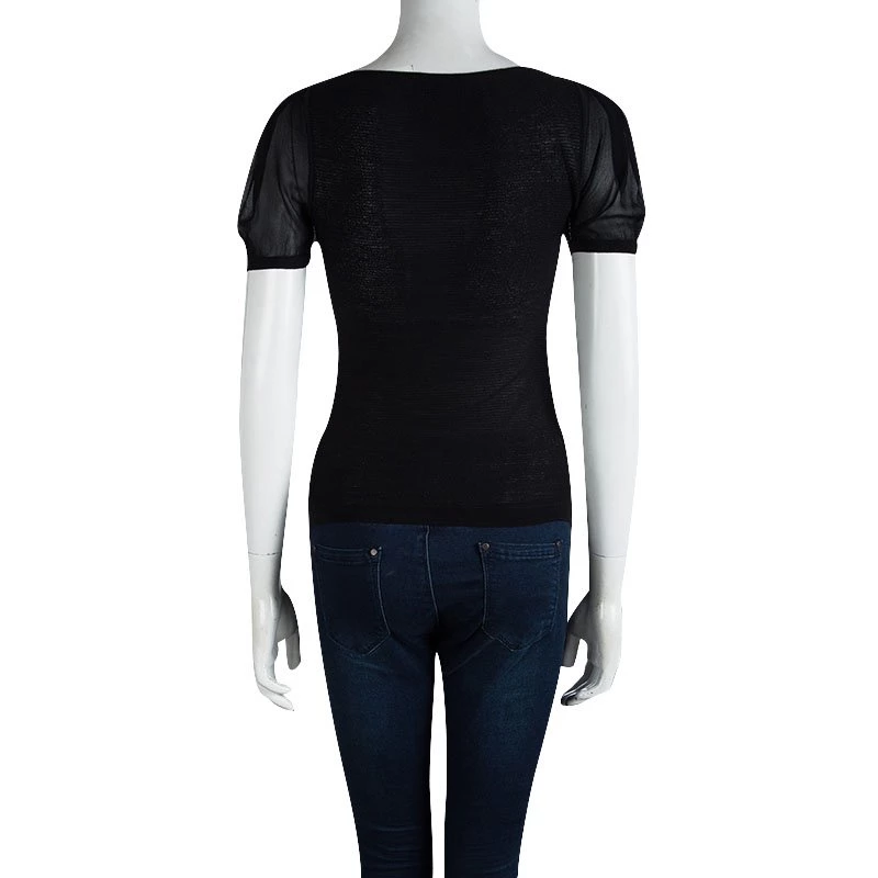 A basic styled top from Emporio Armani is a wardrobe staple. The black rib knit top is designed with short sleeves, sheer puff sleeves, and a broad ribbed hem. Wear it with denim or trousers, this top goes well with any occasion.