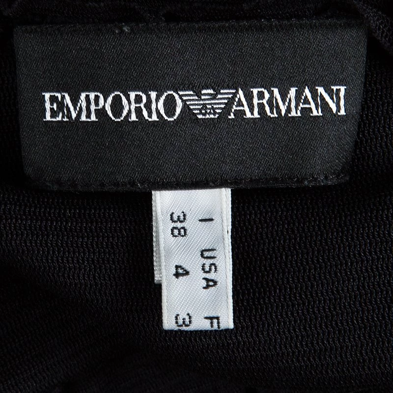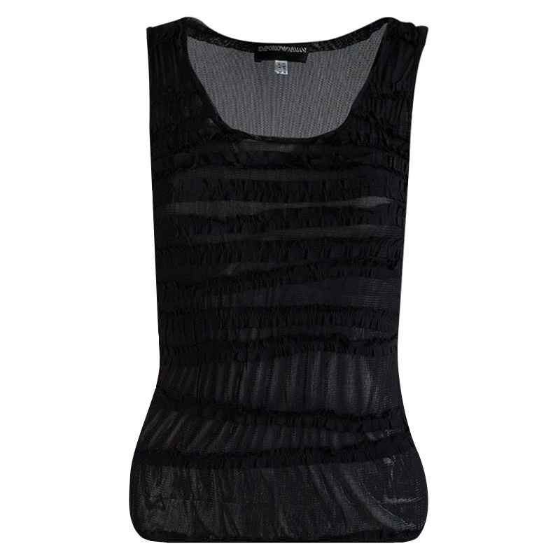 A sheer top from Emporio Armani is great as a separate and for layering. The sleeveless top has front ruffle detail arranged across the bodice. The causal top is versatile owing to its black color. Wear it with denim or trousers.