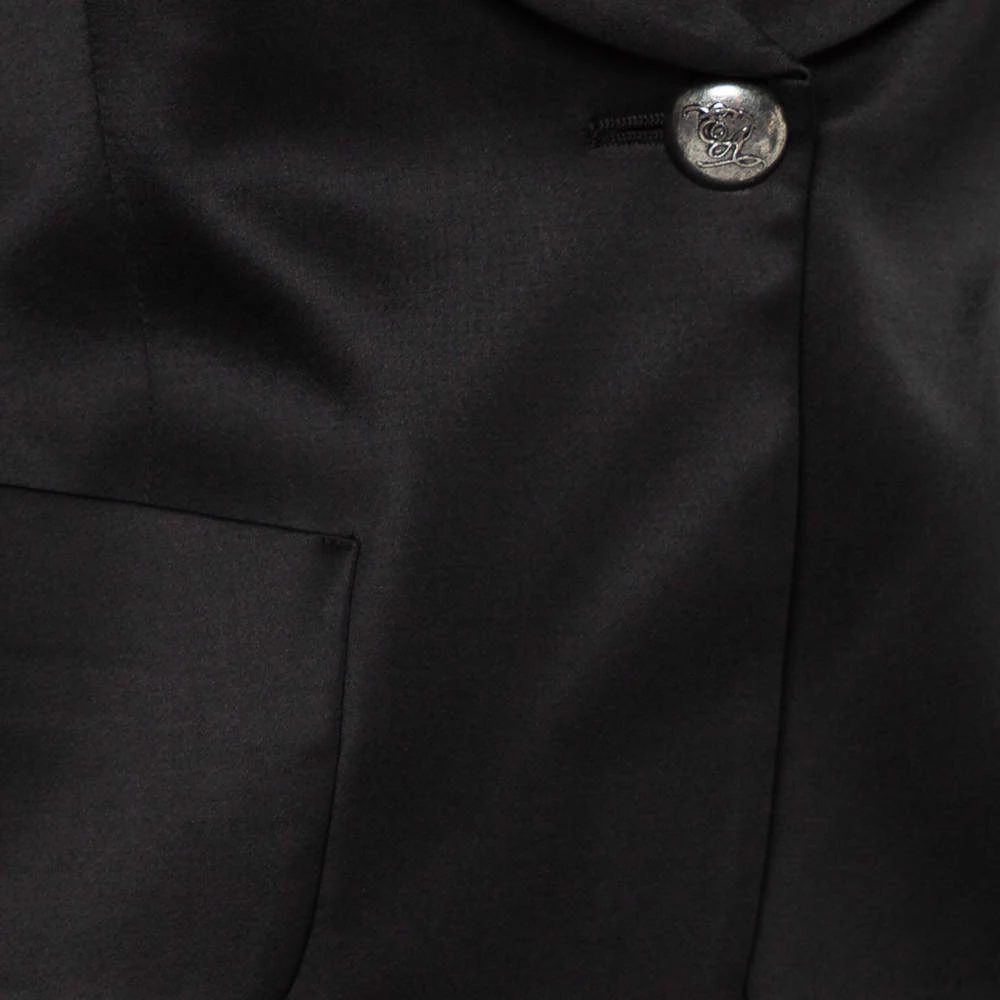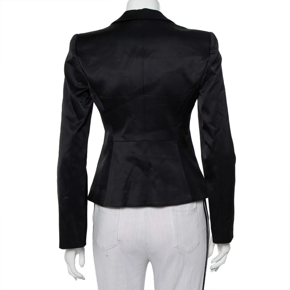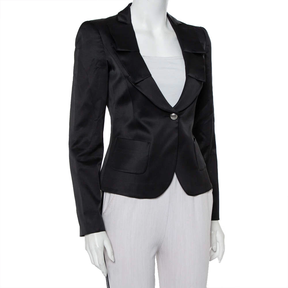 Create a statement look by wearing this contemporary blazer from Emporio Armani. This comfortable and stylish black blazer is designed from sateen and features a smart silhouette with a pleated collar, long sleeves, and pockets. Use this appealing and posh creation to flaunt your stylish look.