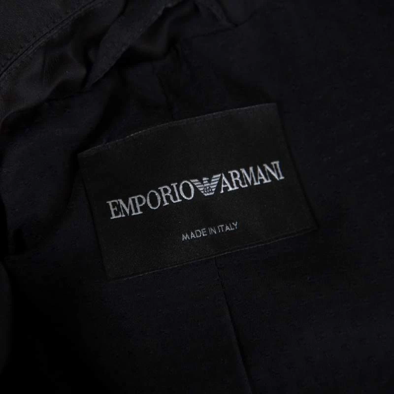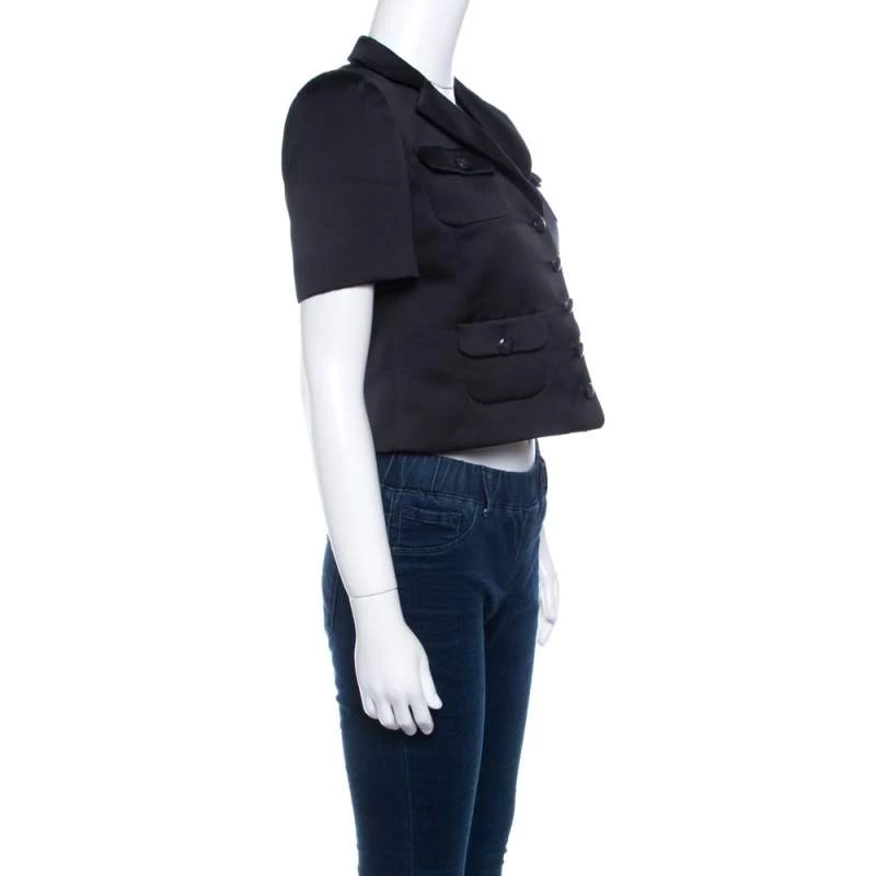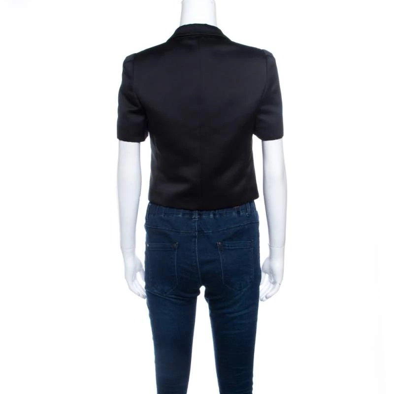 Exuding a satin finish, this cropped jacket by Emporio Armani is a chic formal piece that will look great with your high-waisted skirts. It features multiple flap pockets to the front along with buttoned closure. Tailored in a feminine silhouette, the jacket is complete with short sleeves and notched lapels.