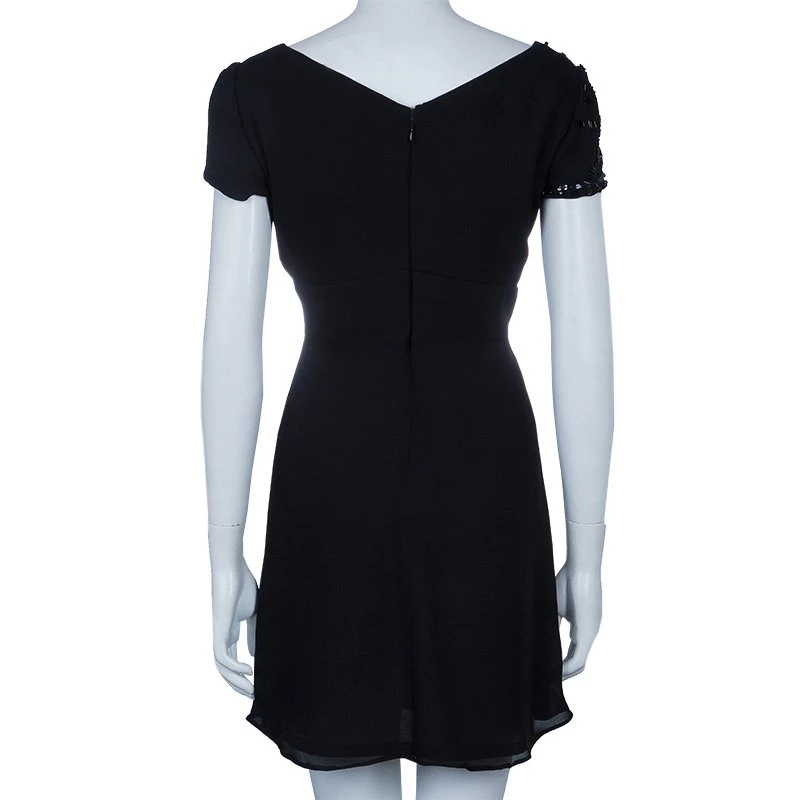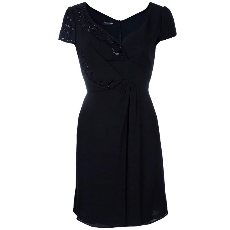 The little black dress comes with a gorgeous twist on this Emporio Armani design. Made from silk, it features a V-neck, short sleeves, and a rear zipped closure. The highlight of this piece is the sequin embellishments that line on the side of the dress.