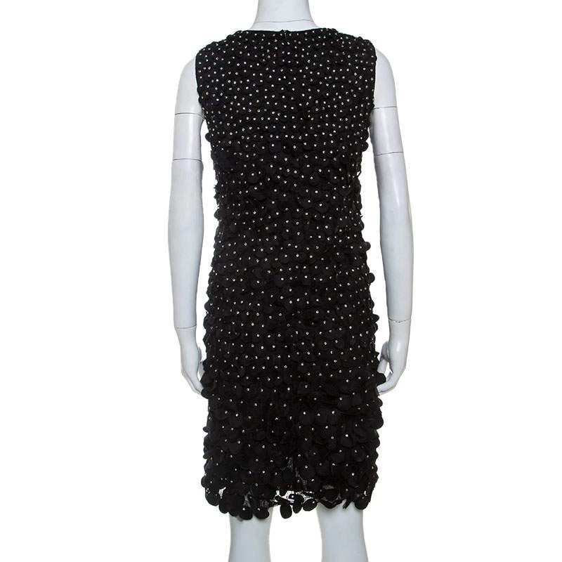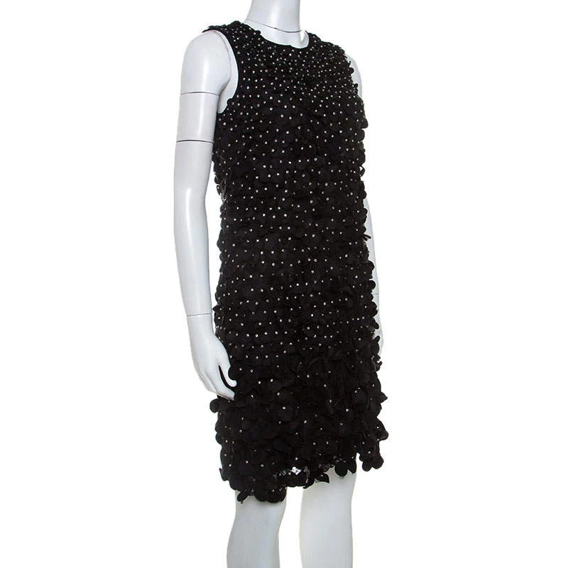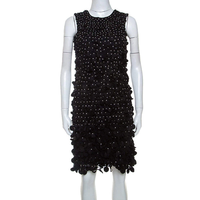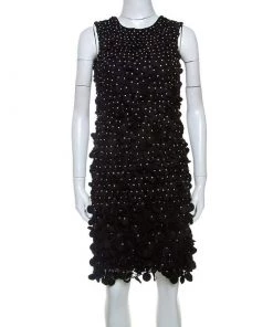 It’s time to glam up your style quotient with this ravishing dress from Emporio Armani. This sleeveless dress shines with beautiful floral appliques and rhinestone embellishments all over. Featuring a round neckline, it comes with a concealed zip closure at the back. Team this comfortable black dress with metallic pumps and a sling bag to make heads turn.
