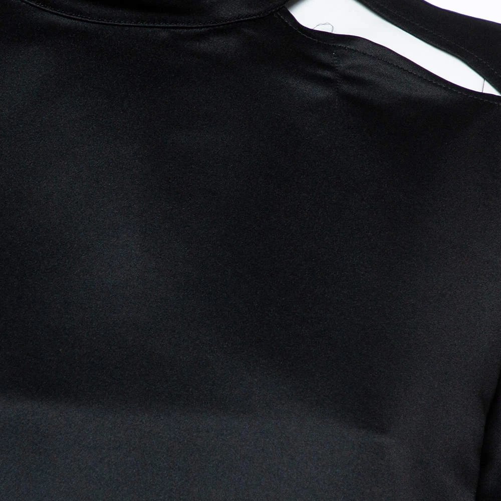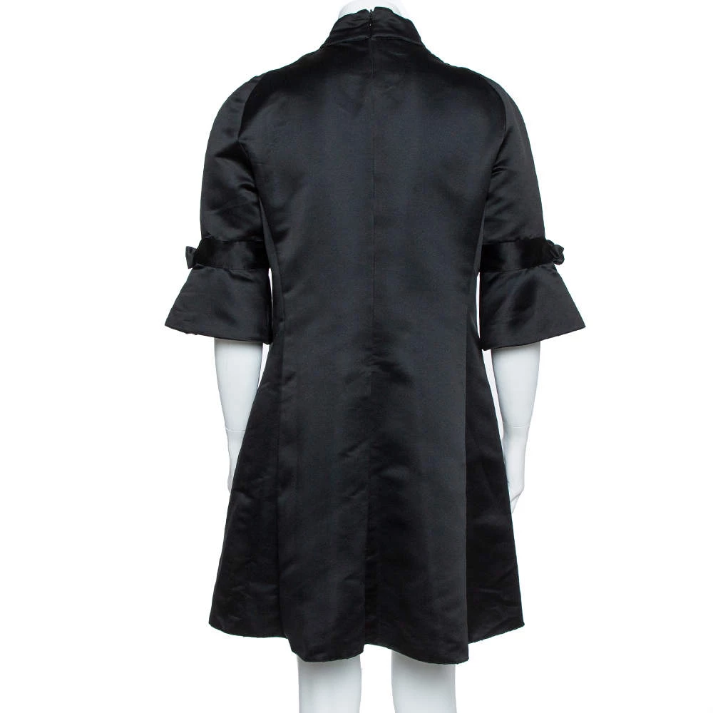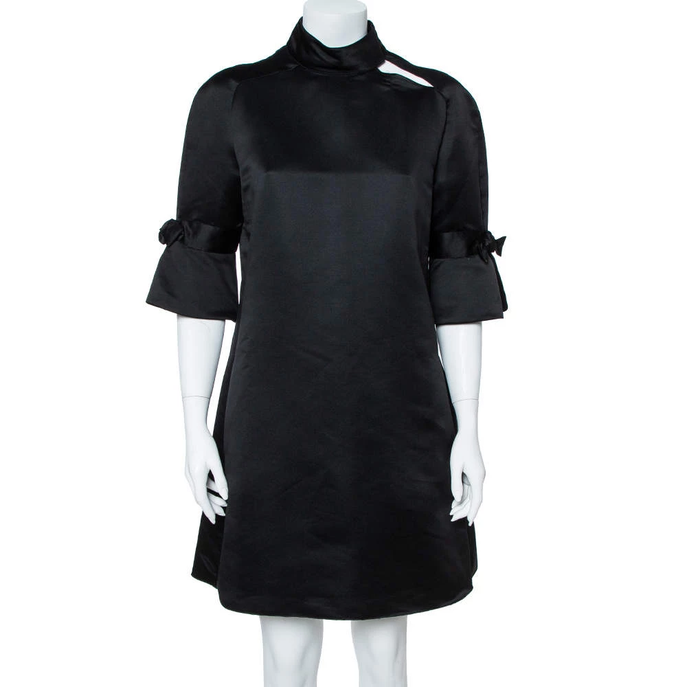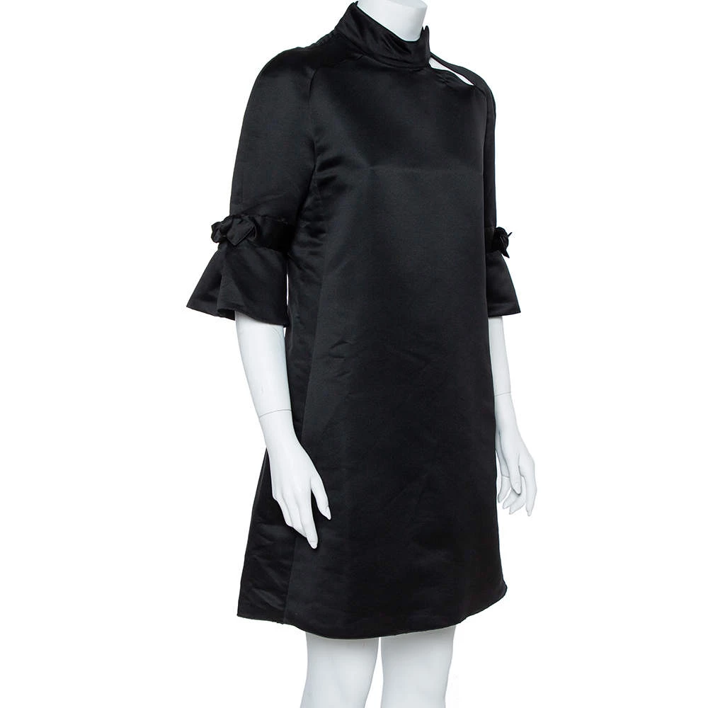 This Emporio Armani dress stands out beautifully. Style this subtle yet elegant piece with dainty accessories for a unique and attractive look. Designed in a feminine midi silhouette, the dress features a classic black hue, a mock neck, bow detailed sleeves, and zip closure at the rear.
