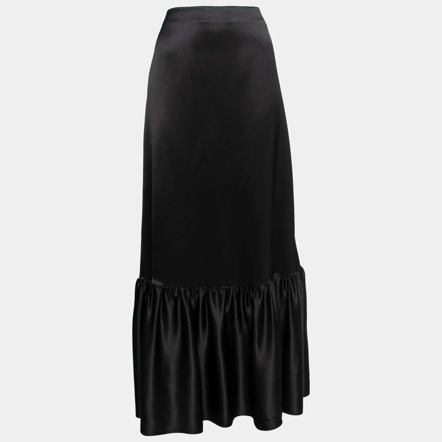 Make a fashion statement as you wear this skirt from the House of Emporio Armani. It is tailored using black silk satin fabric, which is highlighted with a ruffled hem. This skirt can be secured by a zipper fastening.