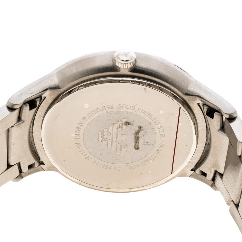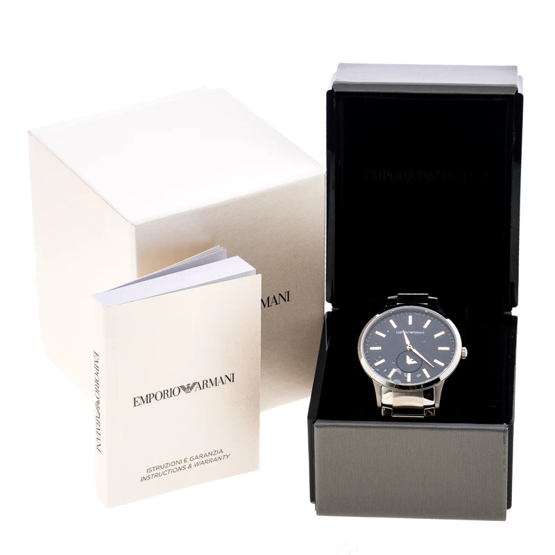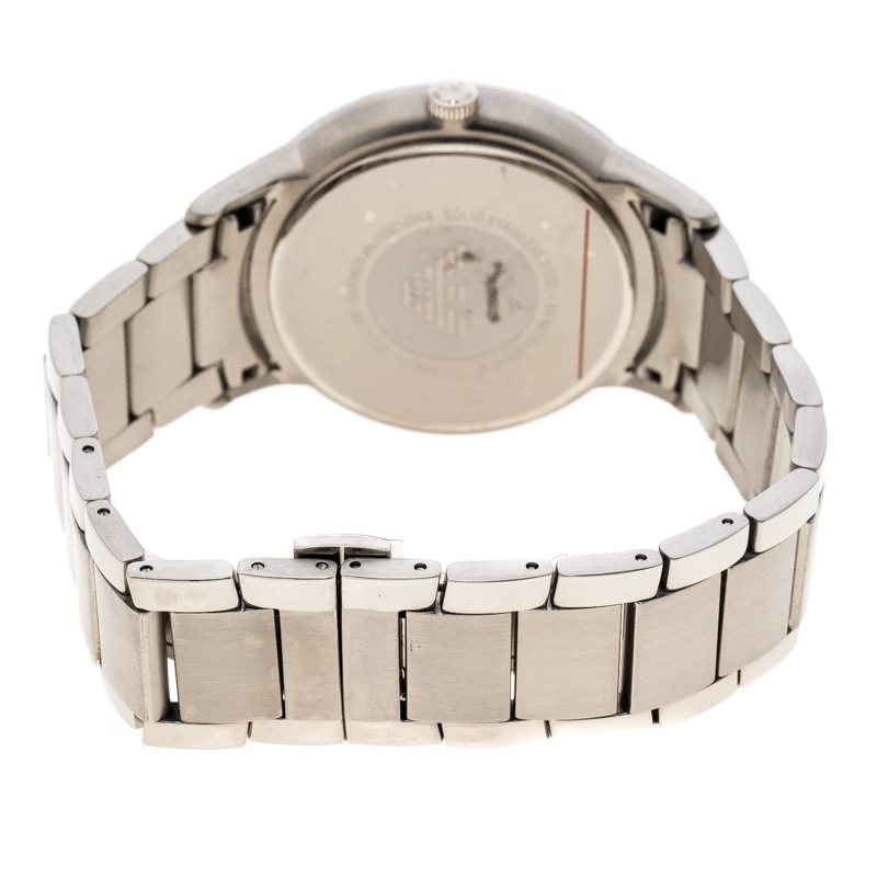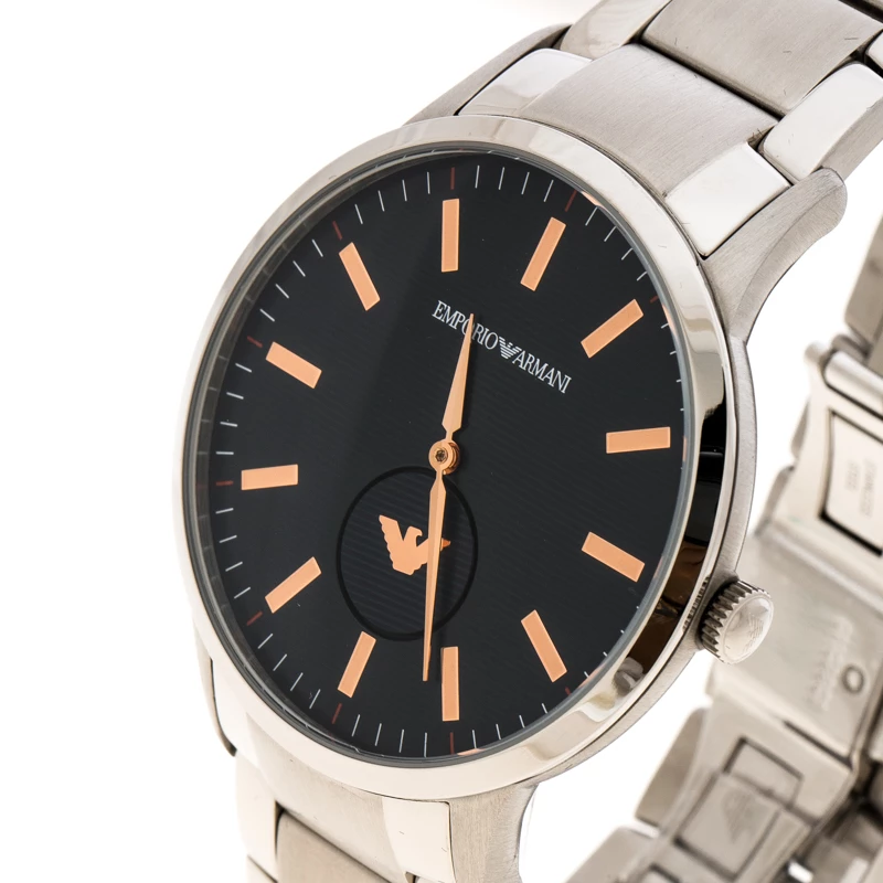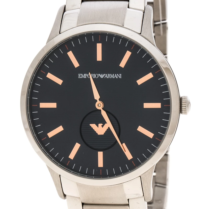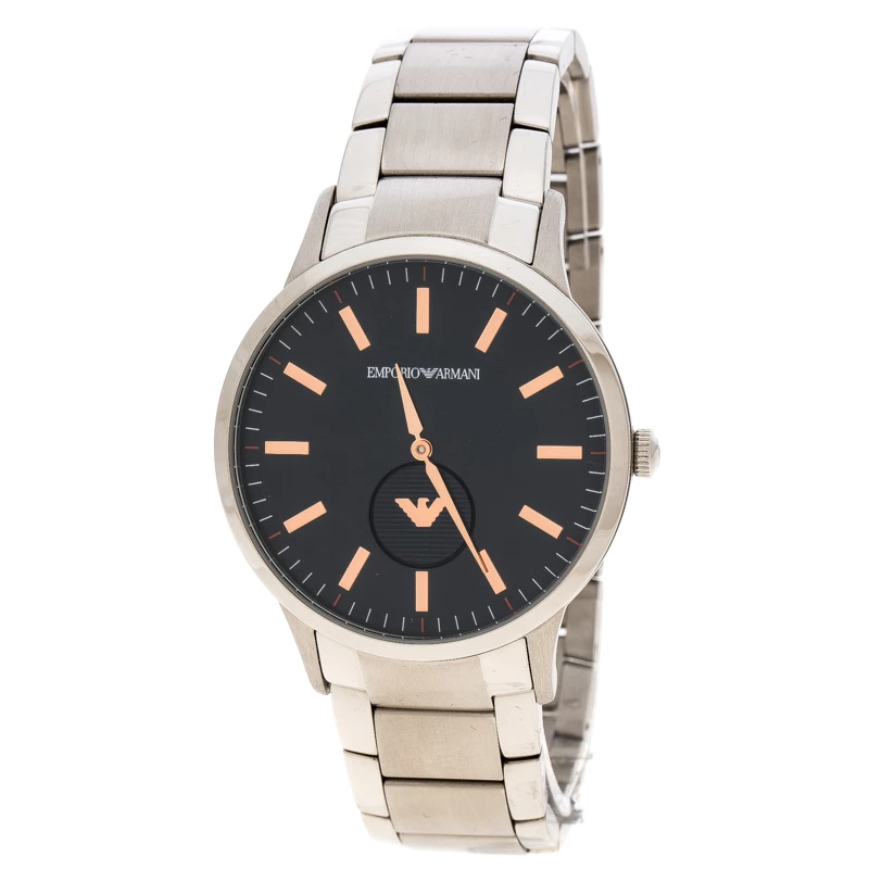 Set to shine on your wrist, this Emporio Armani watch comes in a delighting gathering of the finest features. It has been wonderfully crafted from stainless steel and designed with a smooth bezel. The mineral glass protects a black dial that has index hour markers and minute markers around the outer rim. Lastly, the creation is topped by a water resistance of 50 meters and held by a bracelet with a buckle clasp.