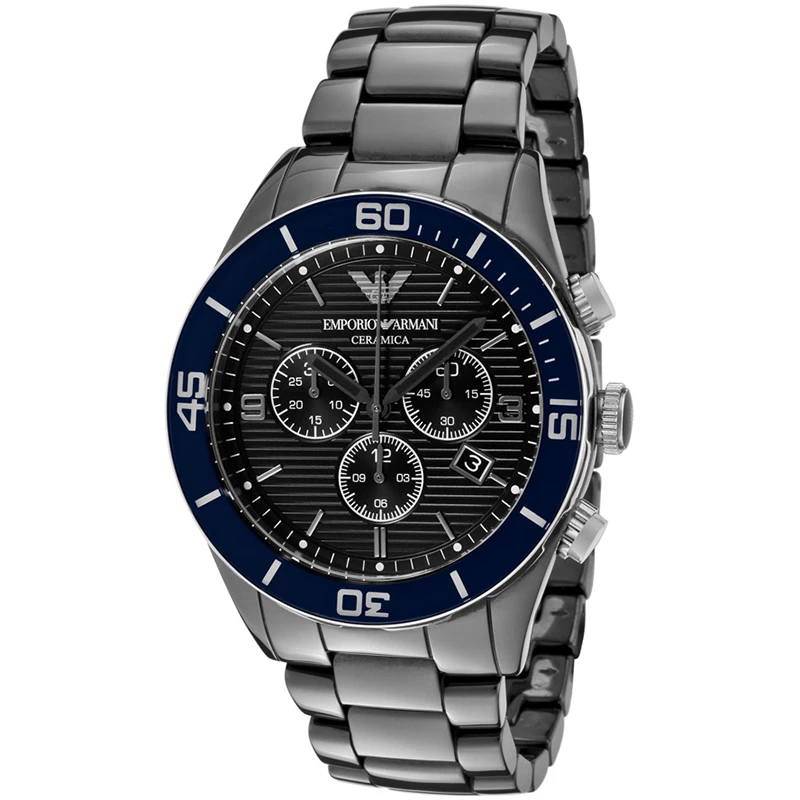 Masculine and sophisticated, this Emporio Armani AR1429 piece is a class apart in watches. Its ceramic case holds a blue bezel with a Tachymeter and Arabic numerals in silver. Its bold design comes with a black striped dial, a date window, elegant hands and three chronometers. This luxurious watch has a 50M water resistance level and a quartz movement. Its ceramic bracelet is coupled with a hidden clasp closure.
