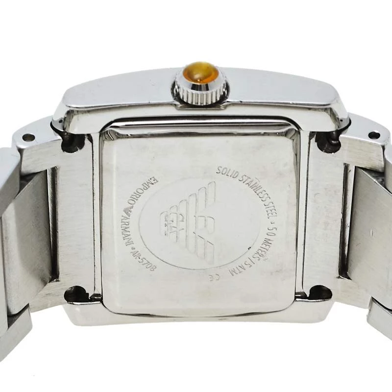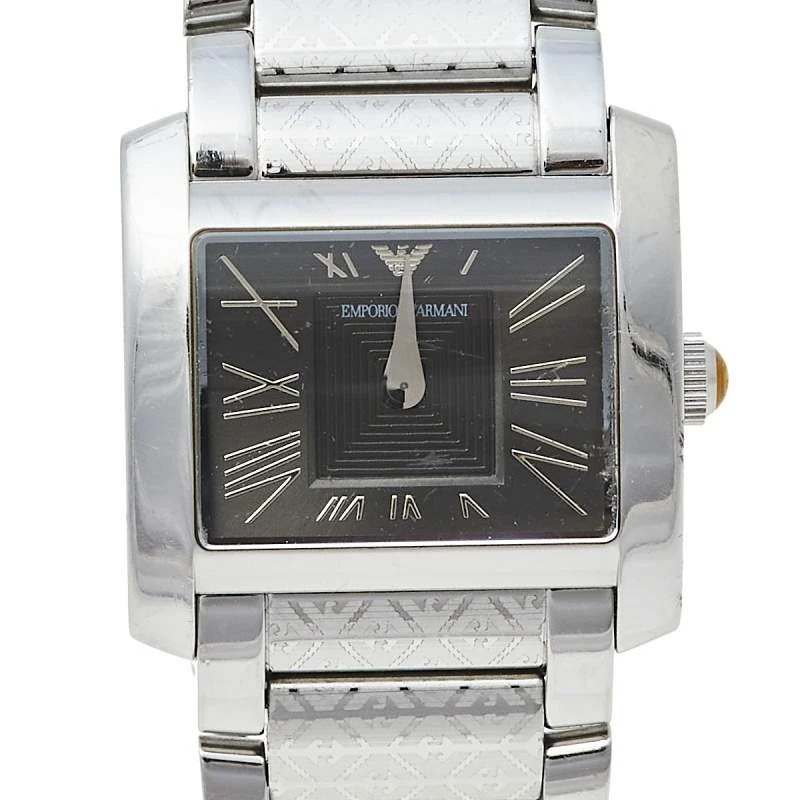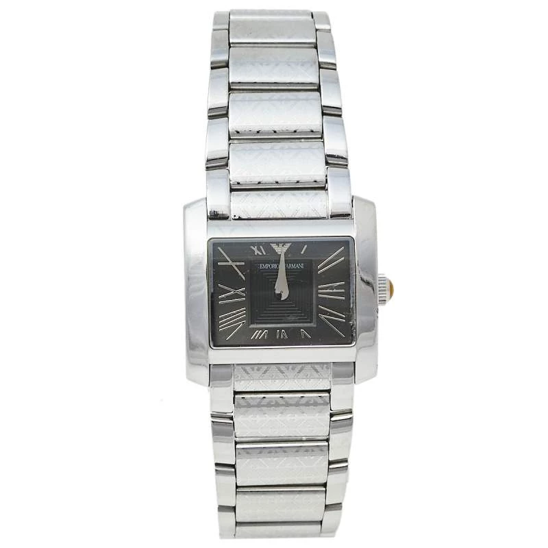 Elegance meets sporty style with this casual Emporio Armani wristwatch. This timepiece features a stainless steel case with a smooth bezel. The refined black dial houses Roman numeral hour markers and two hands. The link bracelet is secured by a push-button locking clasp. This quartz watch is complete with 50 meters of water resistance.