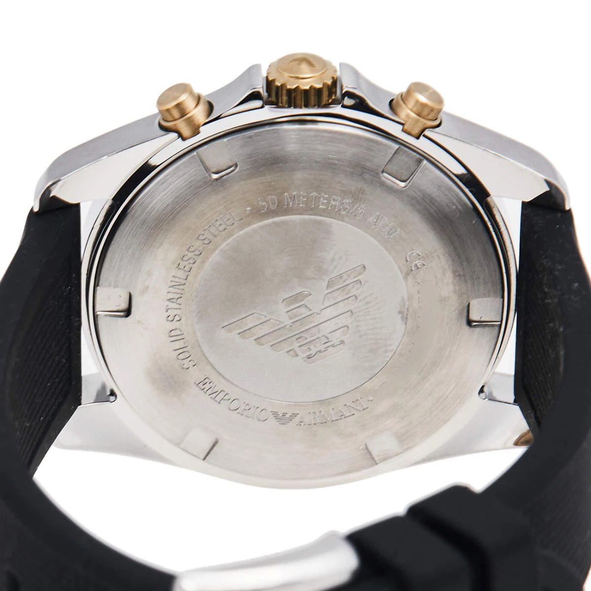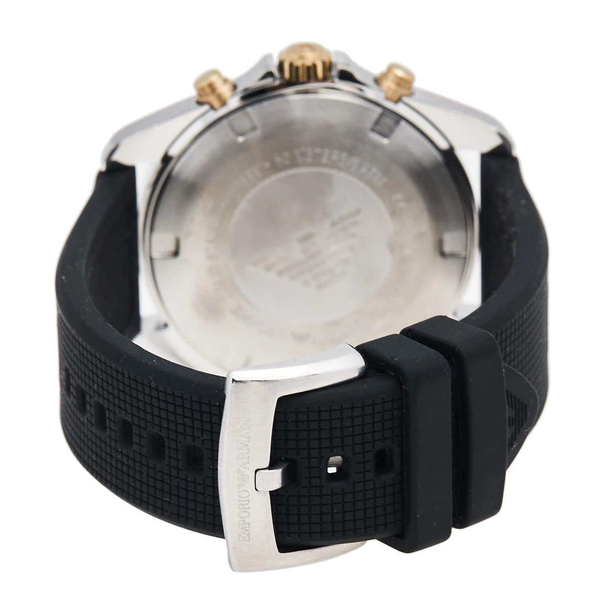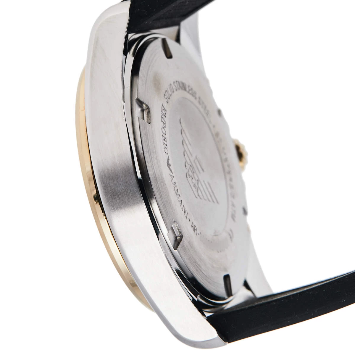 Make the right style choice with this timepiece from Emporio Armani. The watch is made from two-tone stainless steel and the black dial is set with luminous markers, three hands, three sub-dials, and a date window. The bezel is graced with a tachymeter feature and the case is held by a rubber bracelet.