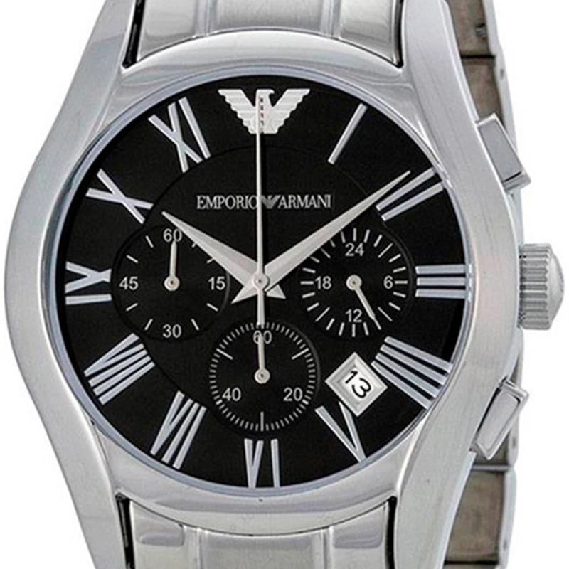 Looking for a classic everyday watch? this Emporio Armani watch has been crafted from a luxurious stainless steel body with a case diameter of 43mm. It comes fitted with a rounded black dial detailed with silver-tone hands, Roman numerals, three sub-dials, a date window between the four and five o’ clock position and the brand logo at the 12 o’ clock aperture. This quartz-powered watch comes fitted with a bracelet strap and secured with a clasp closure.