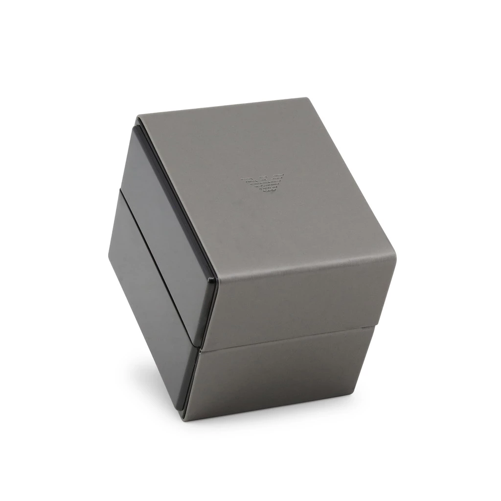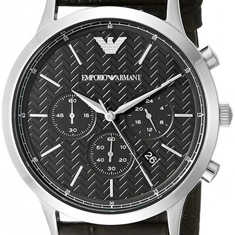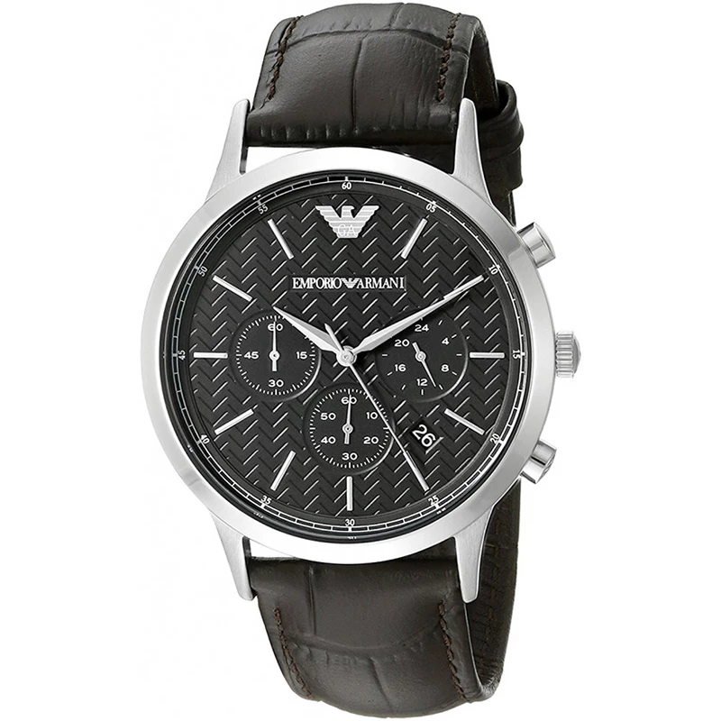 Coming from the house of Emporio Armani, this Chronograph watch has been designed expertly from a stainless steel body with a case diameter of 43mm. It features a rounded black dial detailed with sleek hands and markers, a date window between the four and five o’ clock position and powered by a quartz movement. This watch comes fitted with a textured leather strap with a buckle closure.