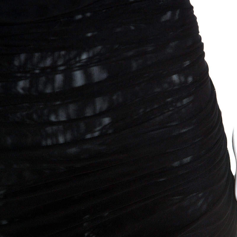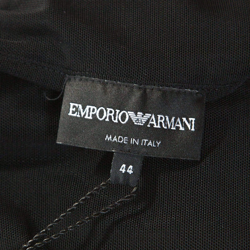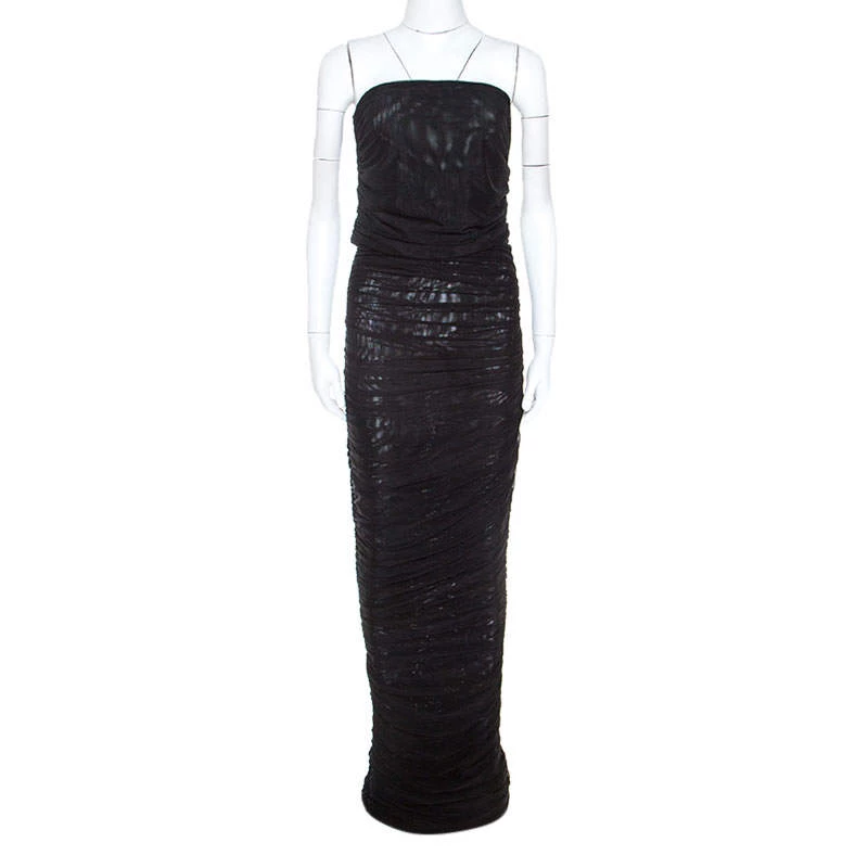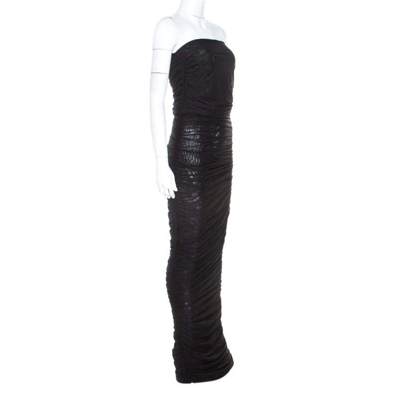 Pick this stunning dress by Emporio Armani for an evening and see how it transforms you. The elegant dress carries a simple strapless silhouette that is enhanced by a ruched detailing throughout. The dress is made from a comfortable blend of fabrics that are meant to flatter. This evening gown comes in a classic black and has a subtle sophistication to it.