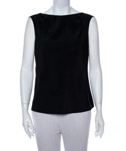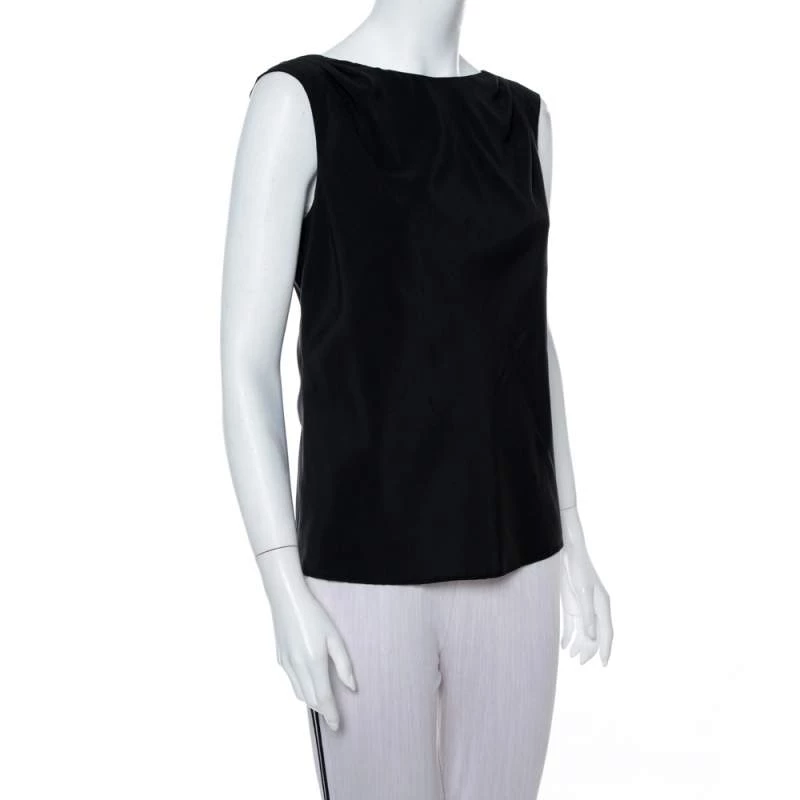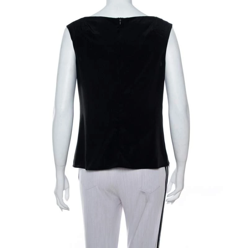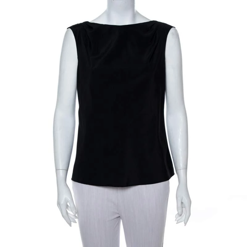 Design and quality come together in this top from the house of Emporio Armani. This classic black top is rich, elegant, and fits any occasion perfectly. The silk top can easily be tucked in with your skirts and teamed with your suits.