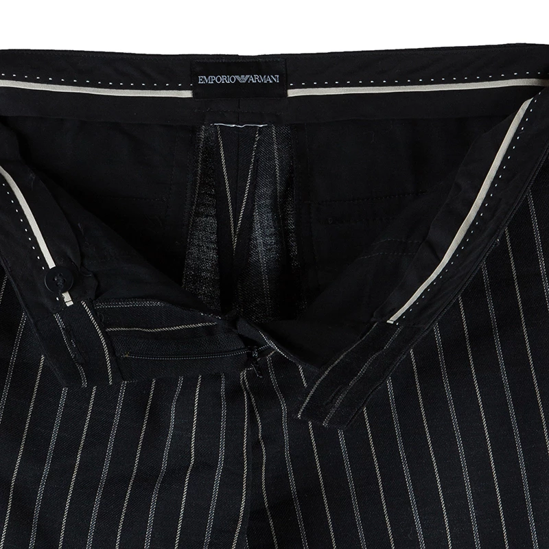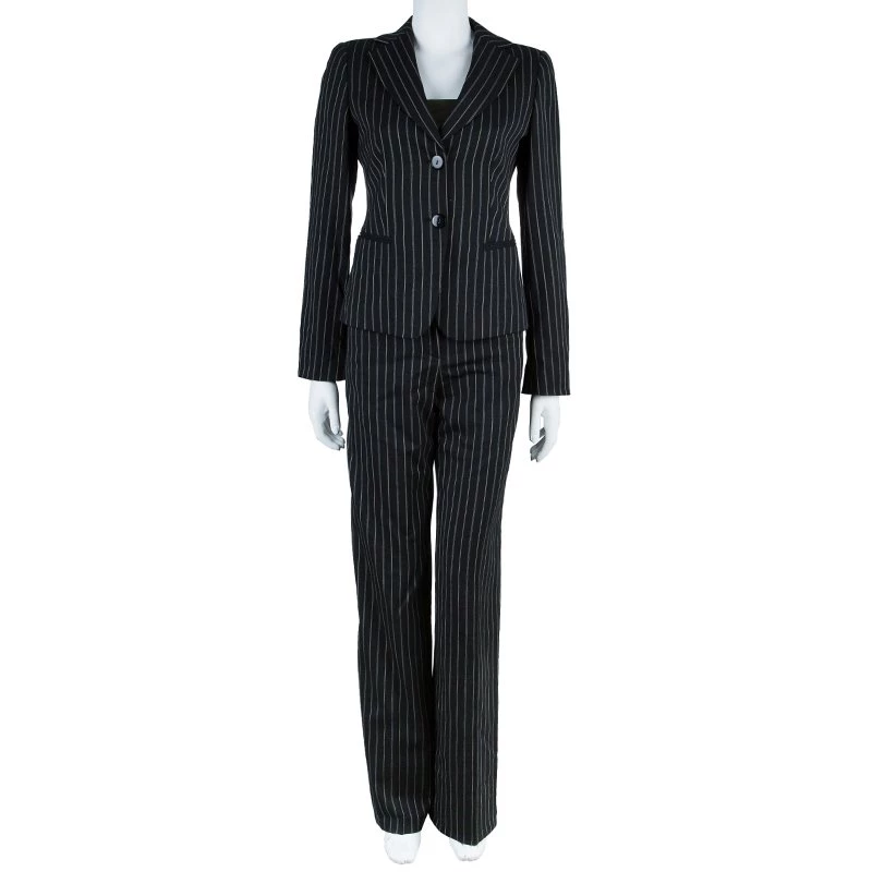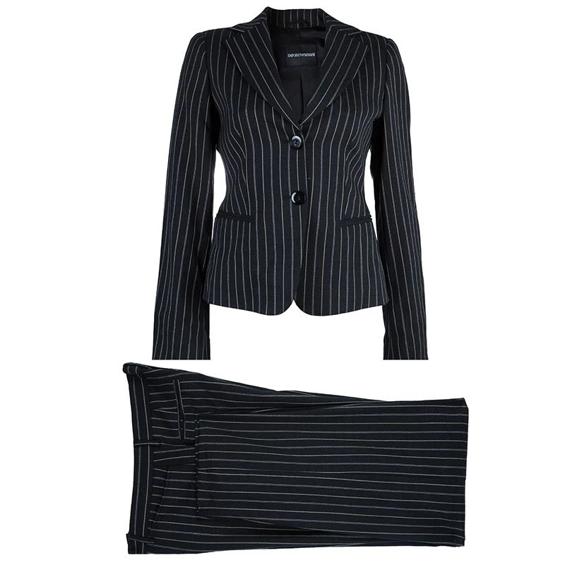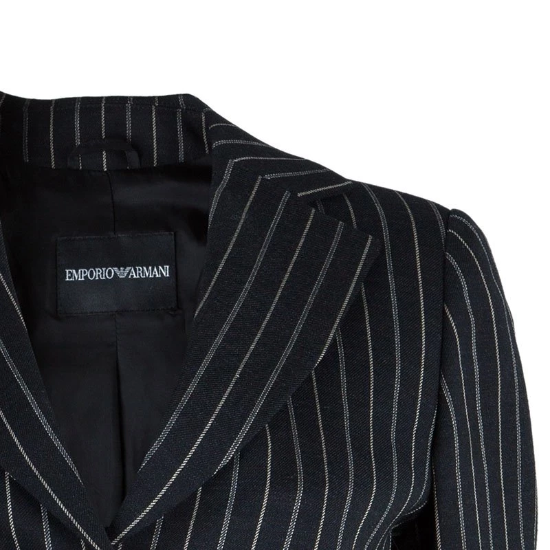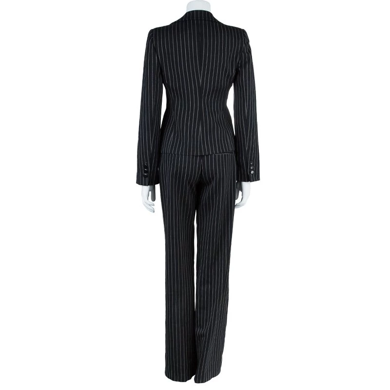A stunning piece, this Emporio Armani suit will be your stylish companion in your formal meetings. This pant suit comes crafted in black and white srtiped virgin wool. The jacket features lapel collars with a button fastening and comes with front pockets. The matching pants are cut in a relaxed straight cut and are equipped with front zip fly and a button fastening.