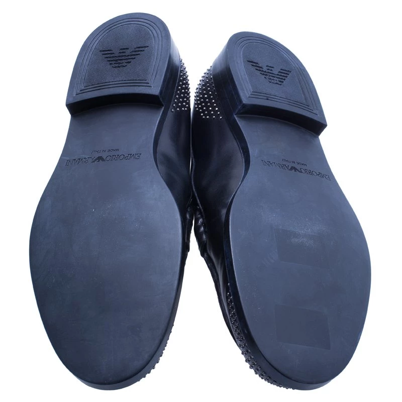 These stylish Penny loafers by Emporio Armani will never disappoint you at any occasion. The black Penny loafers are crafted from leather and flaunt silver-tone studded details on the front and back. It is a classy choice for exclusive events or to pair with suits and blazers.