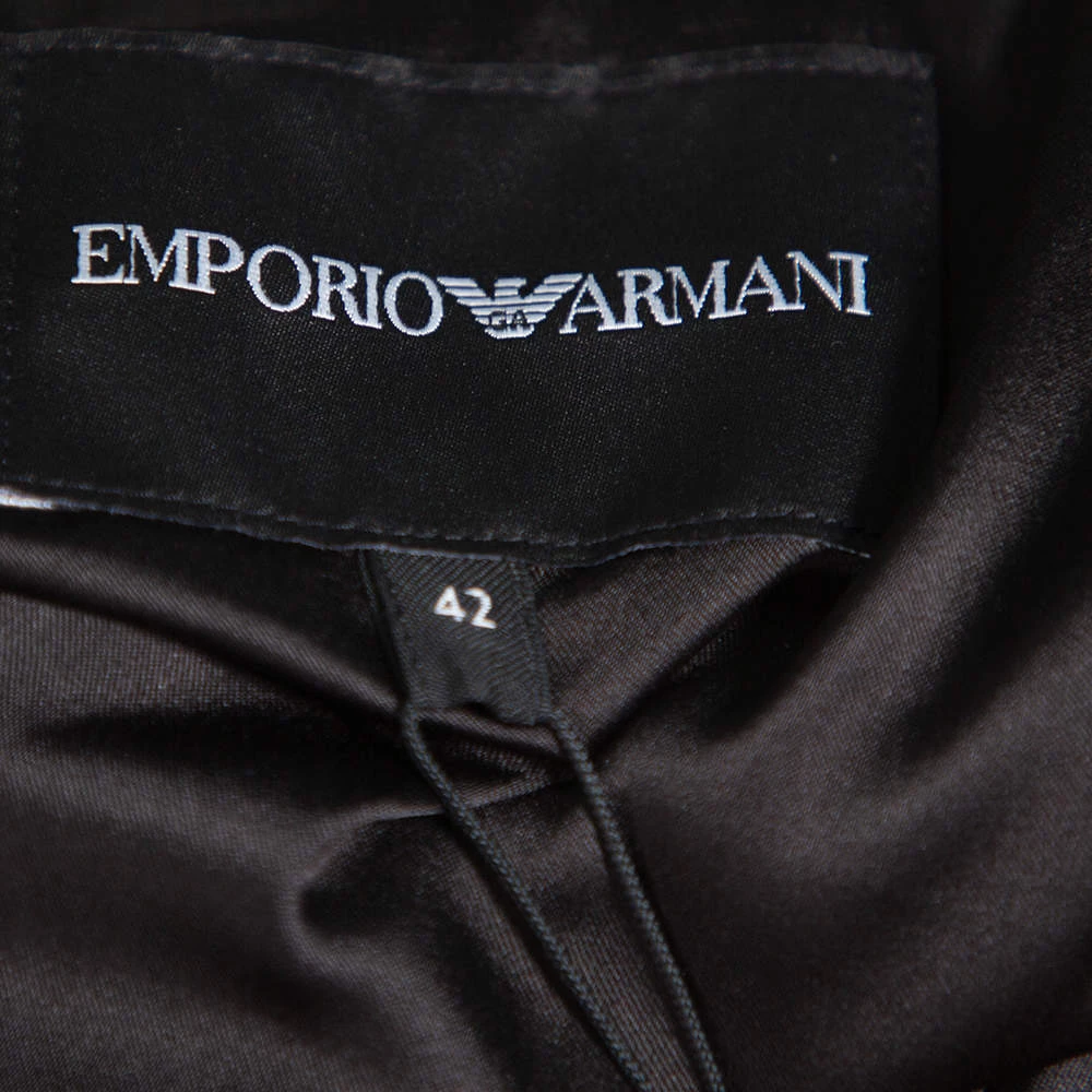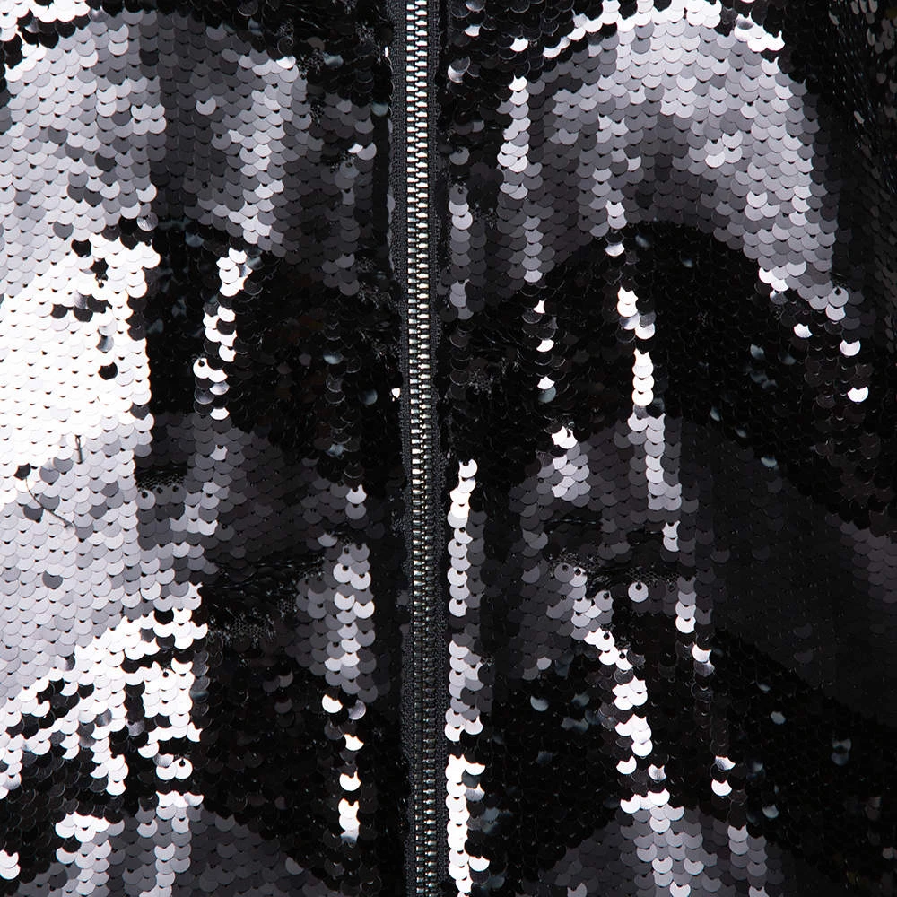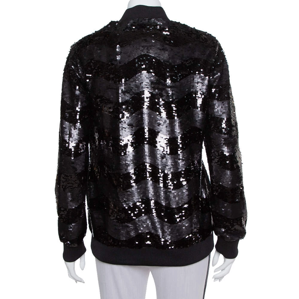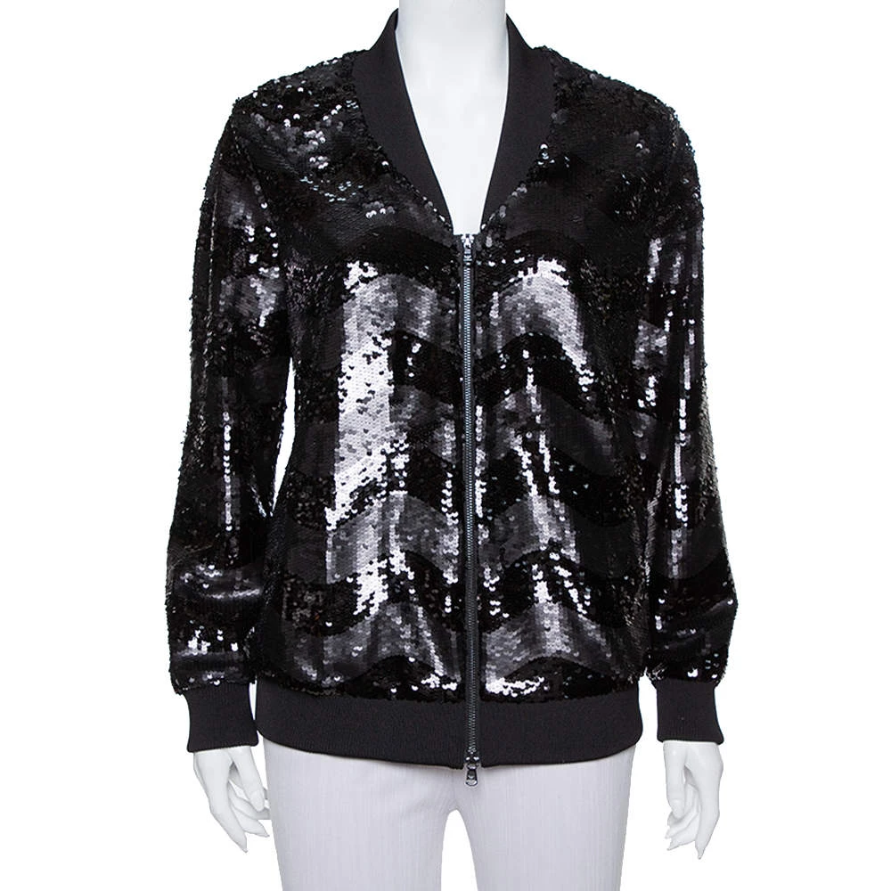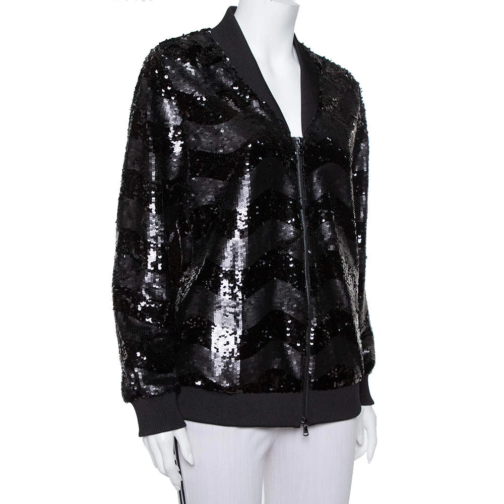 Complete a luxe look by wearing this charming bomber jacket by Emporio Armani. Designed for women, the jacket is embellished with sequins and they form wavy stripes all over. The long-sleeved creation is complete with a comfortable lining and front zip closure.